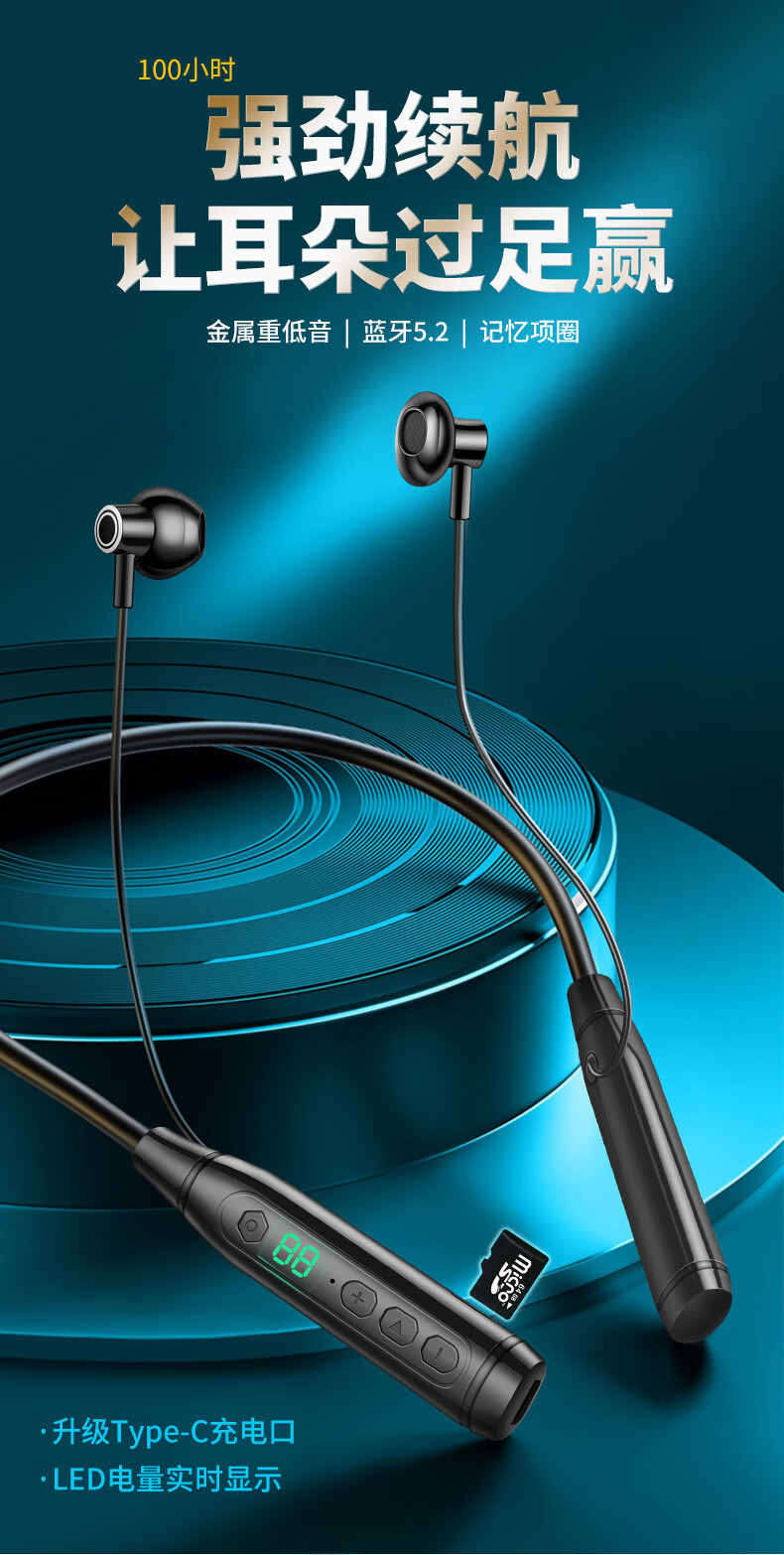 麦拉森【精选直发】挂脖式运动无线蓝牙耳机超长续航2023新款适用华为苹果vivo 绿色