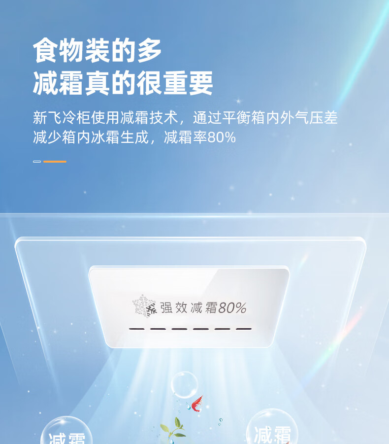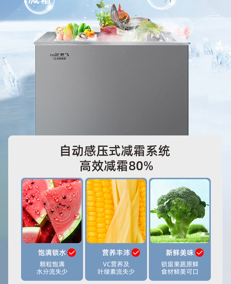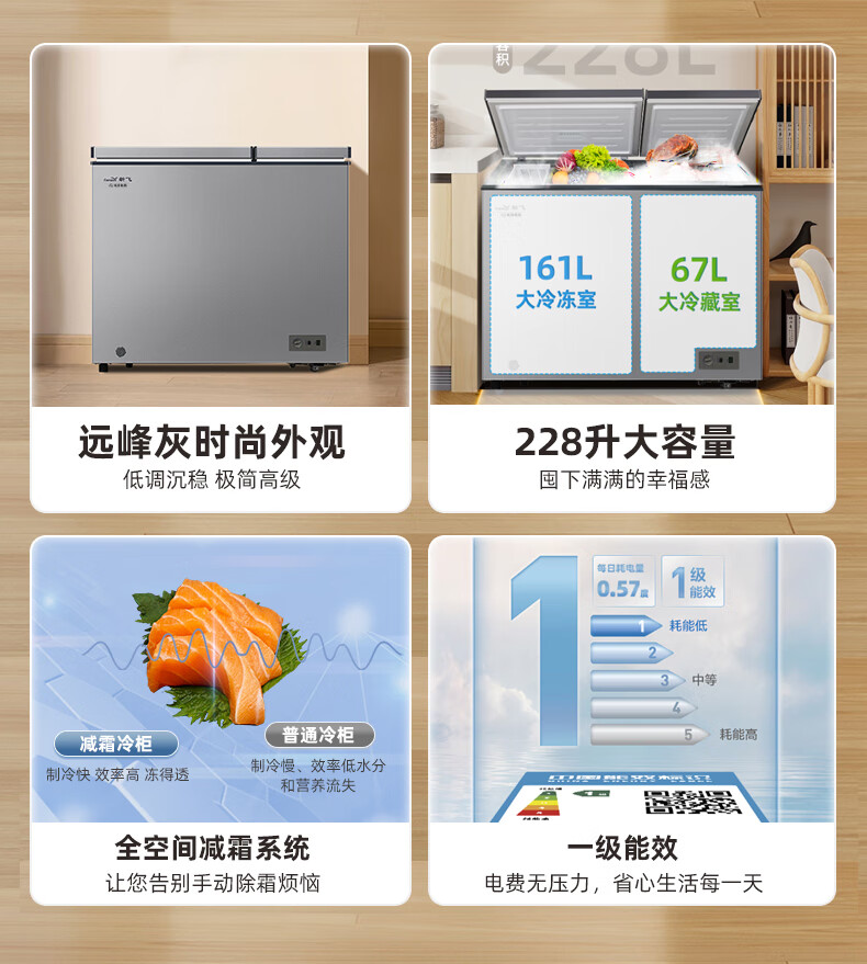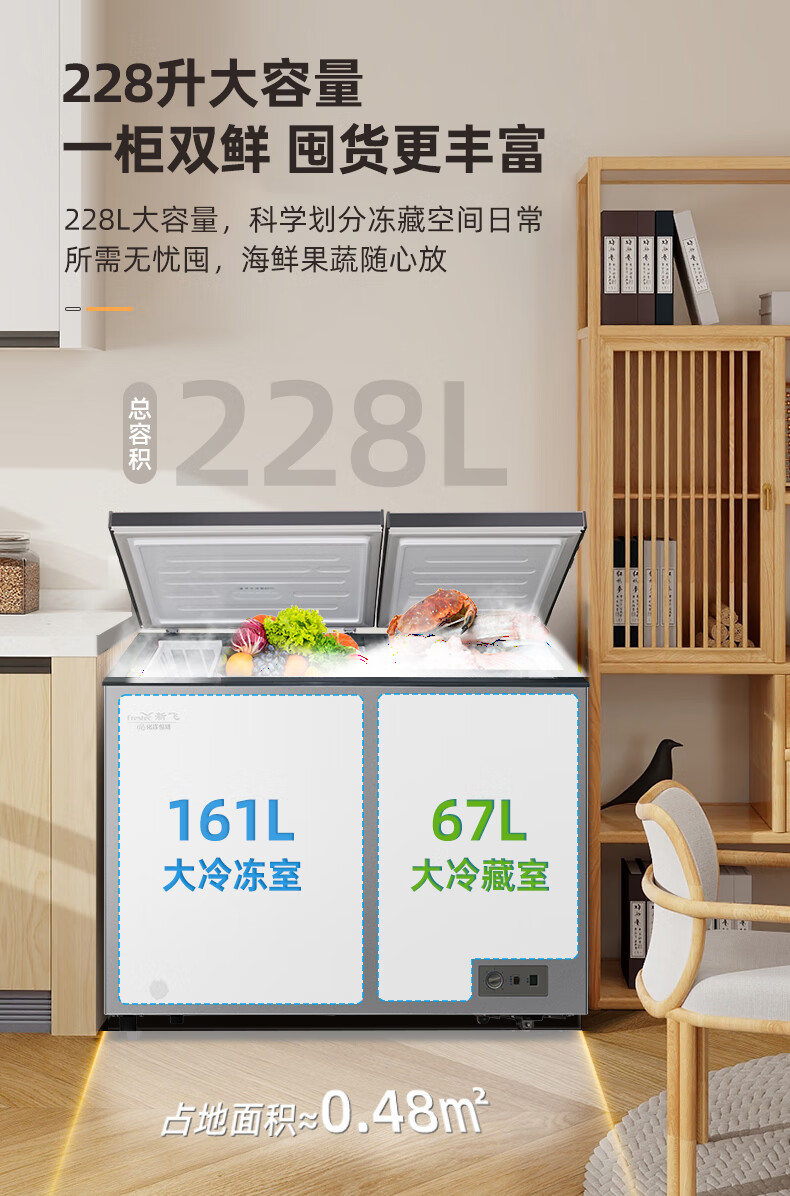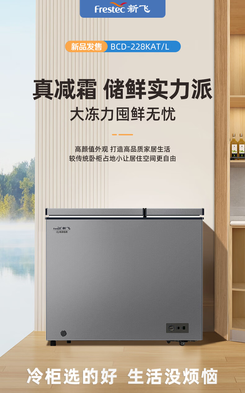 新飞(Frestec)228升双温家用冷柜冰柜 全空间减霜80%大冷冻小冷藏保鲜一级节能 BCD-228KAT/L