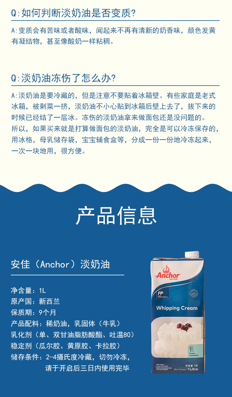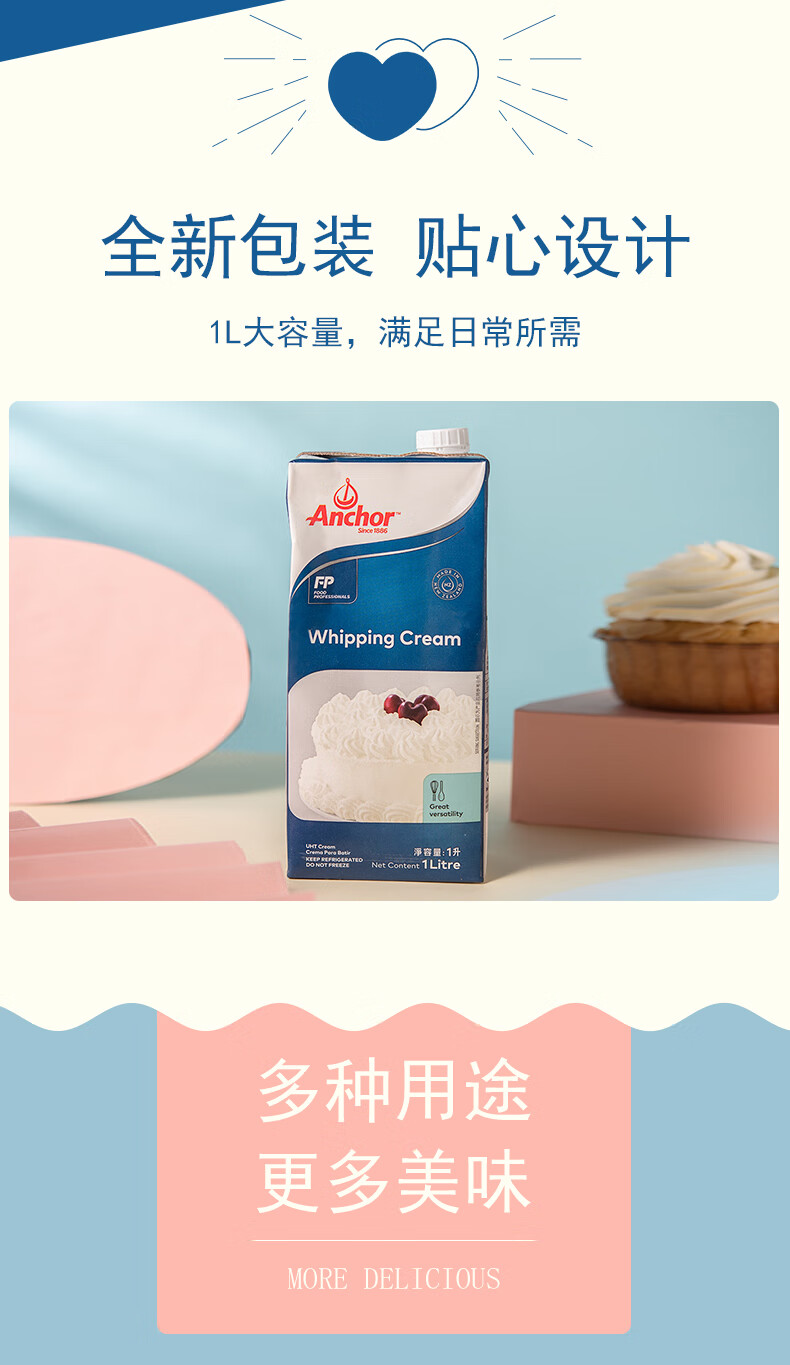 安佳(Anchor)新西兰进口 超高温灭菌搅打淡奶油稀奶油1L*12 烘焙原料
