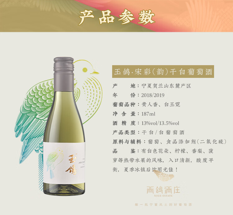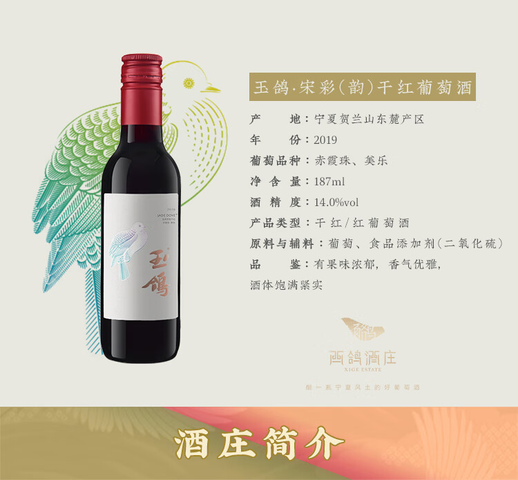 西鸽酒庄玉鸽宋韵干红干白葡萄酒 宁夏贺兰山东麓产区红酒小瓶装 红酒 干红单支 187ml*1