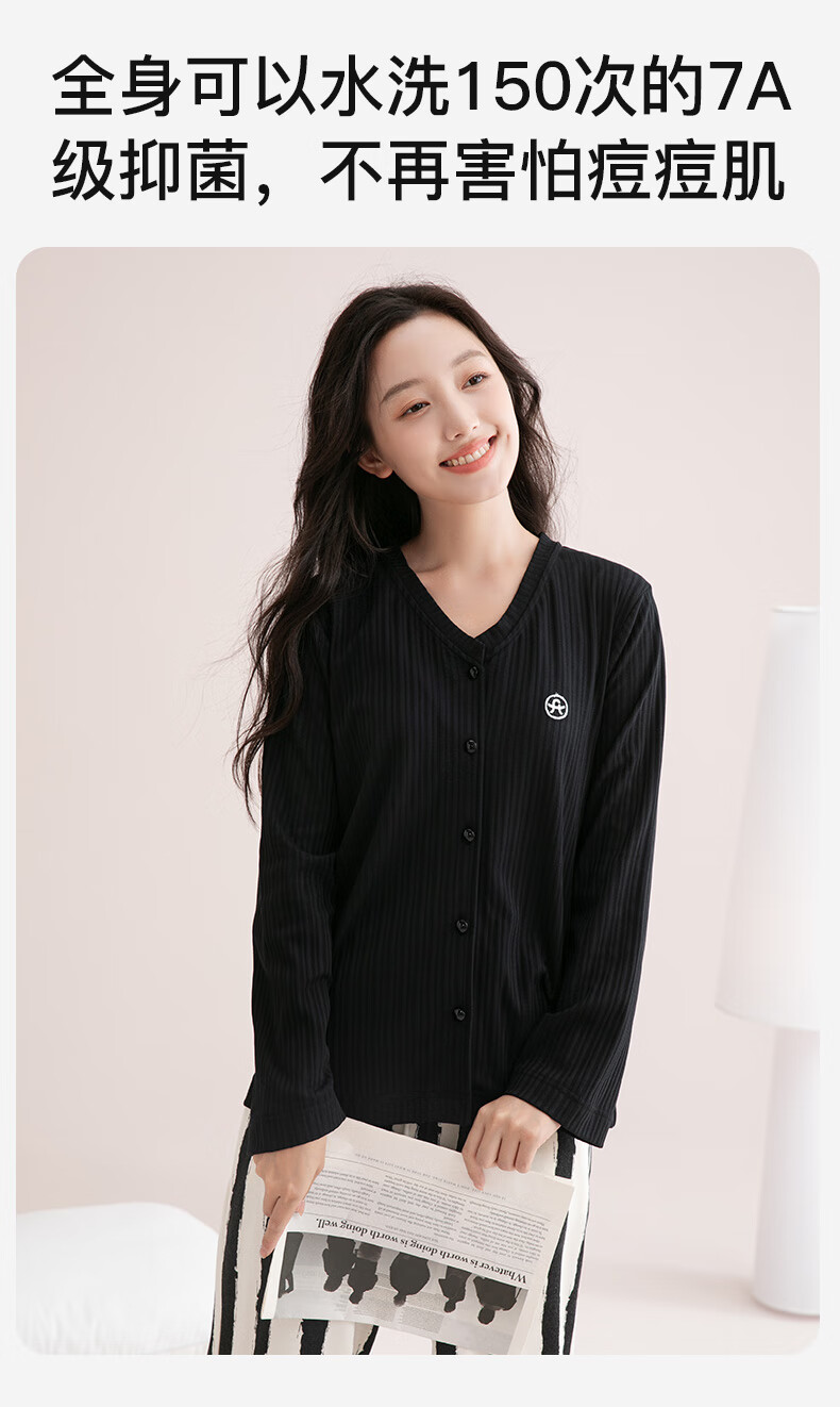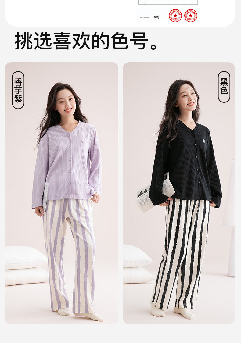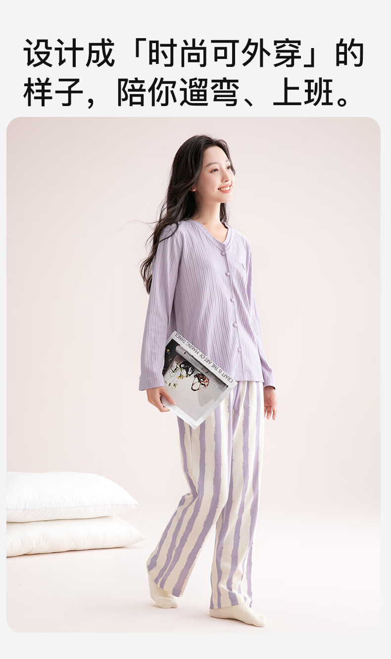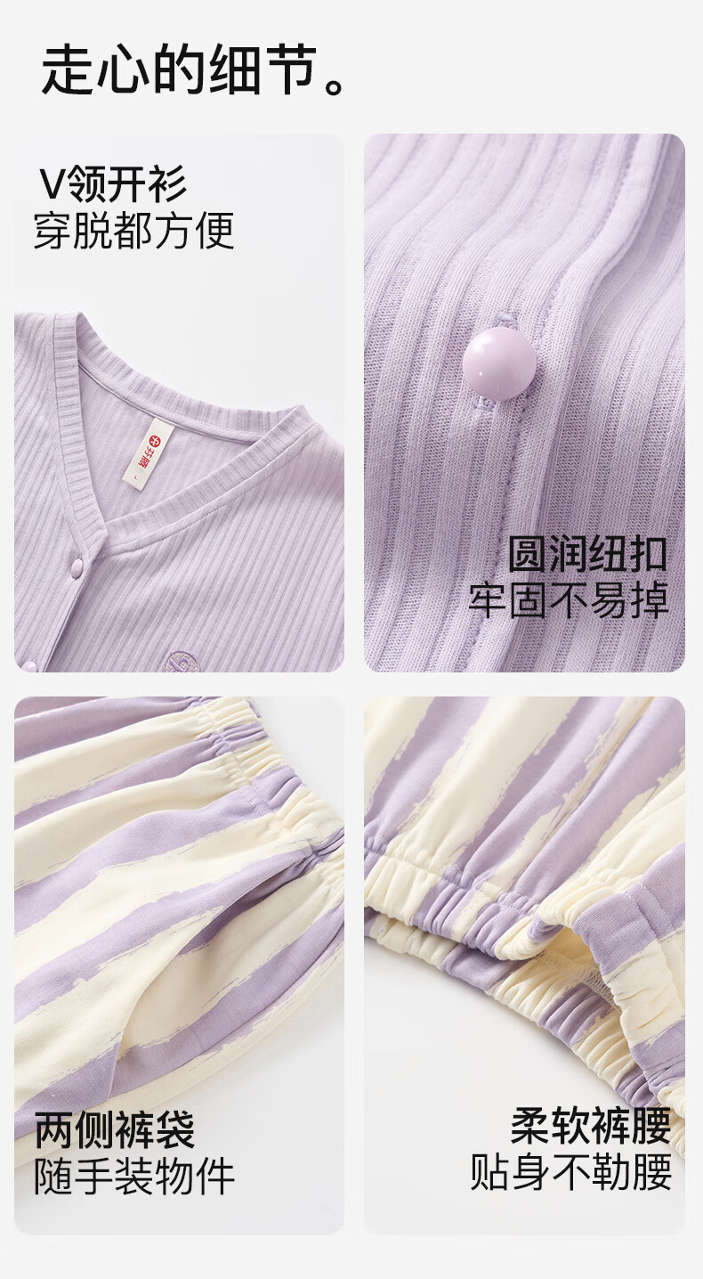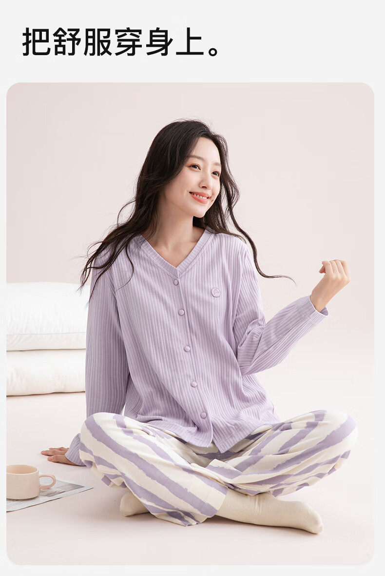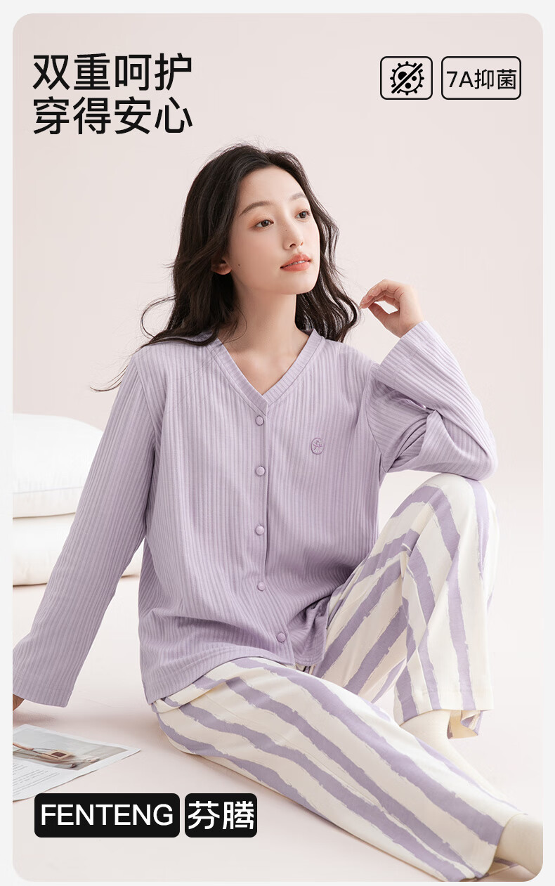 芬腾睡衣女100%纯棉2025秋季新款7A抑菌防静电V领长袖外穿家居服套装 香芋紫 XL