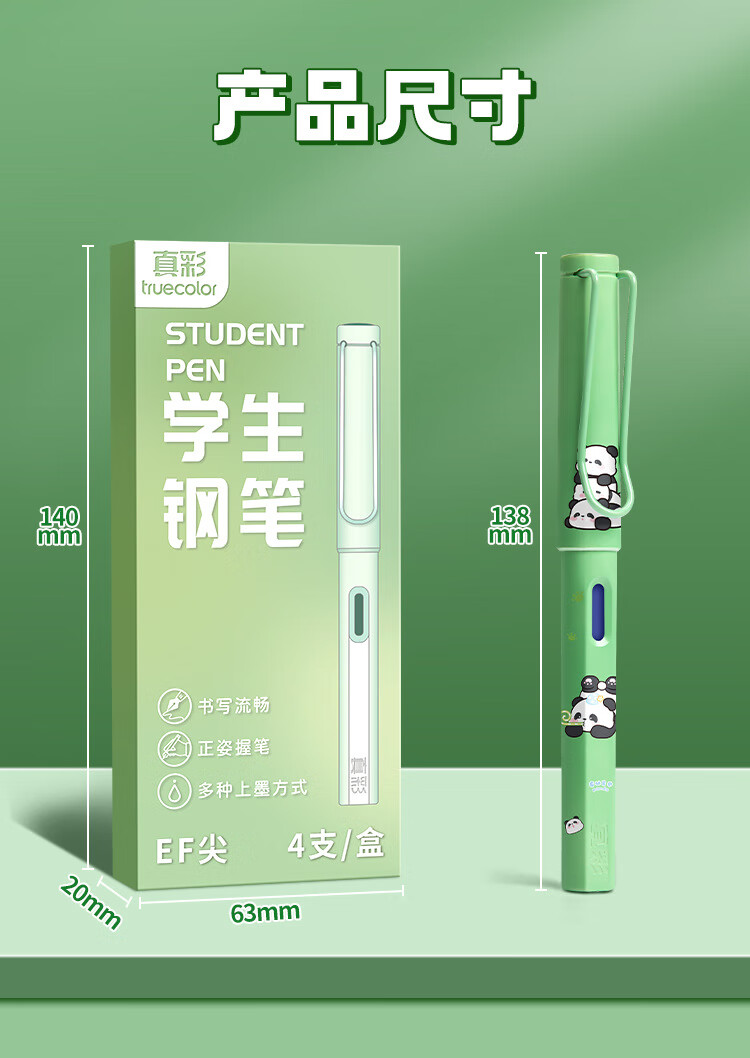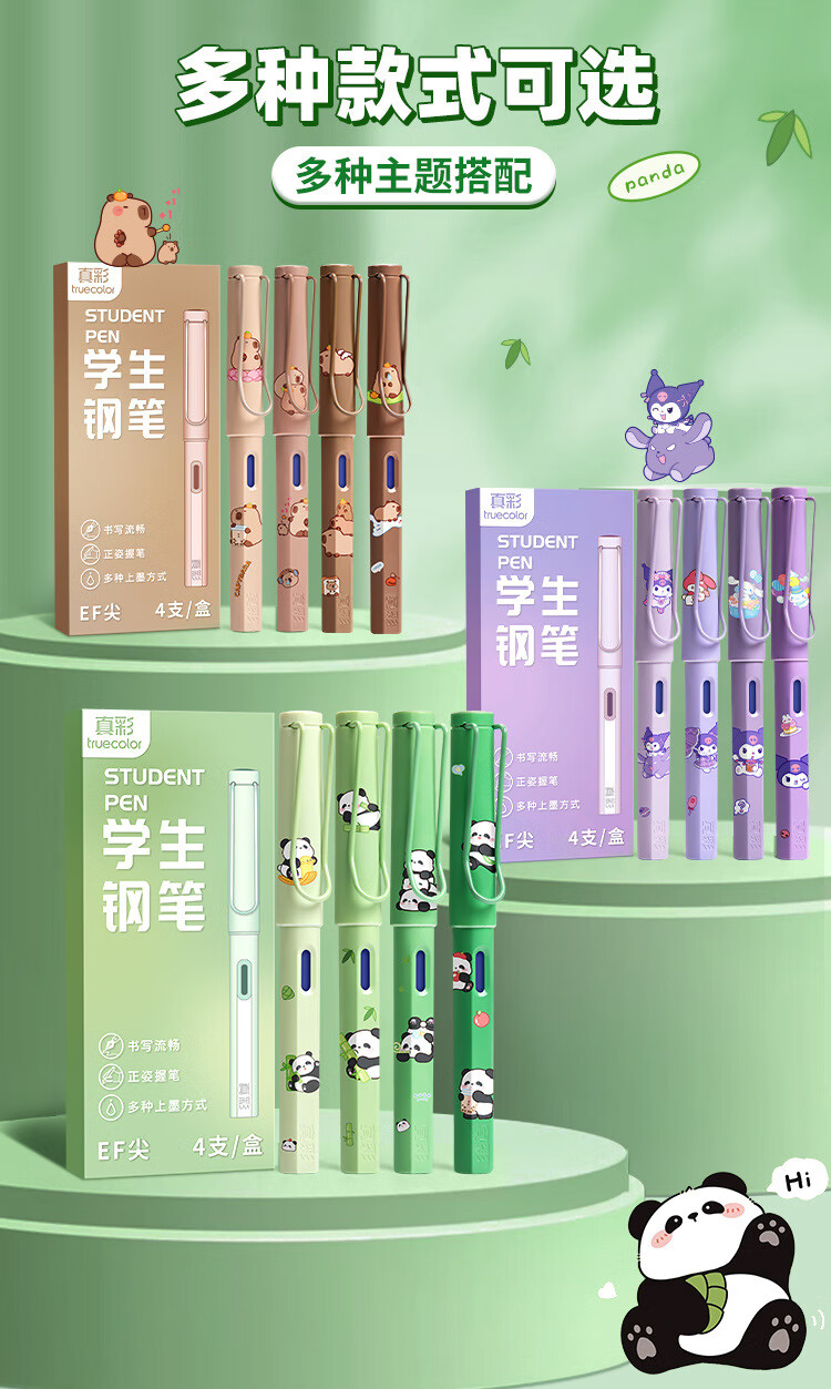 真彩学生钢笔纯蓝小学三年级专用EF尖3.4mm口径书法练字可换墨囊书写正姿钢笔套装墨水笔 渐变紫色系【4支装】
