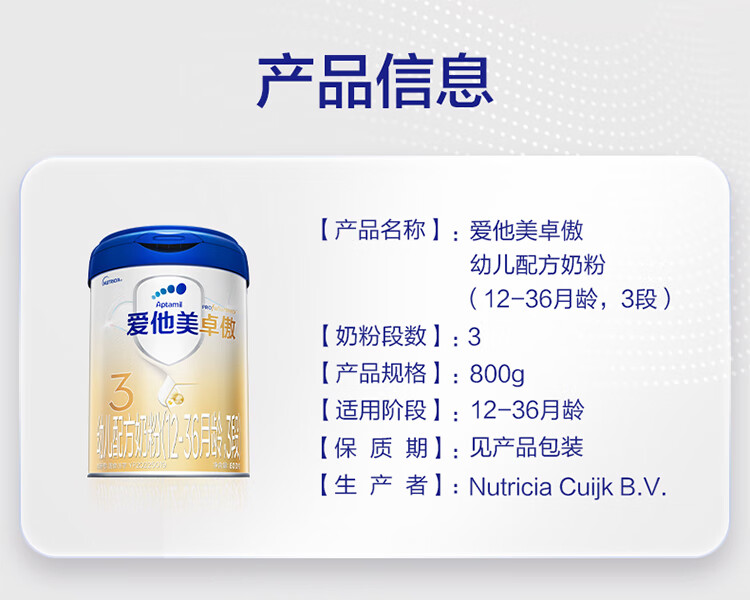 爱他美(Aptamil)卓傲幼儿配方奶粉3段(12—36月龄) 800g*1罐 卓傲自护益生元