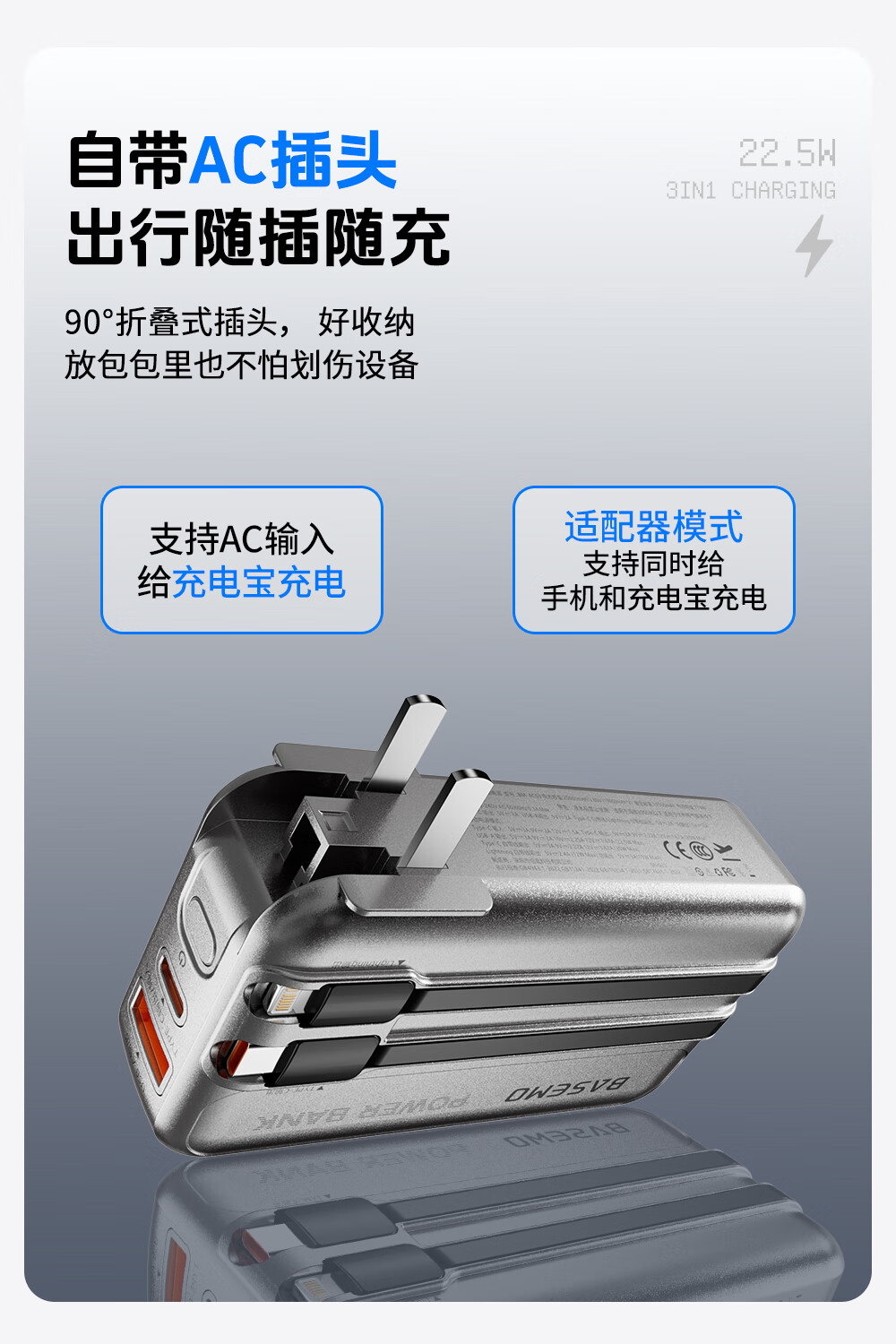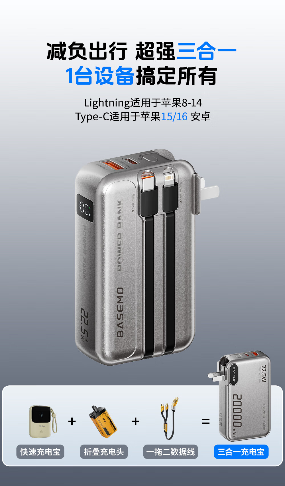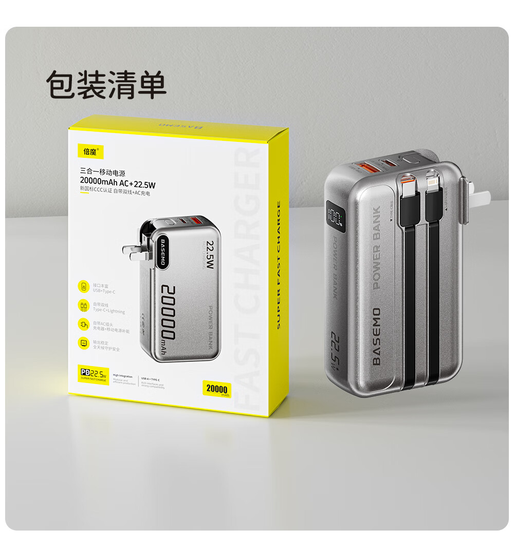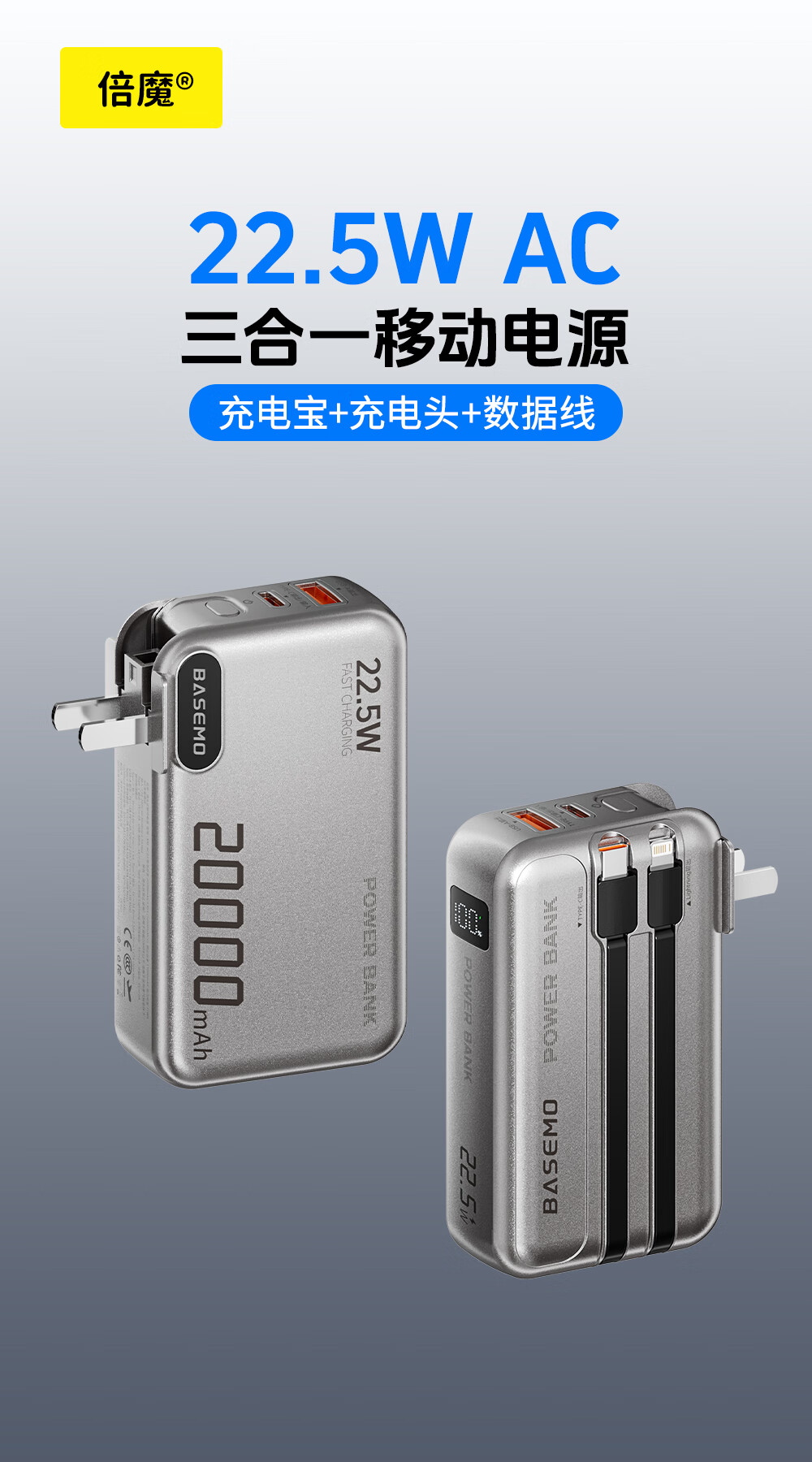 倍魔充电宝20000毫安自带线AC插头新国标3C认证可上飞机 22.5W快充三合一移动电源适用苹果17小米华为 2万毫安|自带双线|AC折叠插头