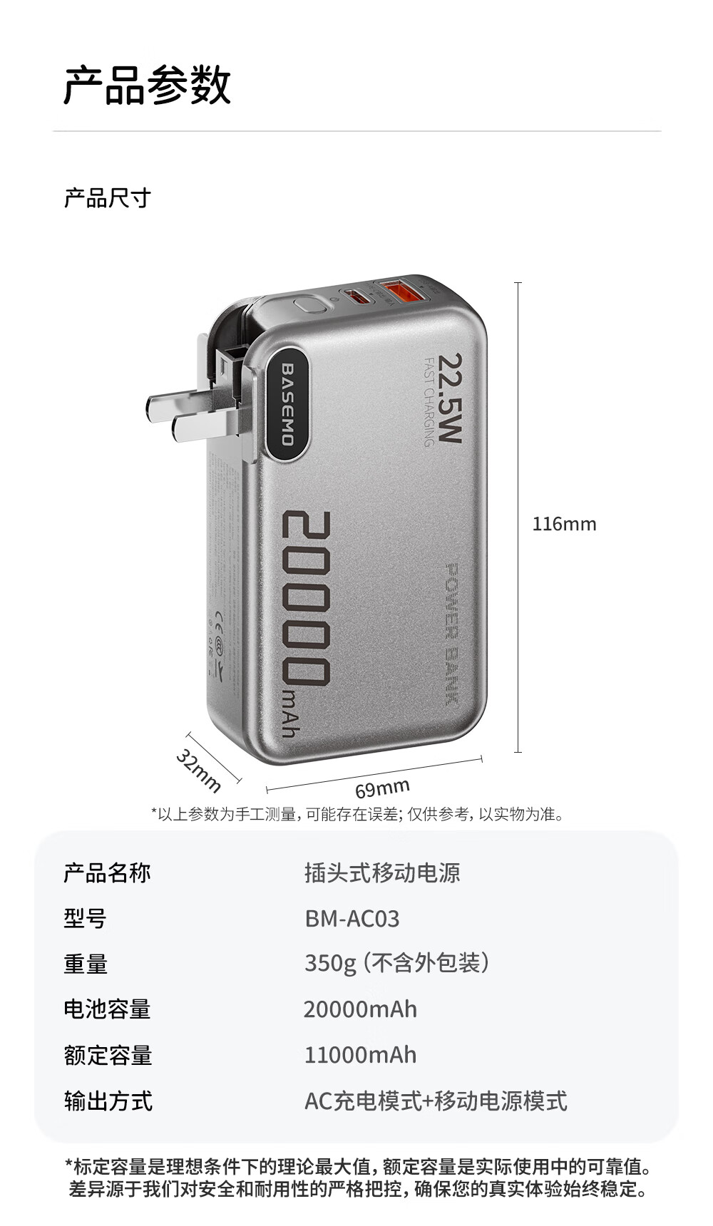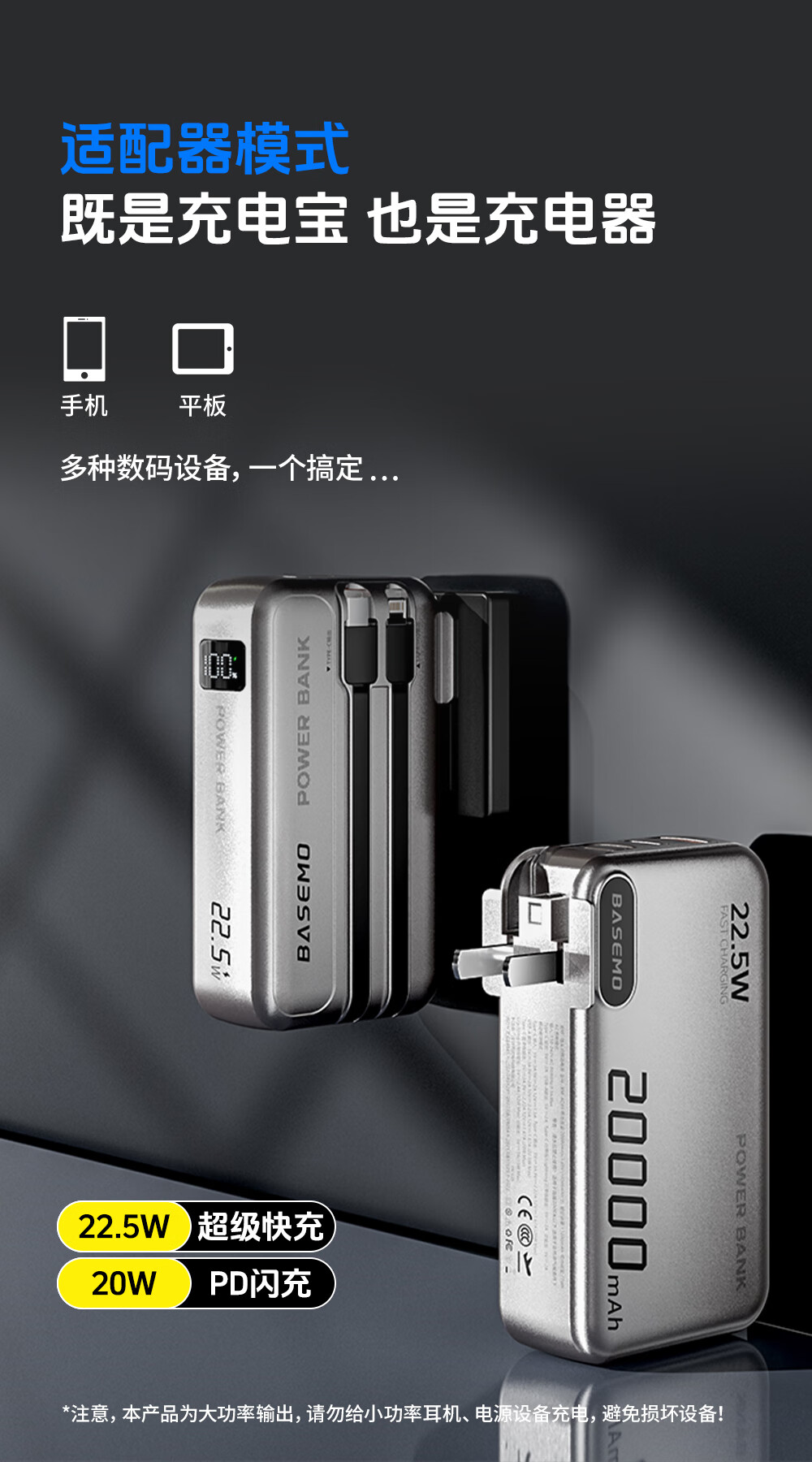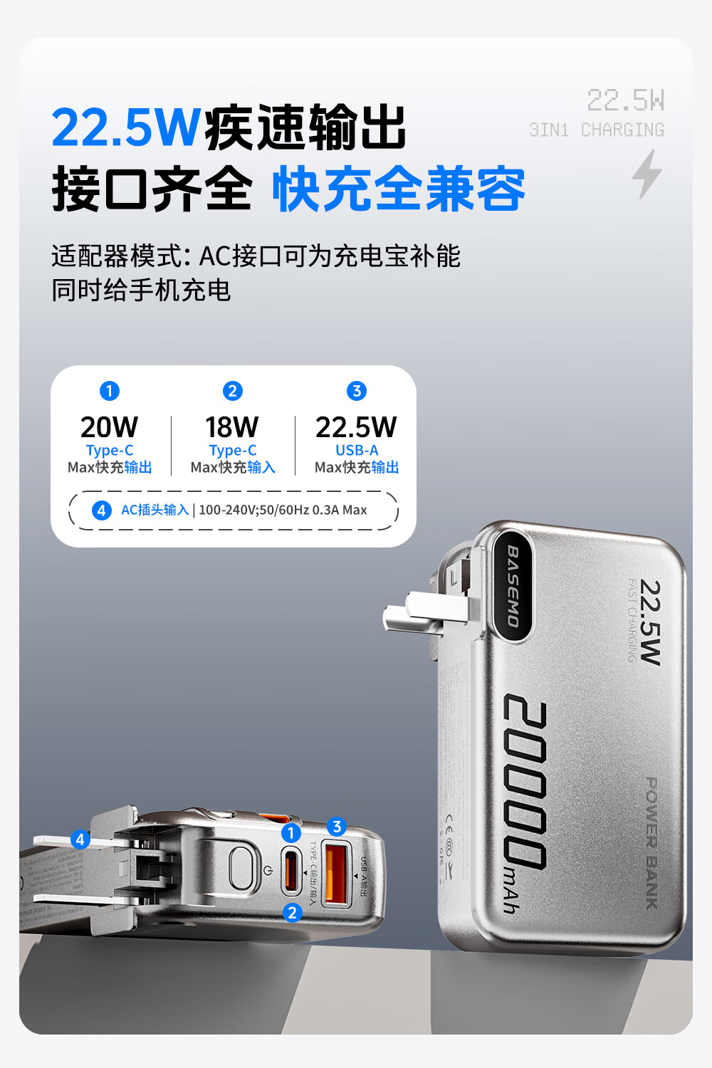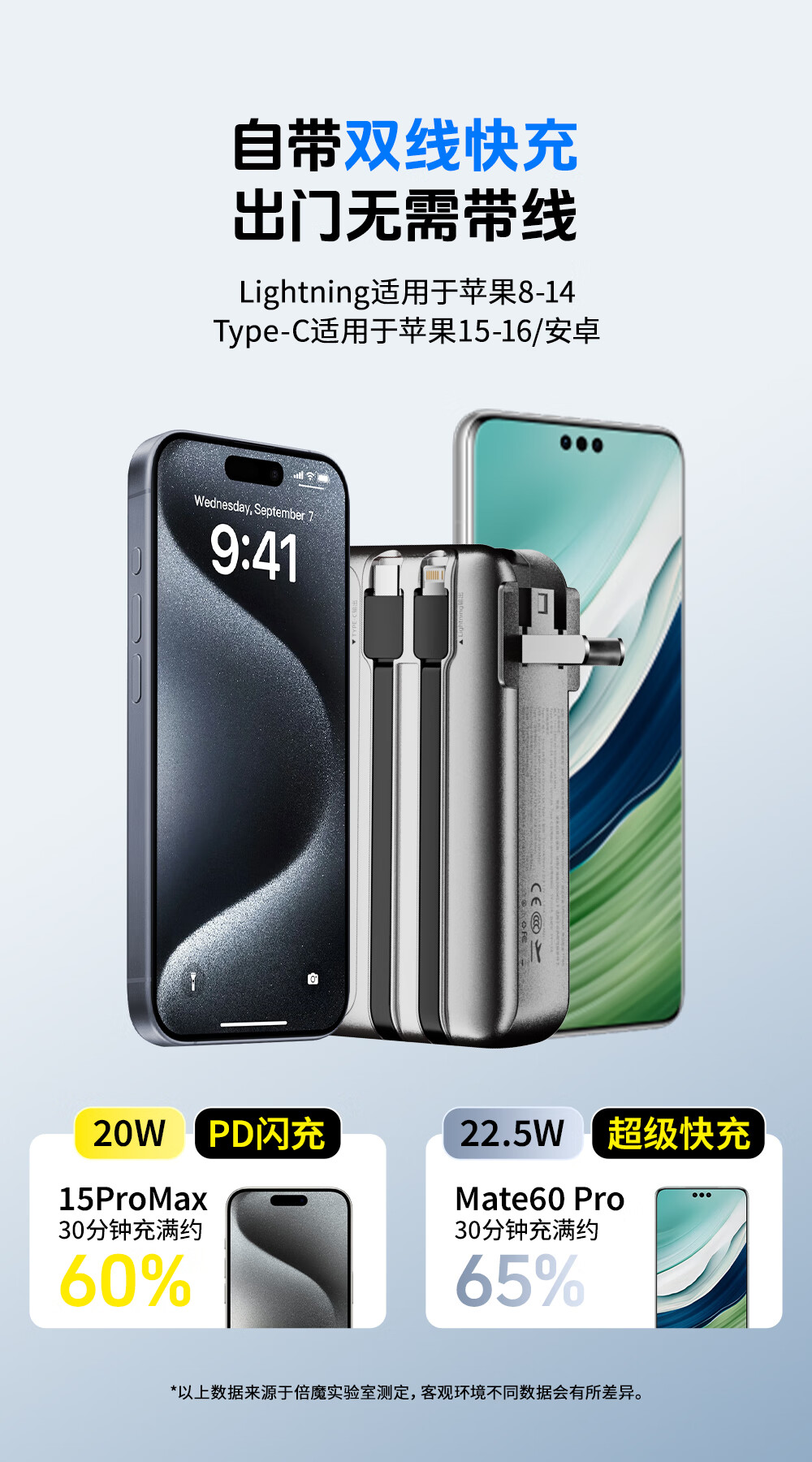 倍魔充电宝20000毫安自带线AC插头新国标3C认证可上飞机 22.5W快充三合一移动电源适用苹果17小米华为 2万毫安|自带双线|AC折叠插头