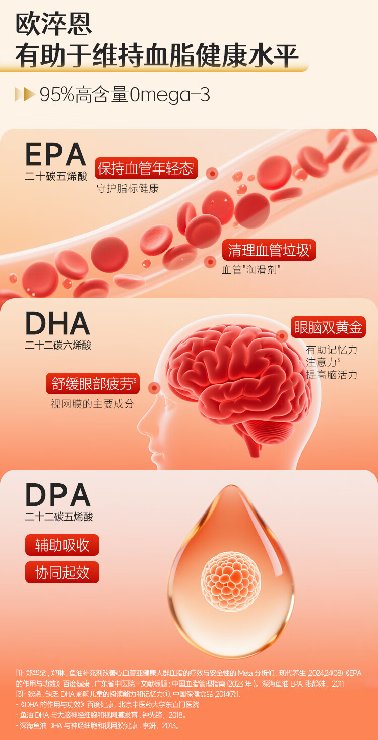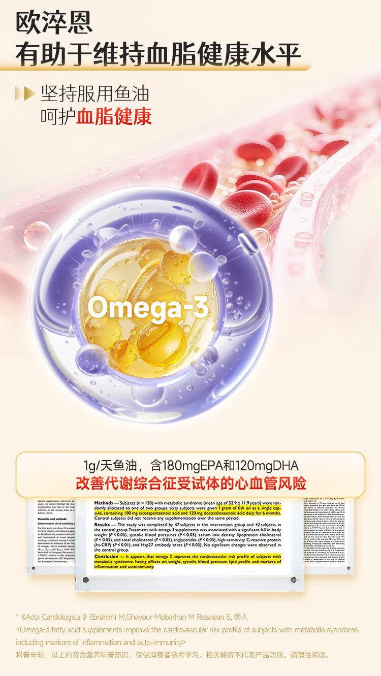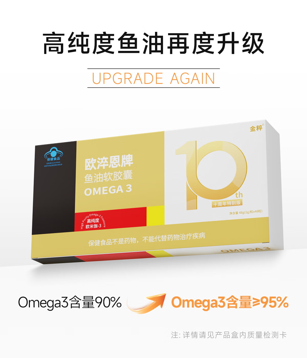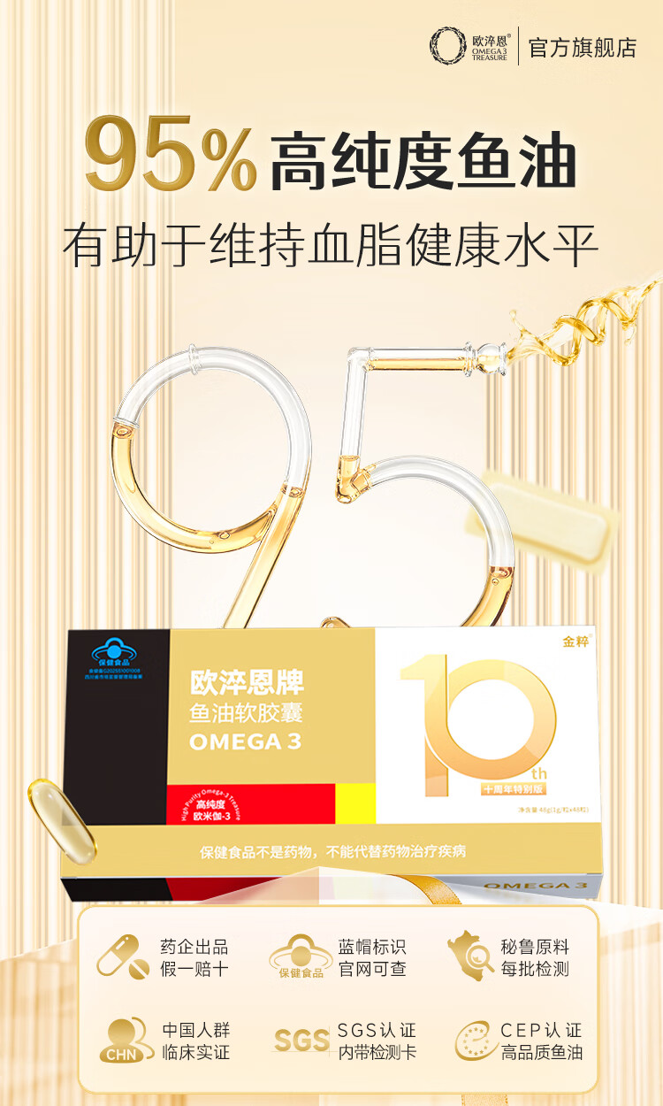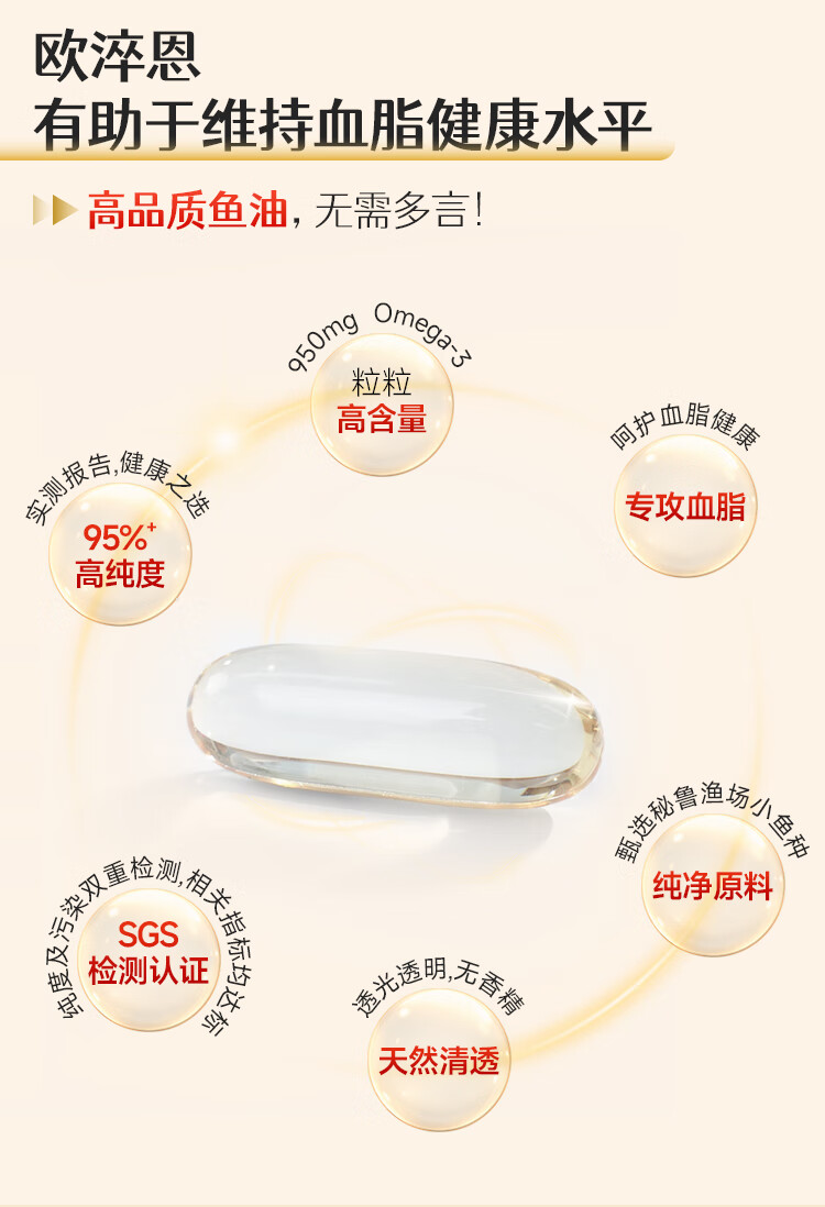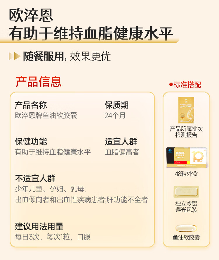 欧淬恩深海鱼油95%高纯度鱼肝油高含量omega3中老年易吞服送礼降血脂压 48粒*5盒【下单赠礼盒送礼优选】