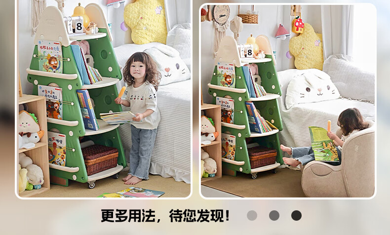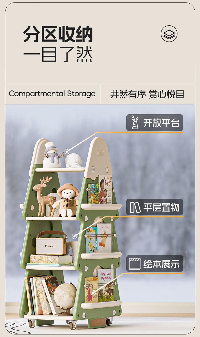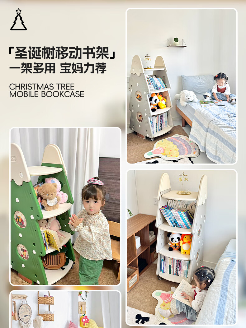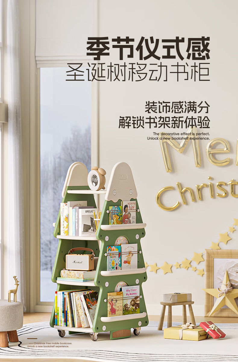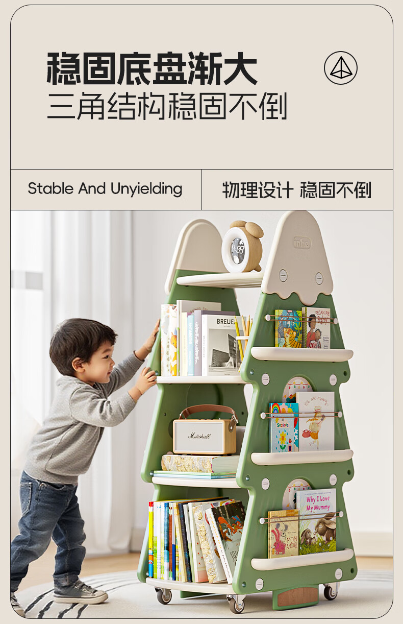 英禾儿童移动书架绘本架阅读宝宝玩具收纳架落地书架儿童房多层圣诞树 【0甲醛】圣诞树书架-青山绿 【静音万向轮 +带侧收纳】
