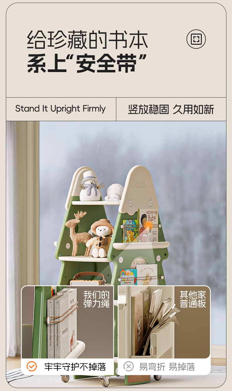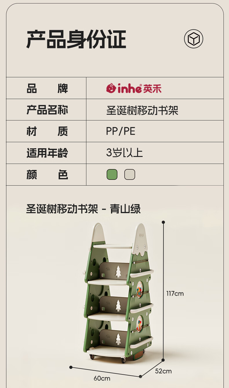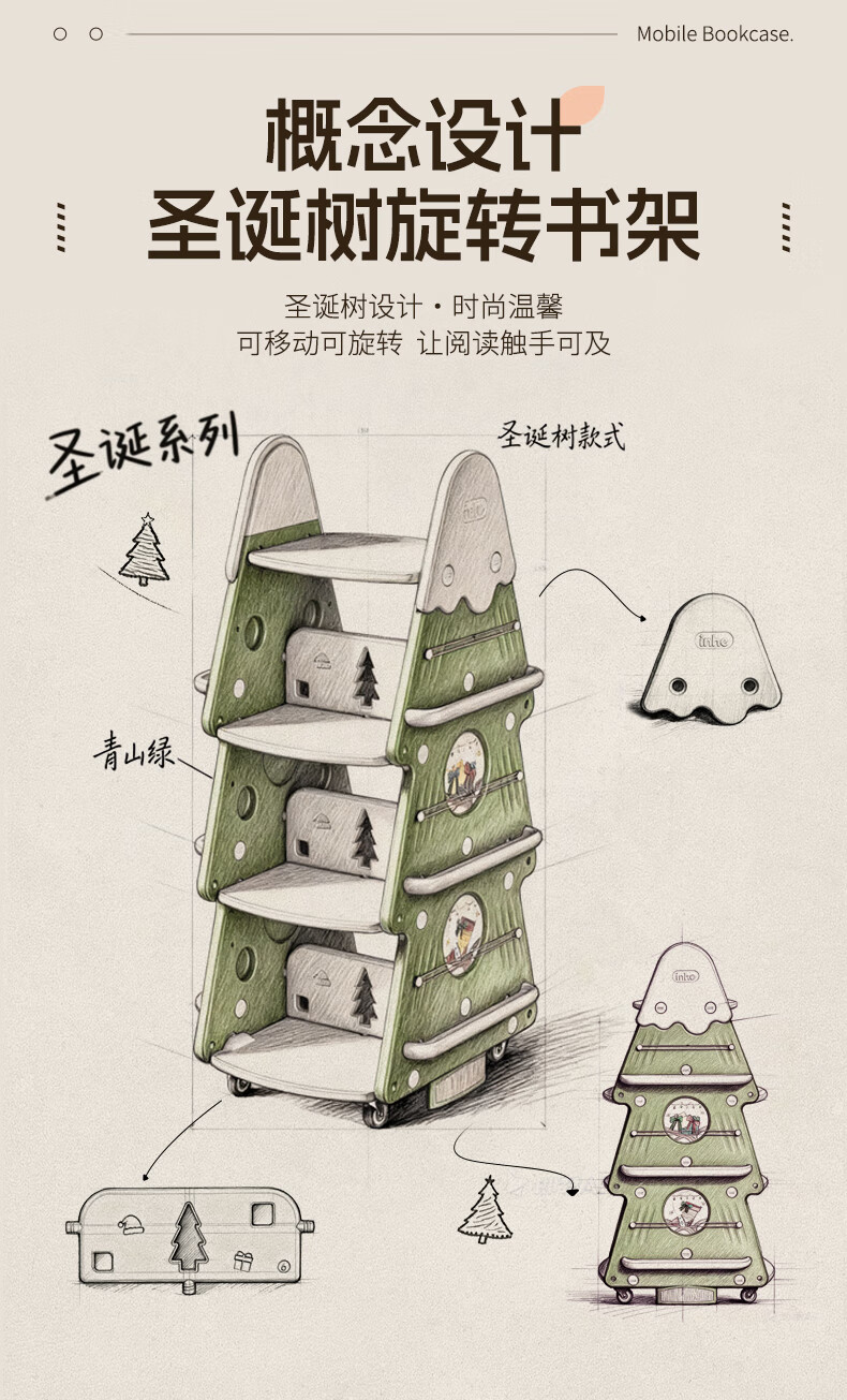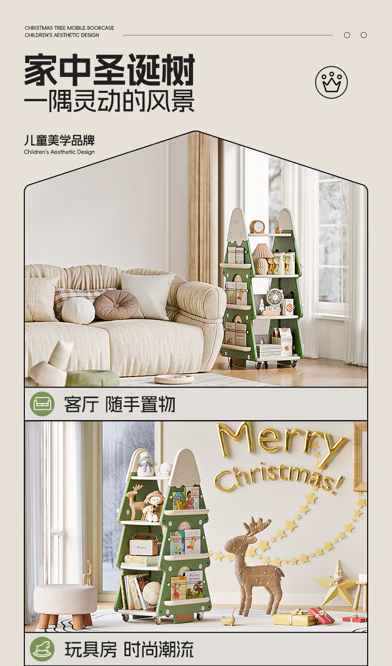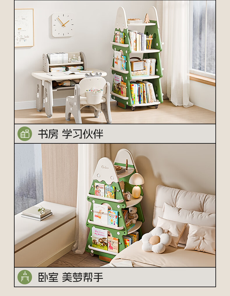 英禾儿童移动书架绘本架阅读宝宝玩具收纳架落地书架儿童房多层圣诞树 【0甲醛】圣诞树书架-青山绿 【静音万向轮 +带侧收纳】