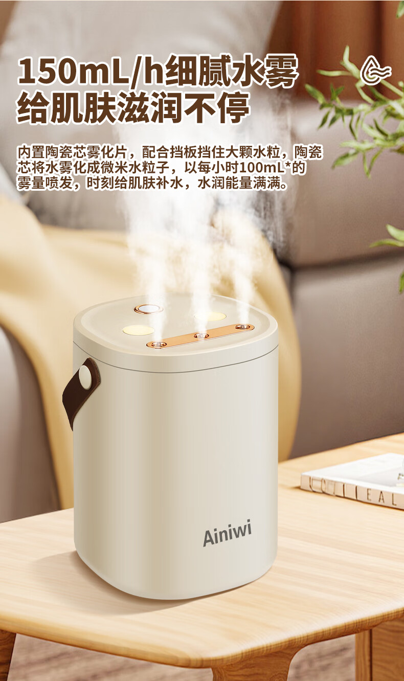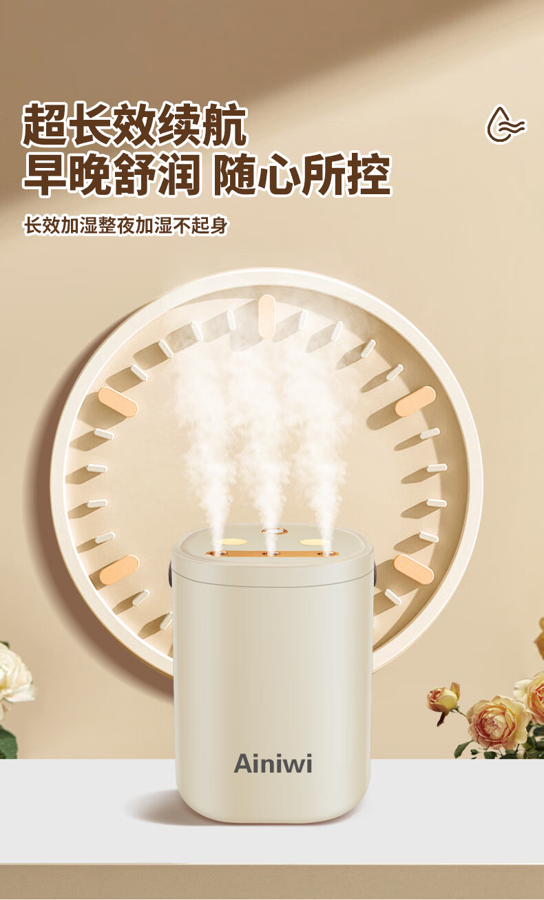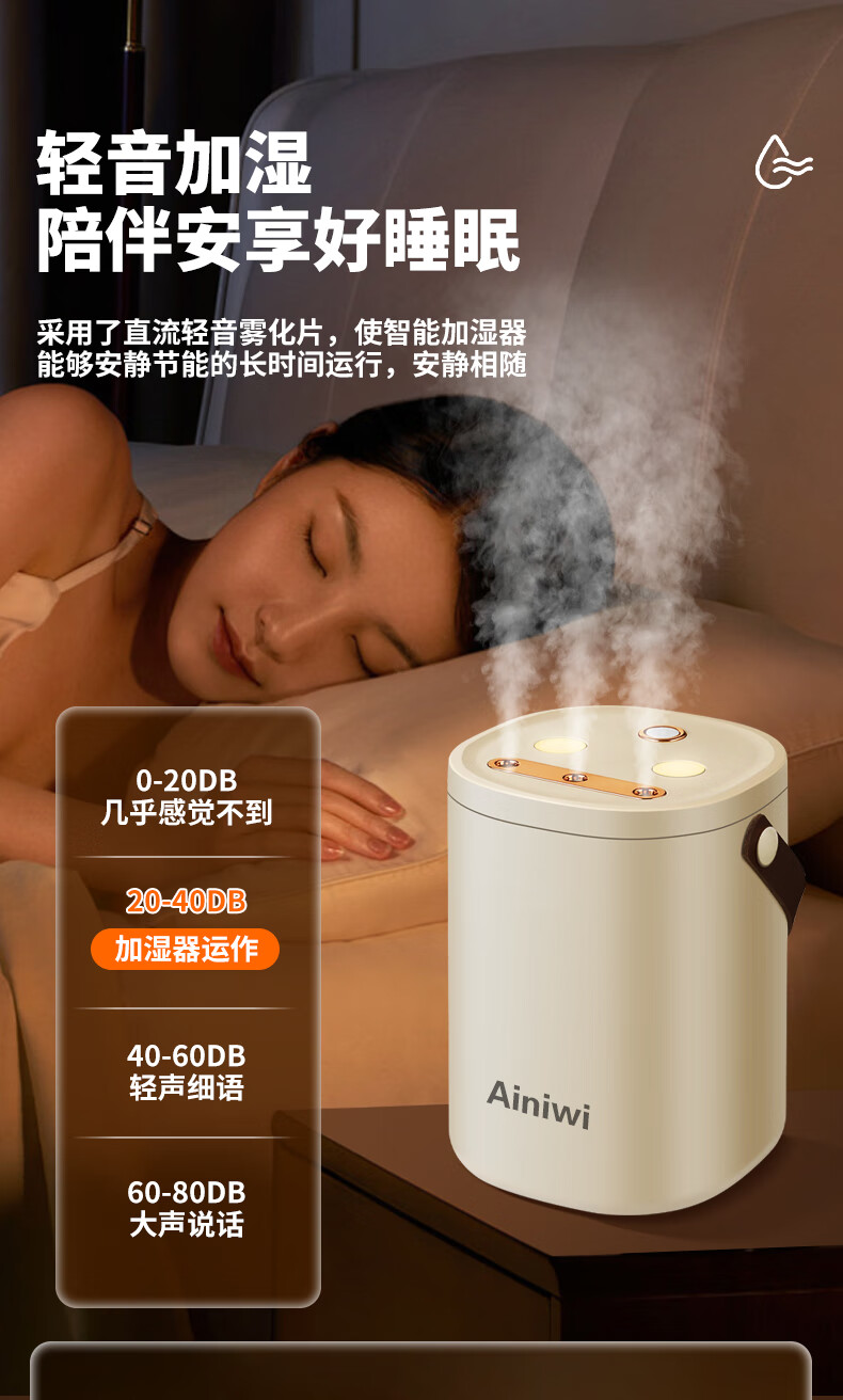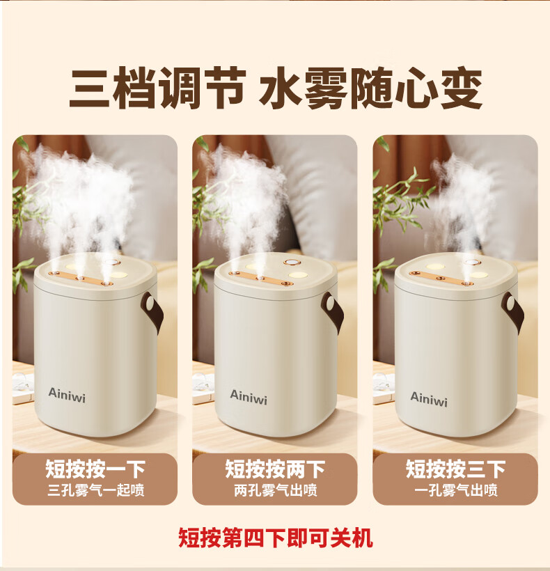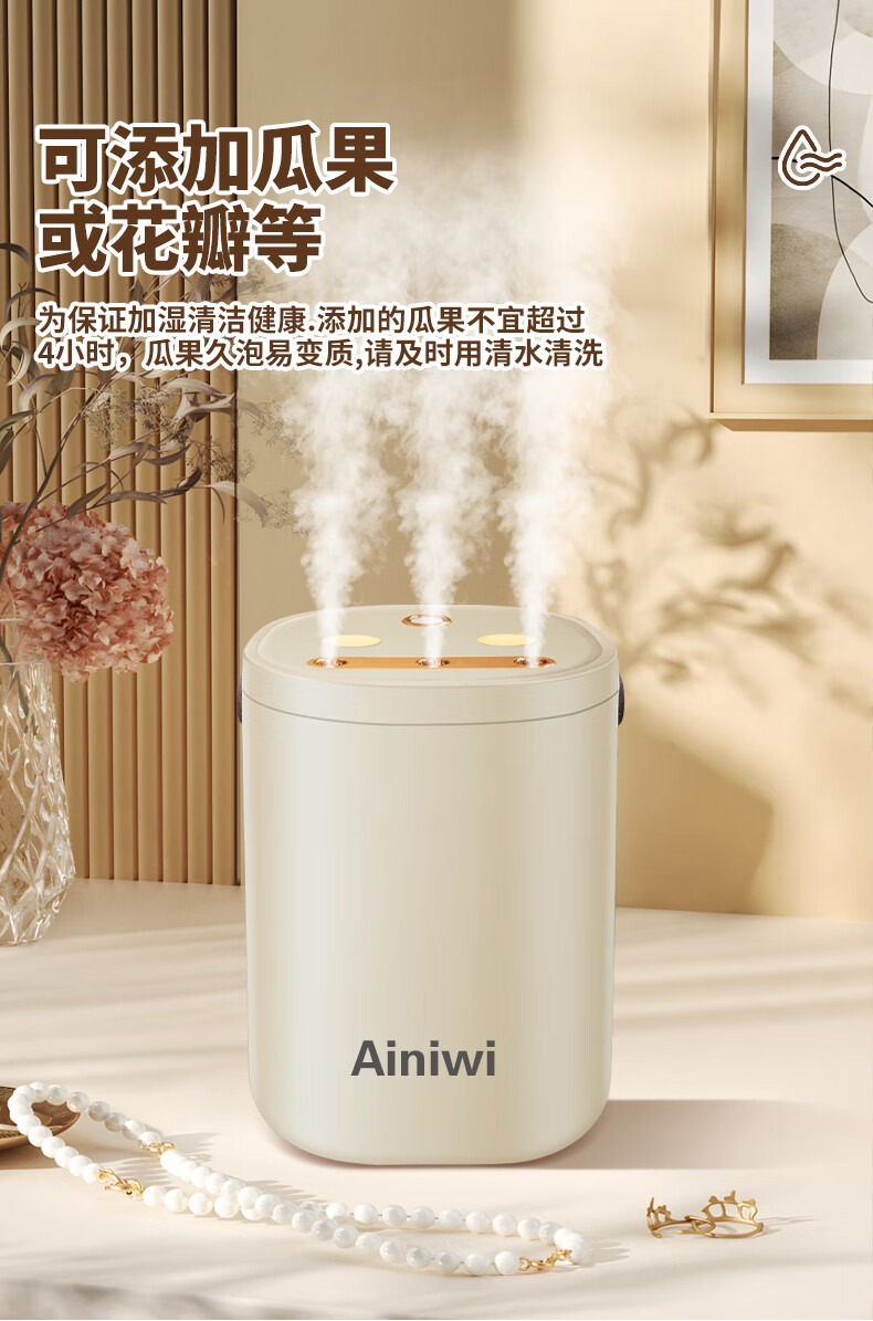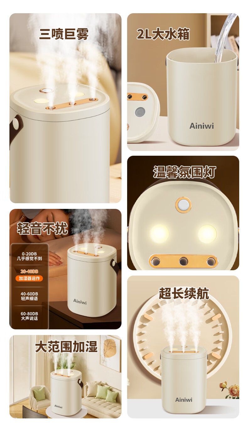 爱尼维(Ainiwi)加湿器家用桌面加湿机智能大容量香薰机静音大雾量办公室增湿器 三孔喷雾+夜灯【USB充电款】