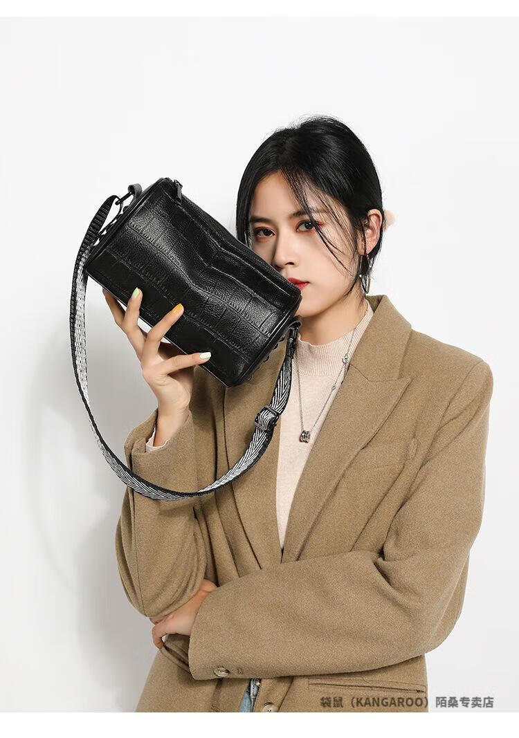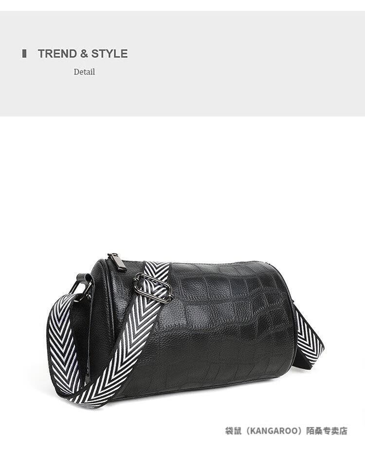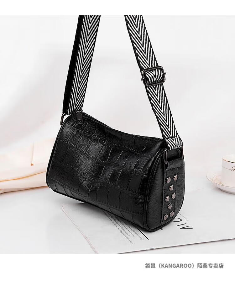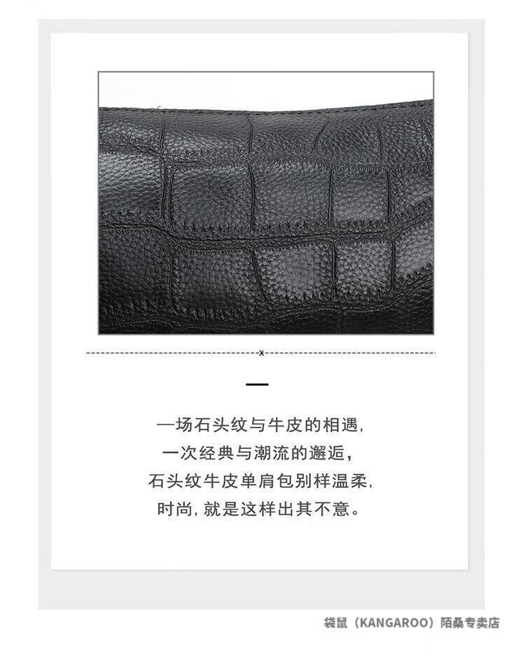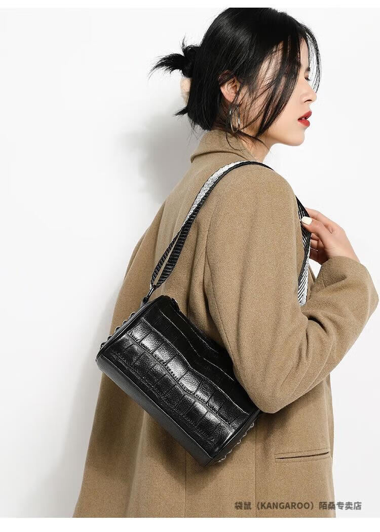 袋鼠(KANGAROO)真皮包包枕头包女夏2025新款时尚鳄鱼纹大容量单肩包宽肩带斜挎包 黑色