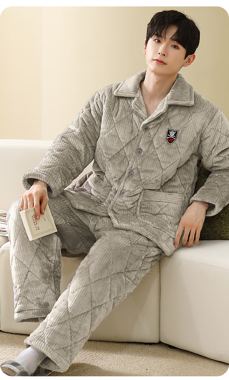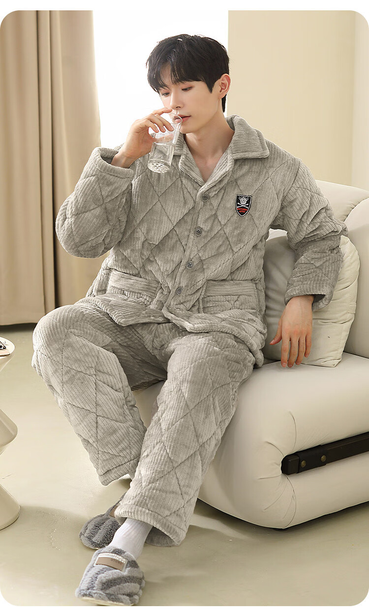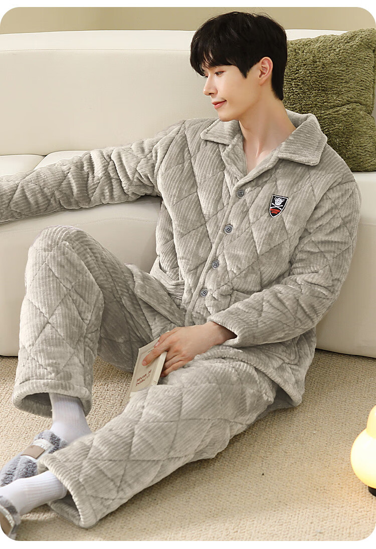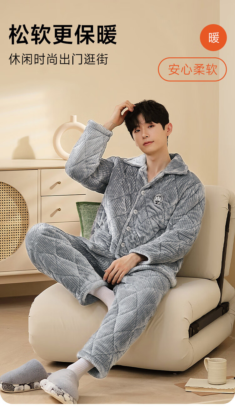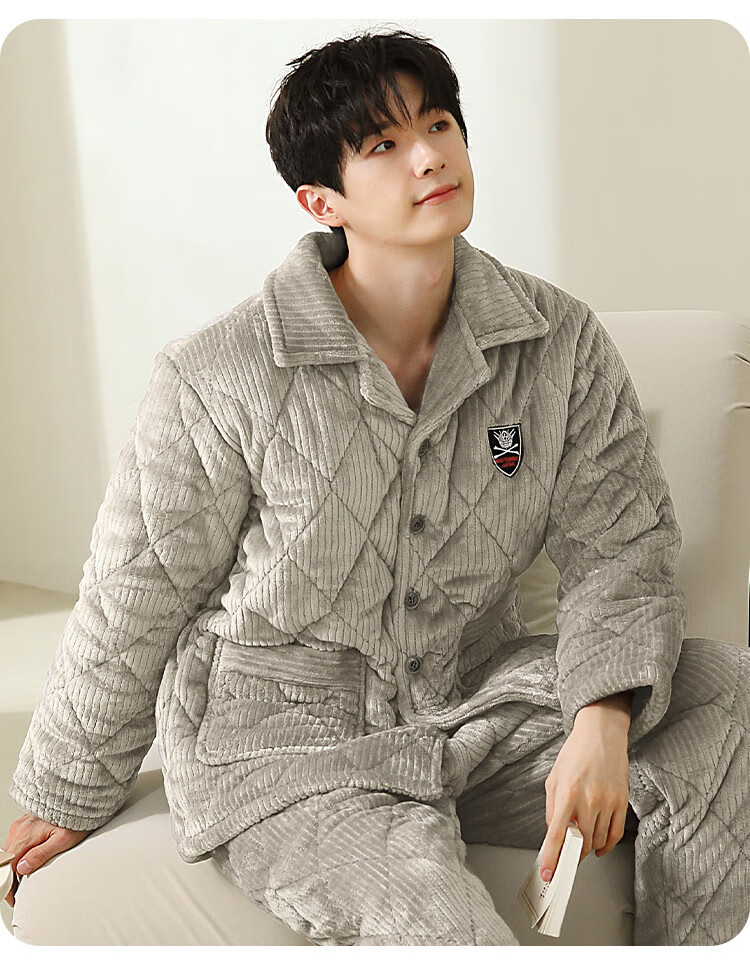 香蜜闺秀【三层夹棉加厚】男士睡衣秋冬新款长袖可外穿保暖男士家居服套装 卡其 XL