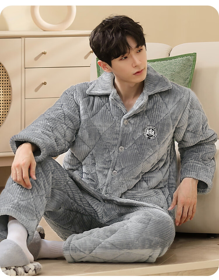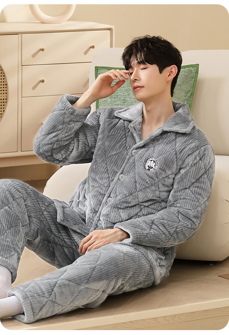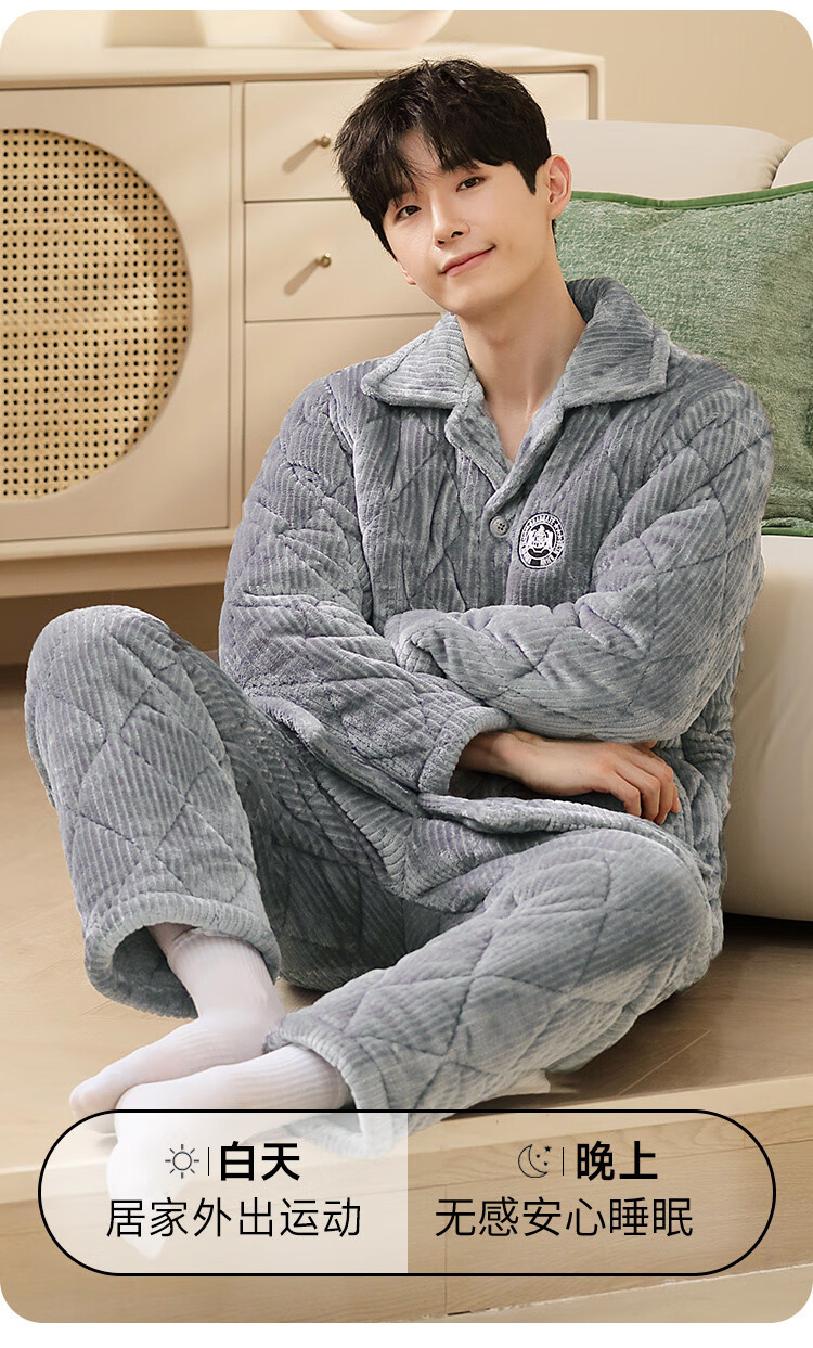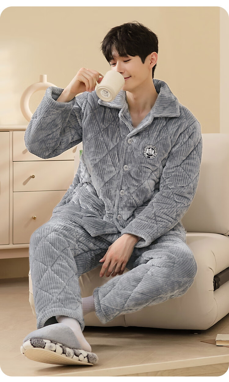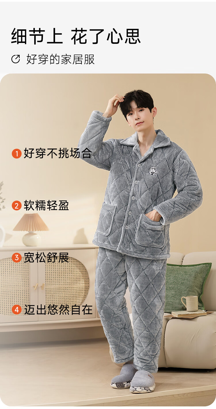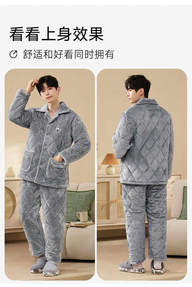 香蜜闺秀【三层夹棉加厚】男士睡衣秋冬新款长袖可外穿保暖男士家居服套装 卡其 XL