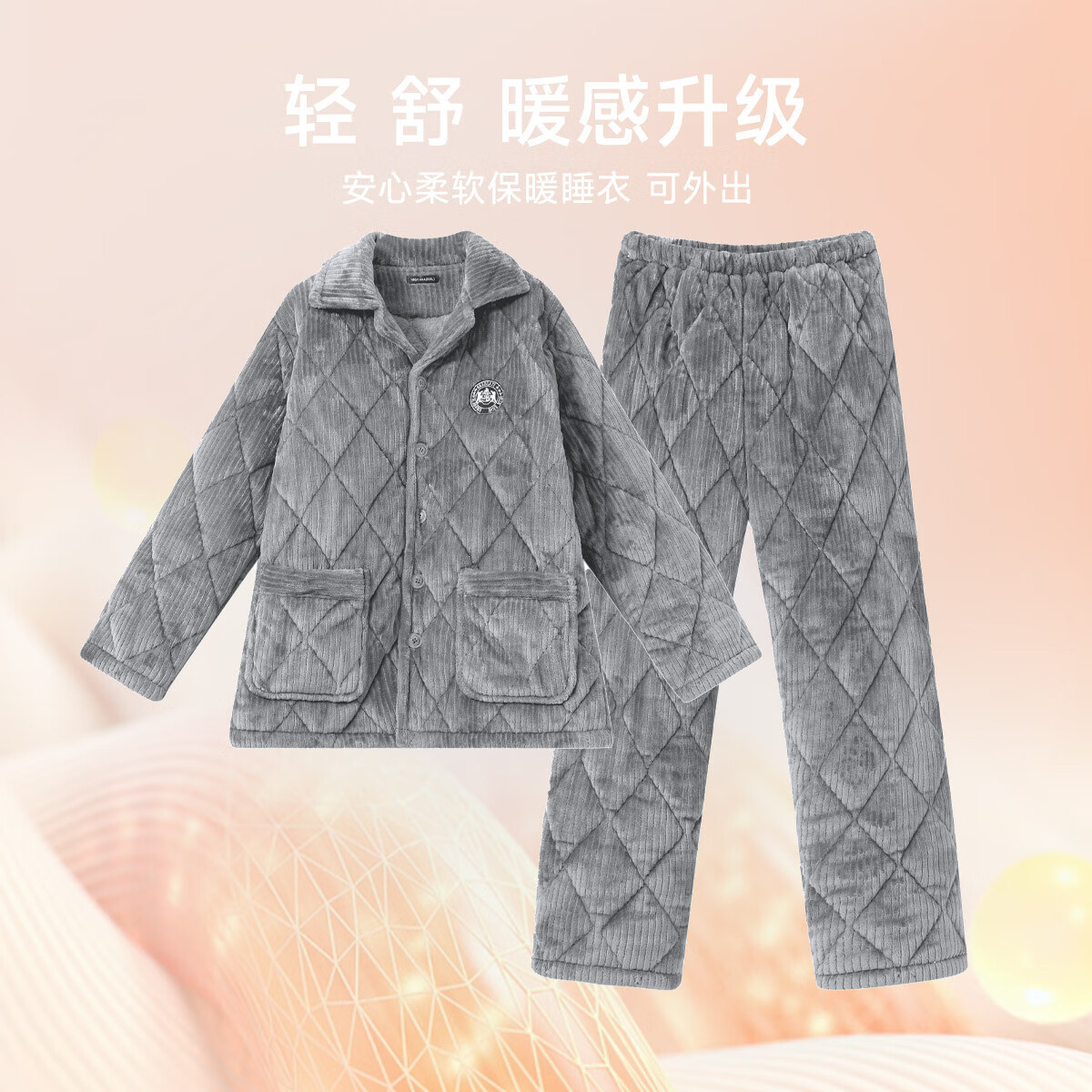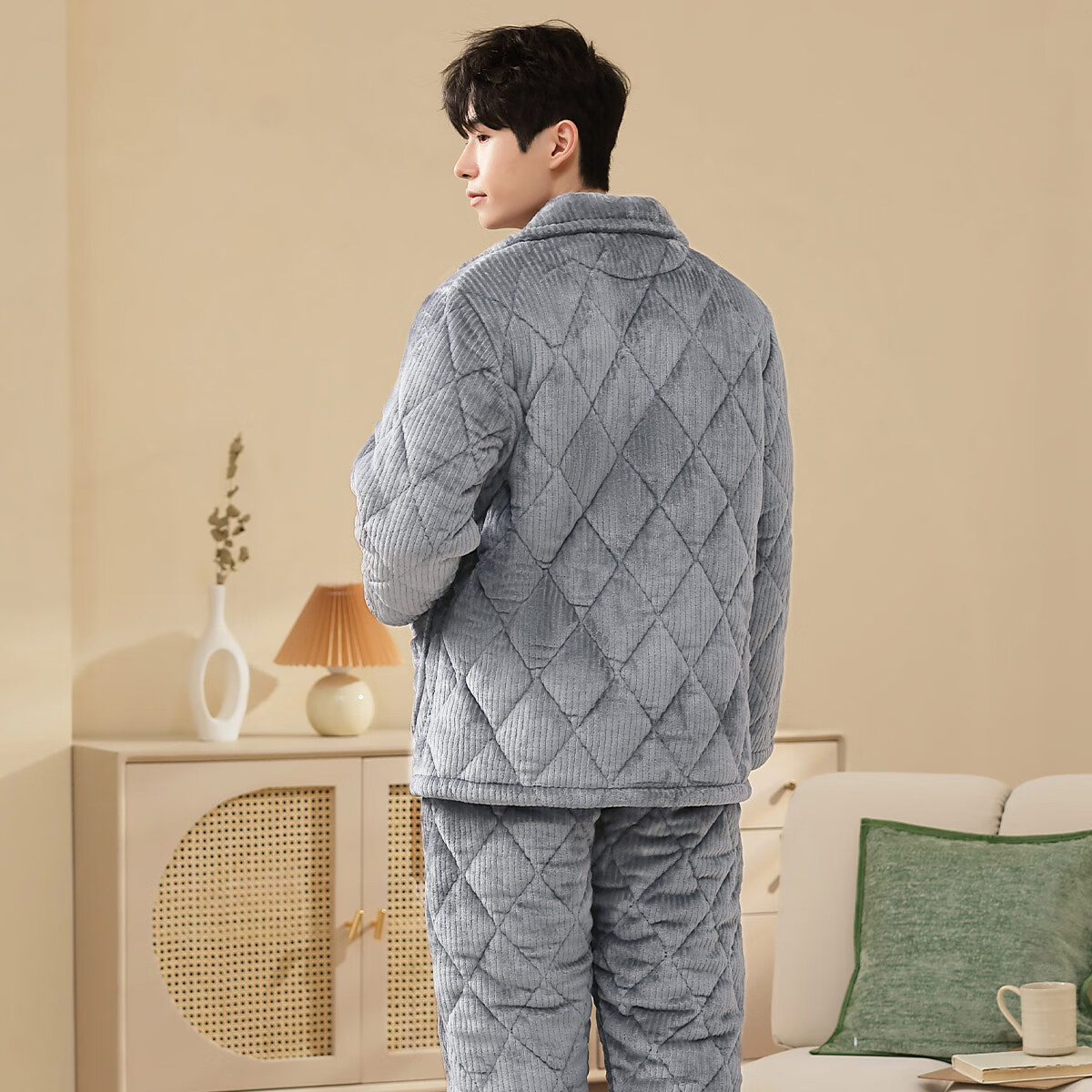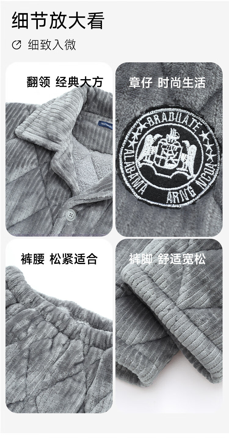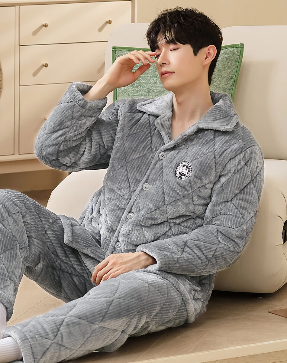 香蜜闺秀【三层夹棉加厚】男士睡衣秋冬新款长袖可外穿保暖男士家居服套装 卡其 XL