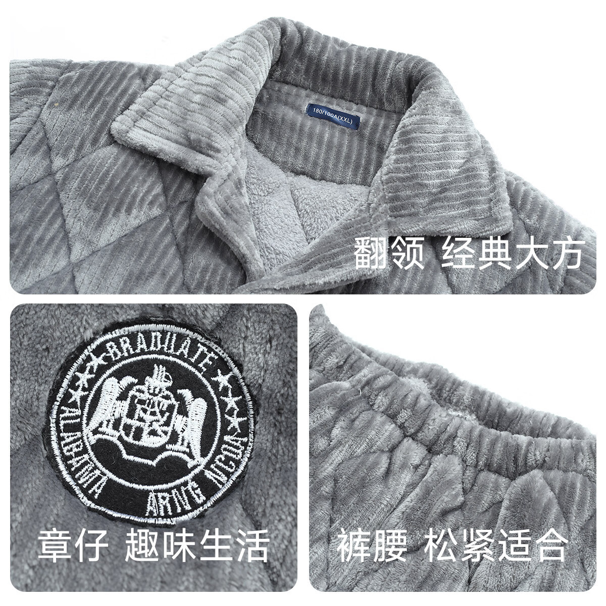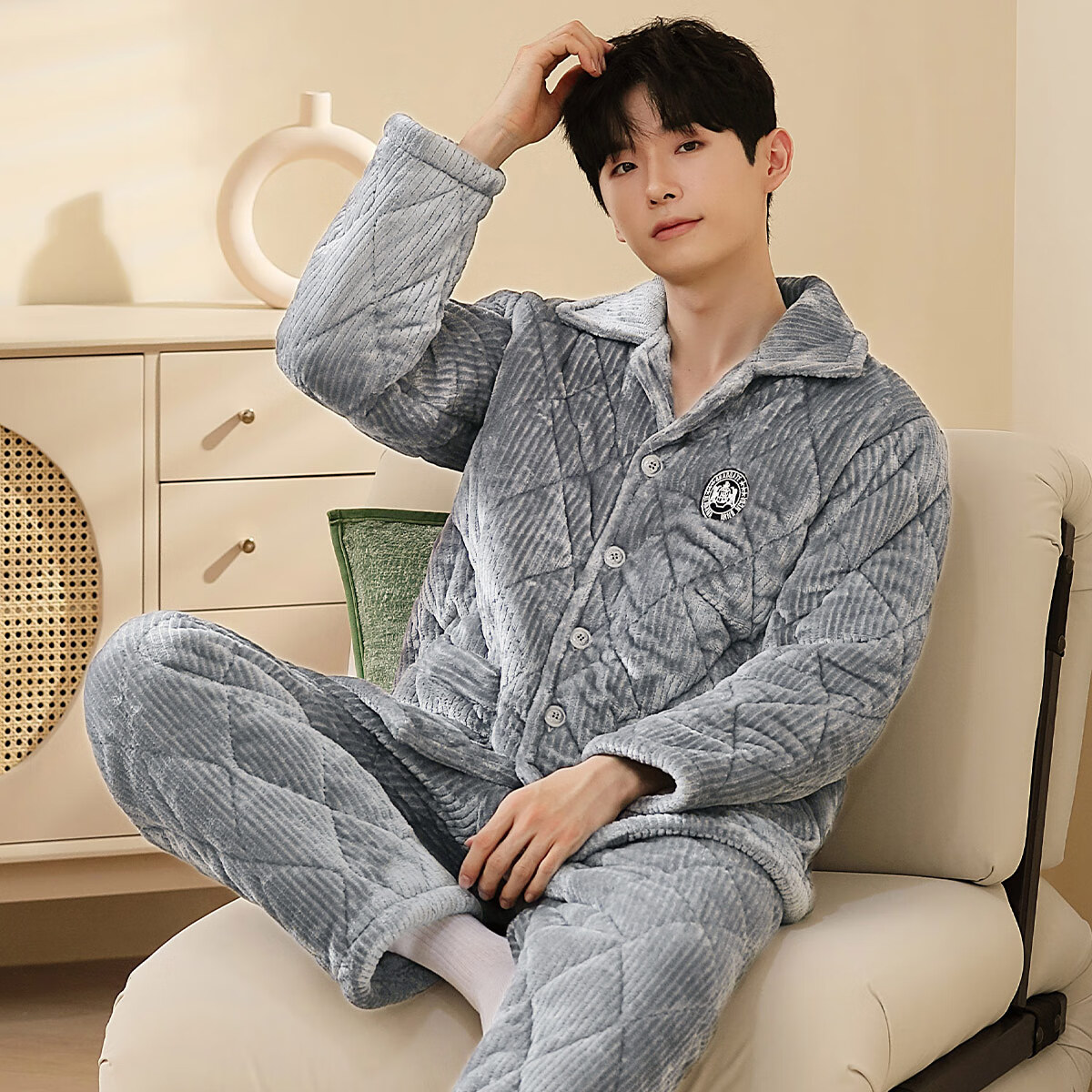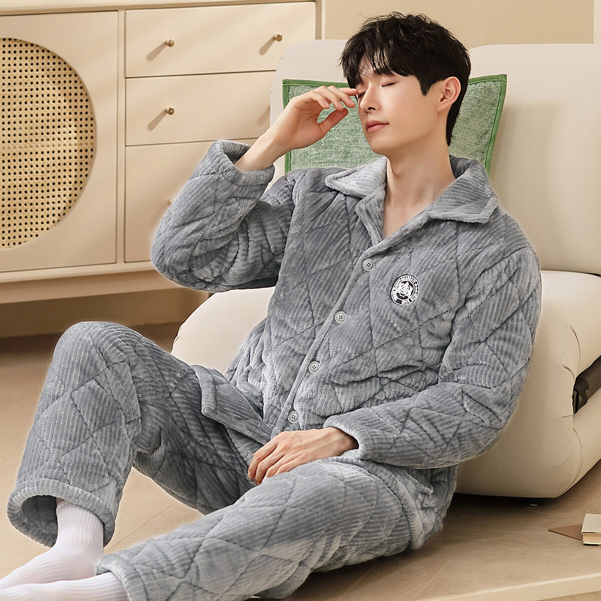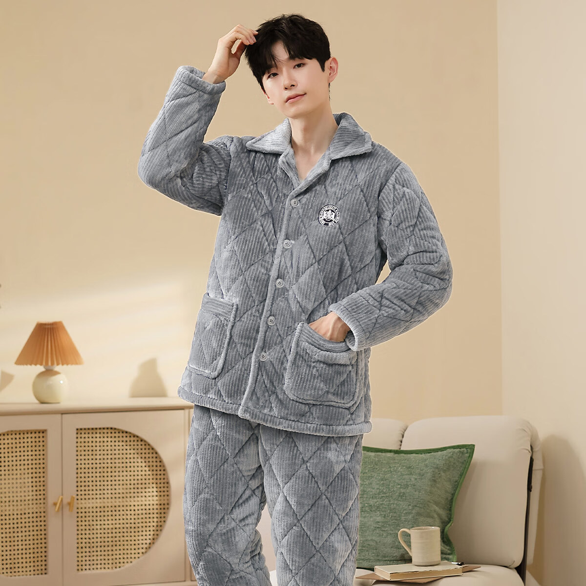 香蜜闺秀【三层夹棉加厚】男士睡衣秋冬新款长袖可外穿保暖男士家居服套装 卡其 XL