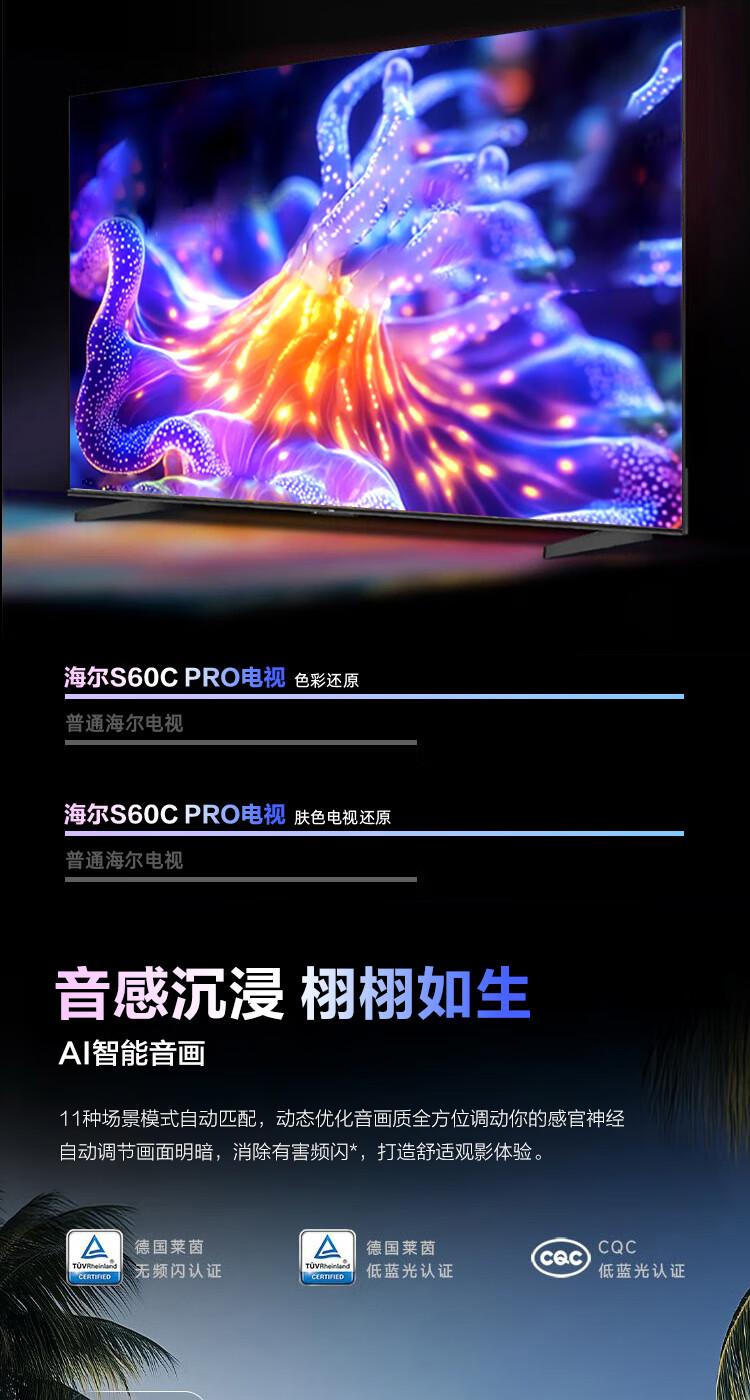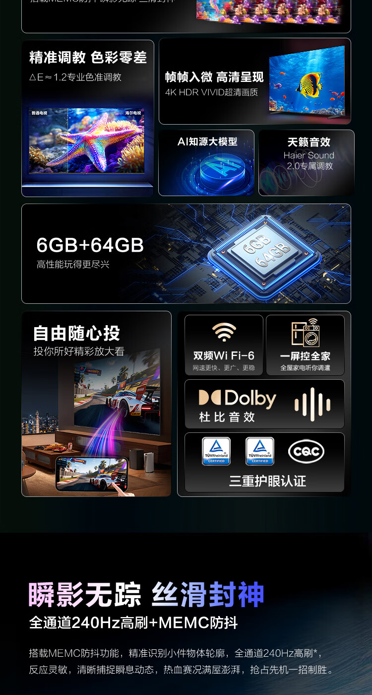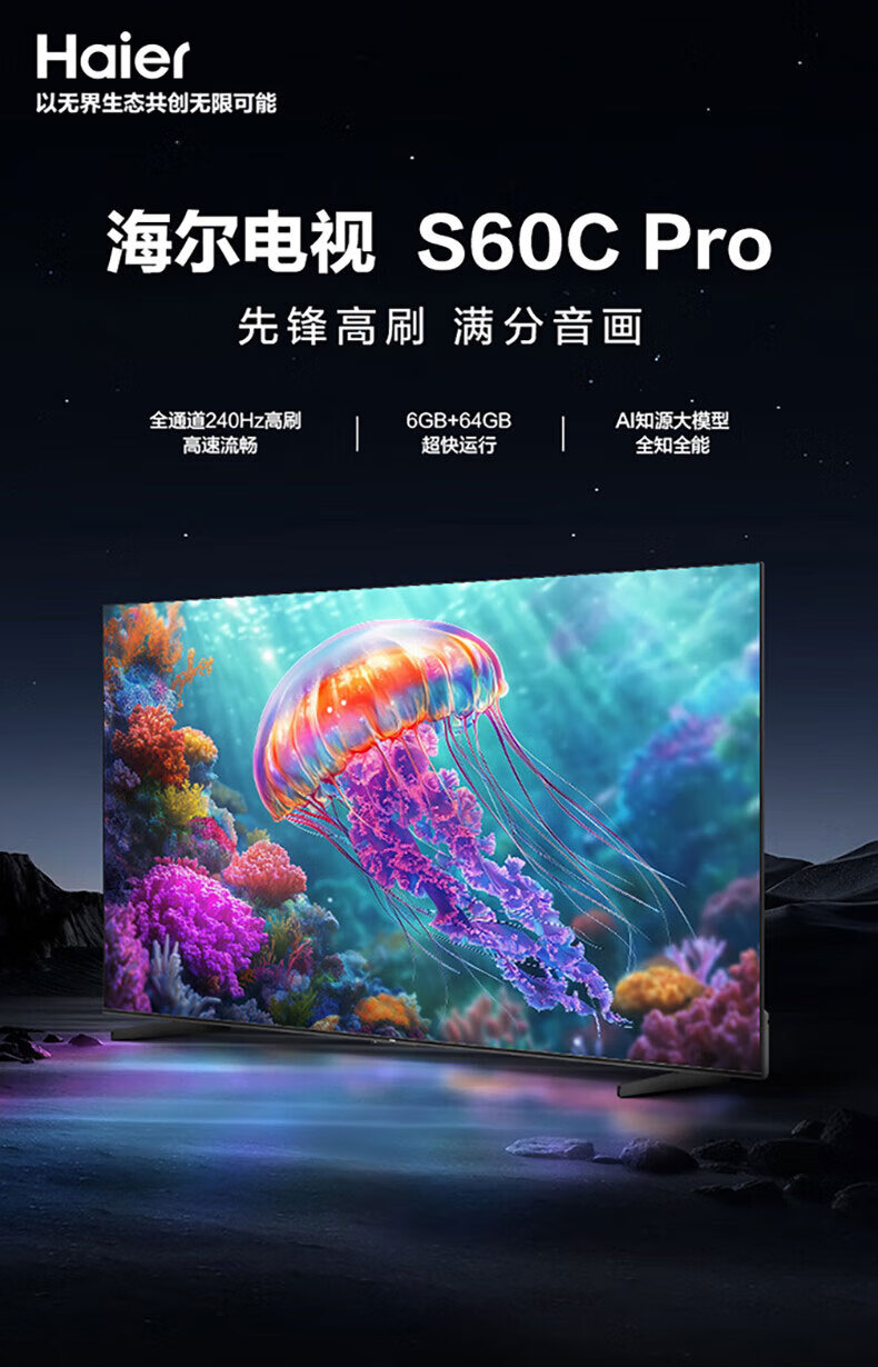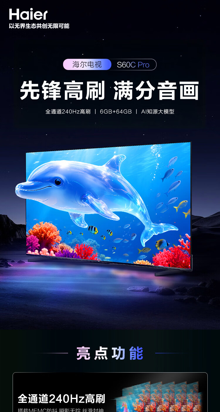 海尔(Haier)电视新品S60C 全通道240HZ高刷6+64G大内存 双频WiFi6 AI智慧屏彩电液晶4K护眼超薄游戏电视 65英寸 新品240HZ高刷6+64G三重护眼 咨询领惊喜