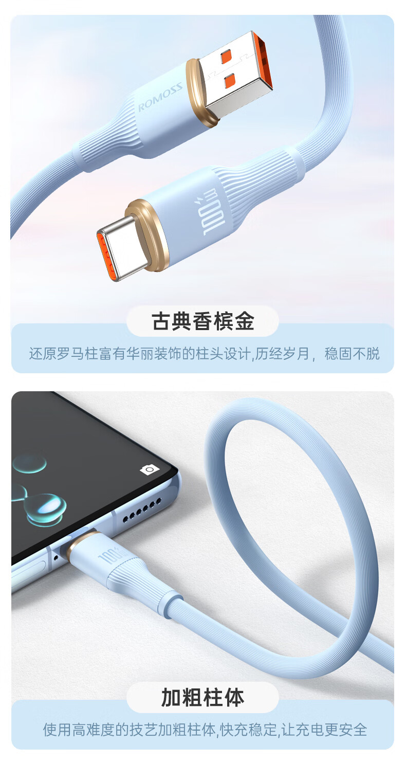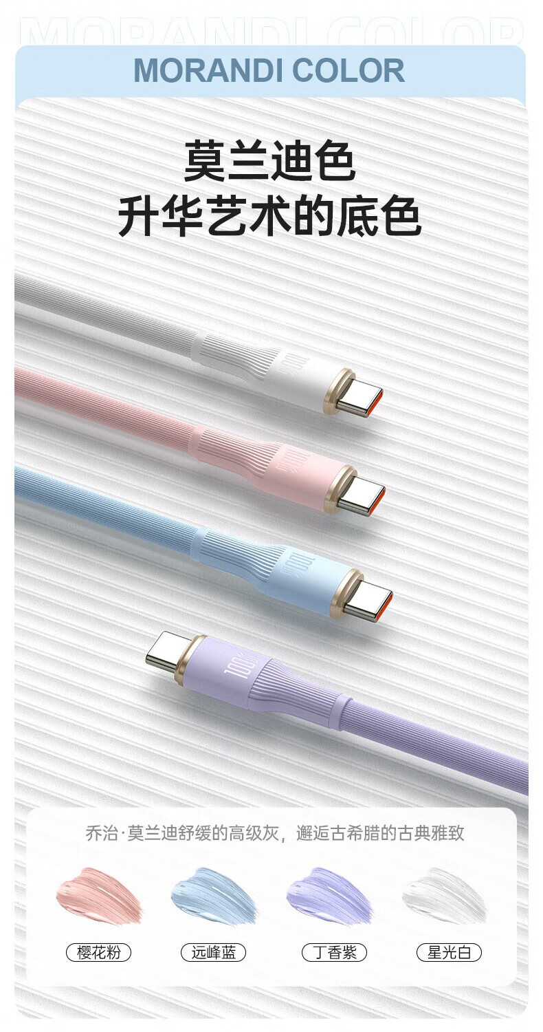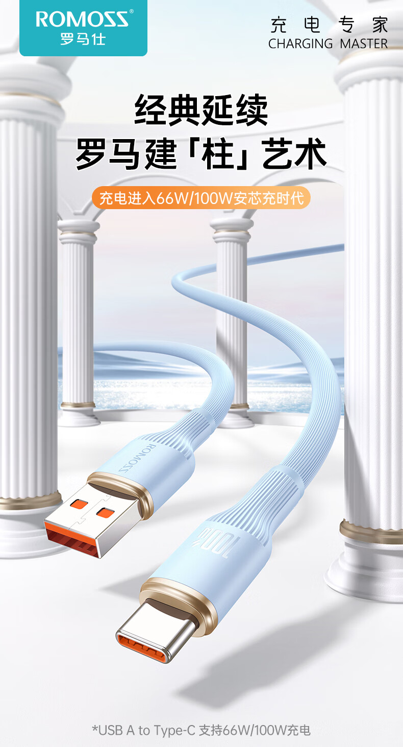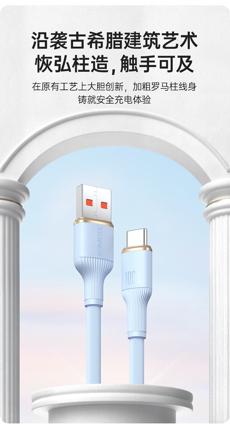 罗马仕Type-C数据线6A超级快充100W/66W充电线适用华为Mate60小米荣耀平板安卓手机车载线 星光白【100W快充】1.2m