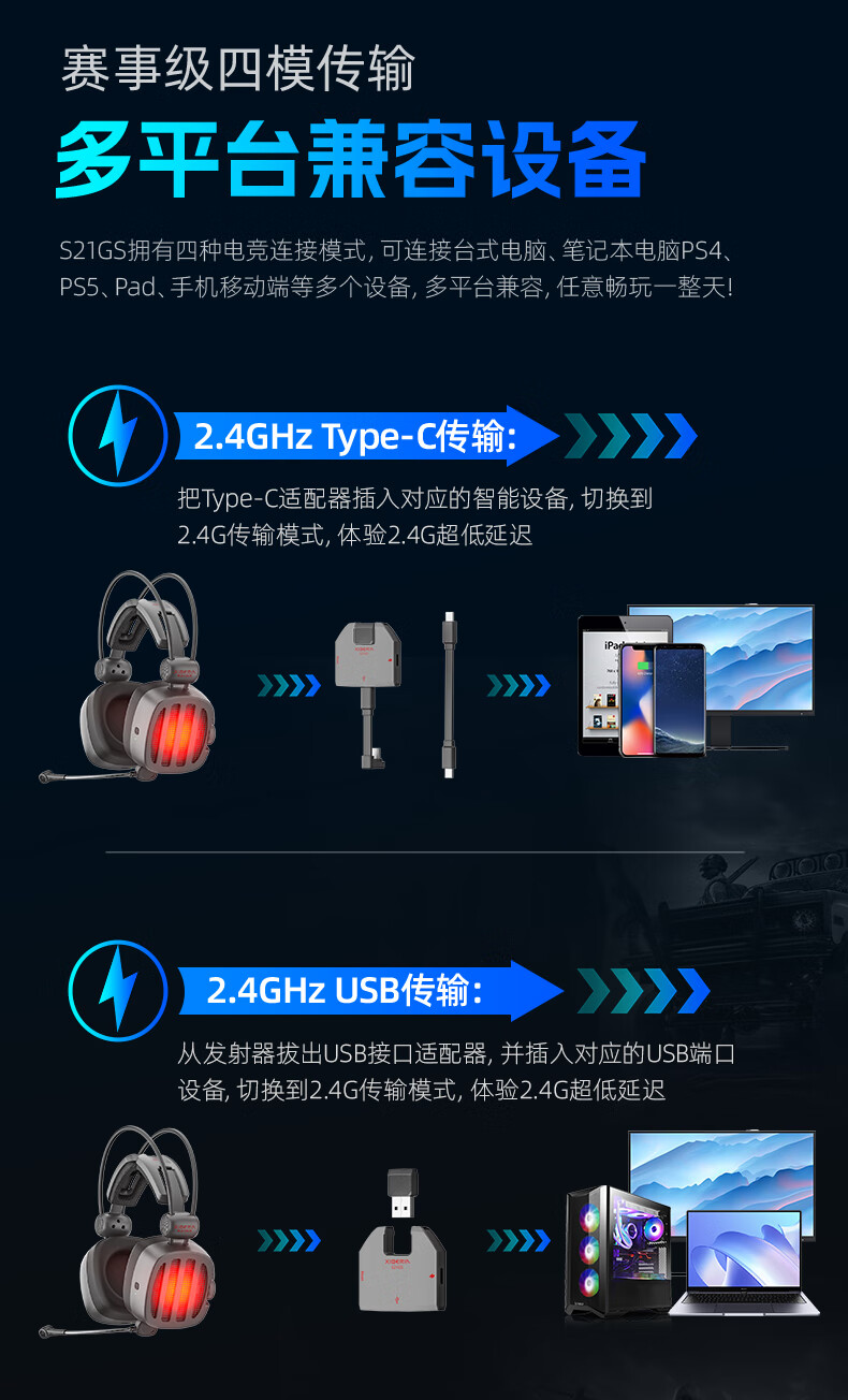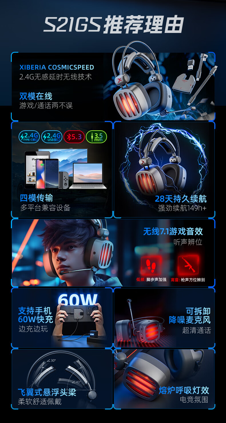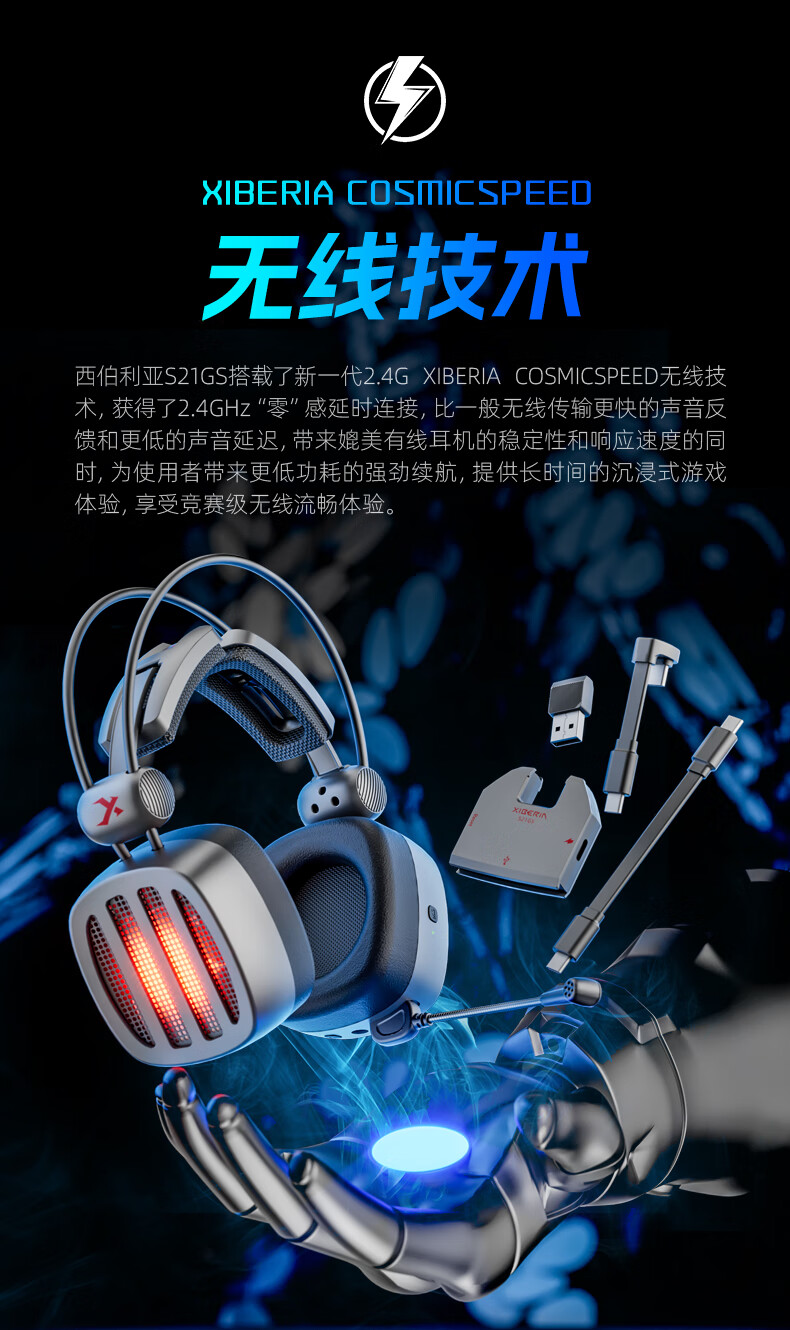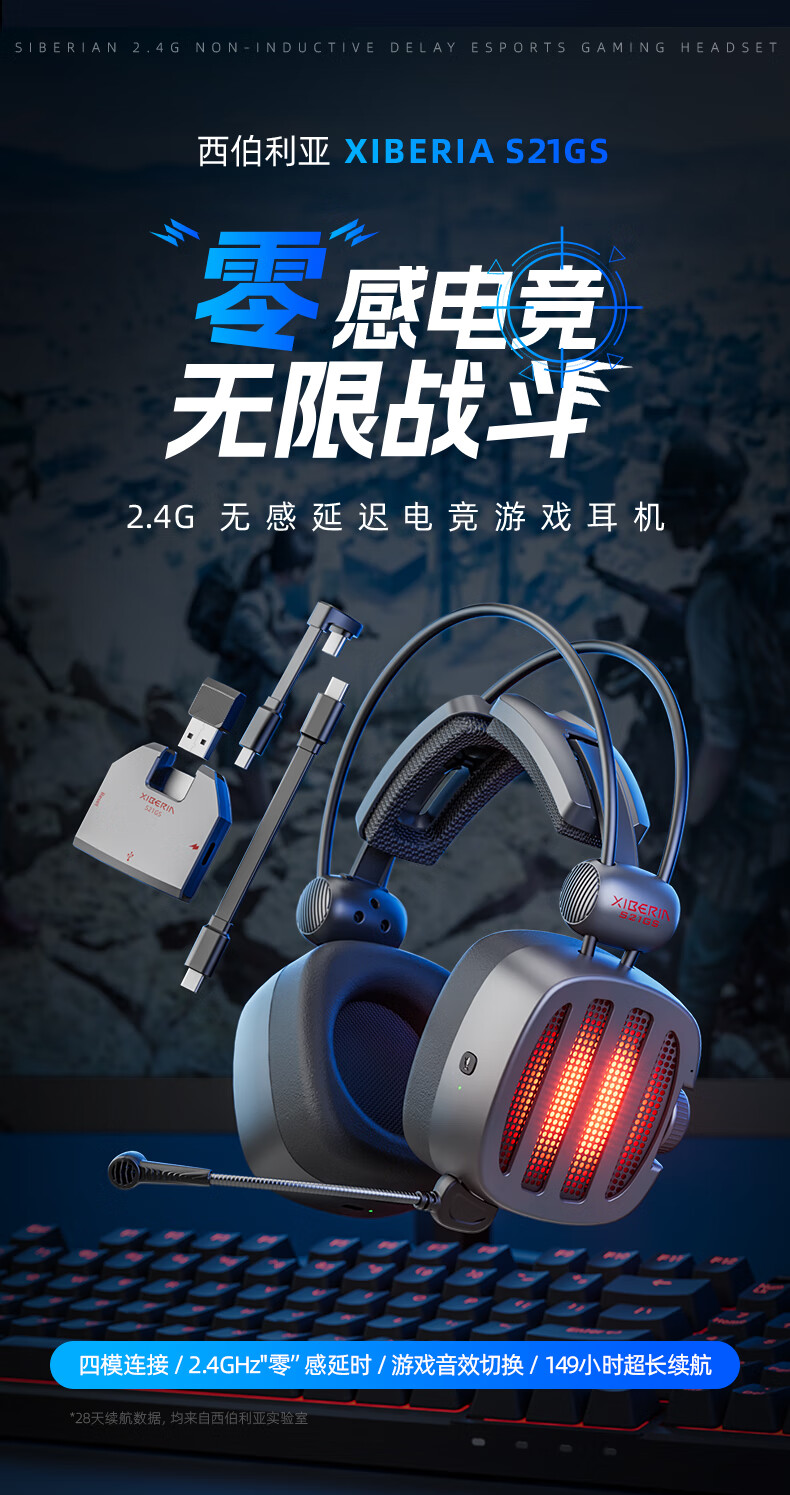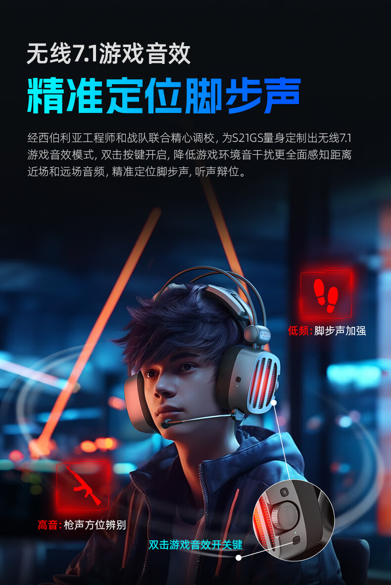 西伯利亚(XIBERIA)S21GS 2.4G四模无线游戏耳机头戴式 电脑电竞蓝牙耳麦 7.1声道不求人主播吃鸡听声辨位绝地求生 S21GS铁灰【2.4G无线四模】