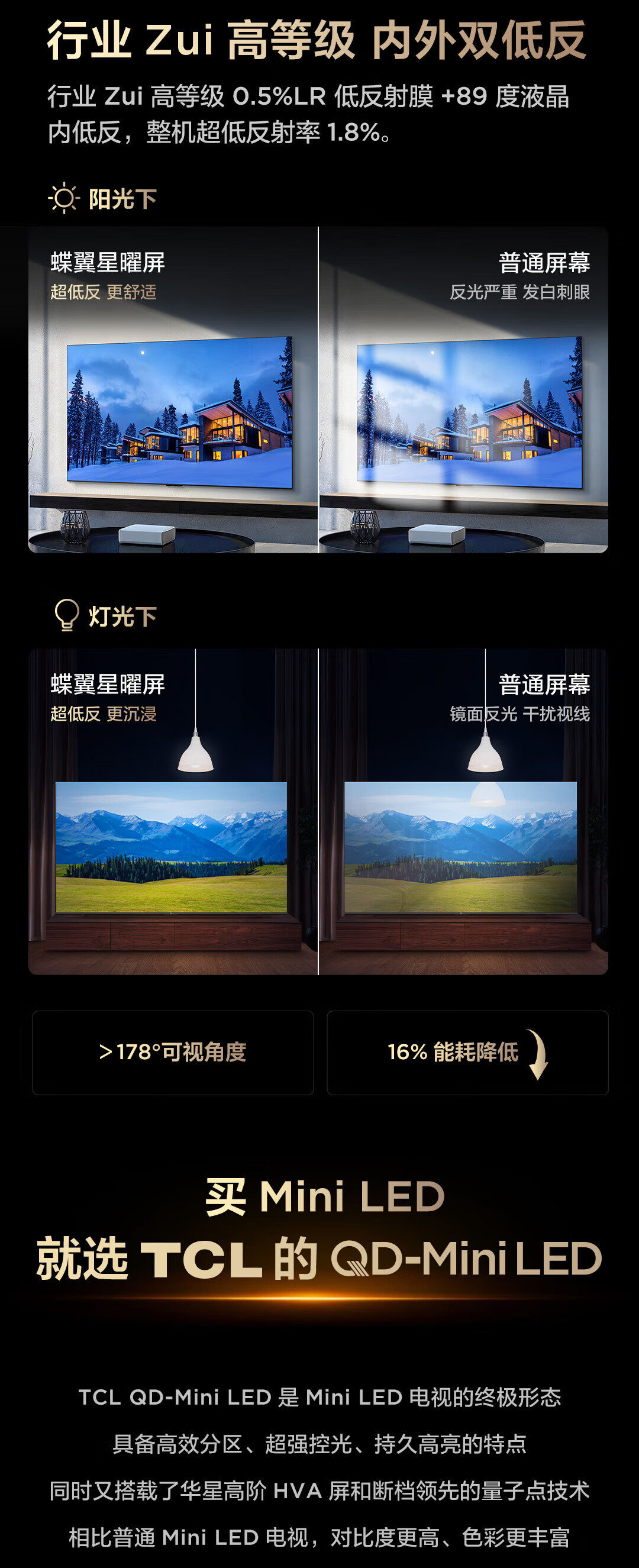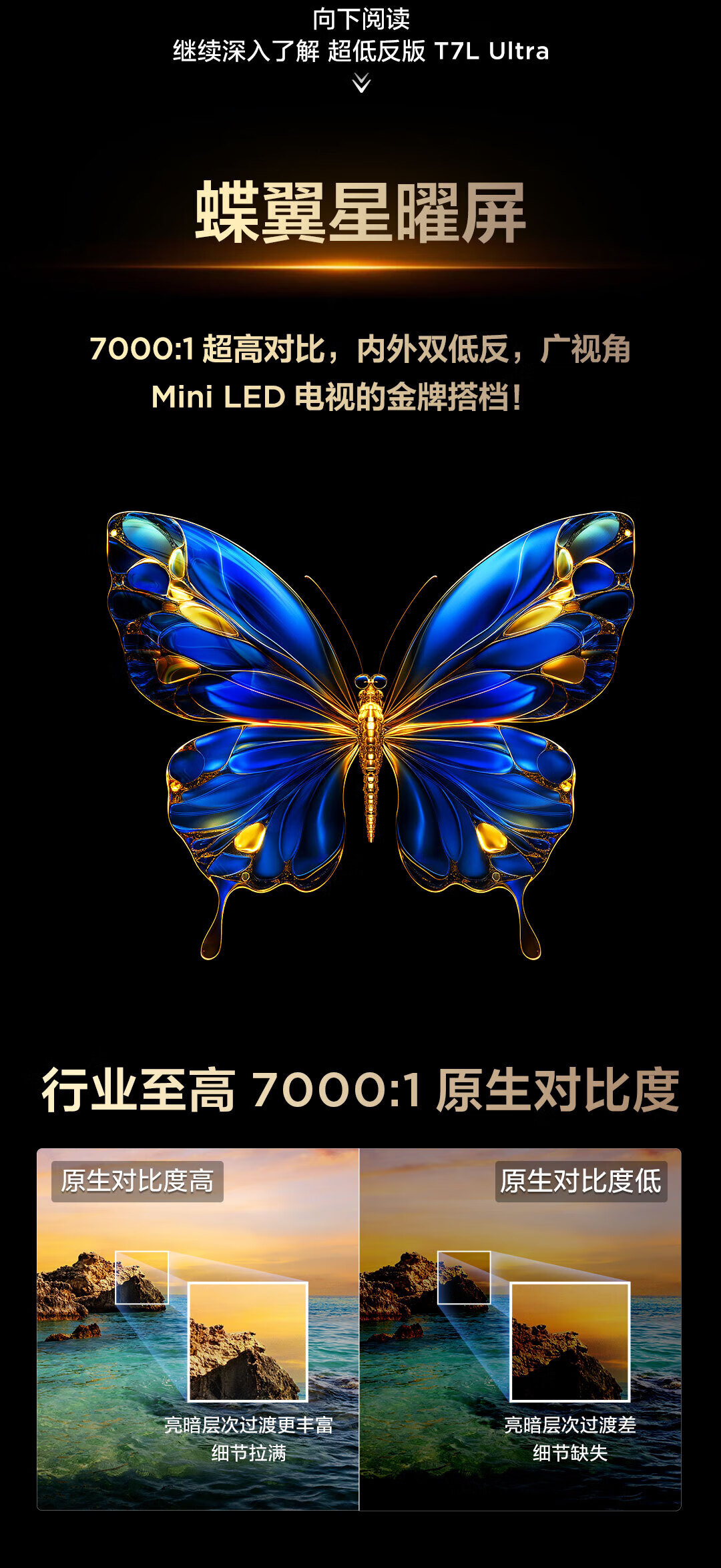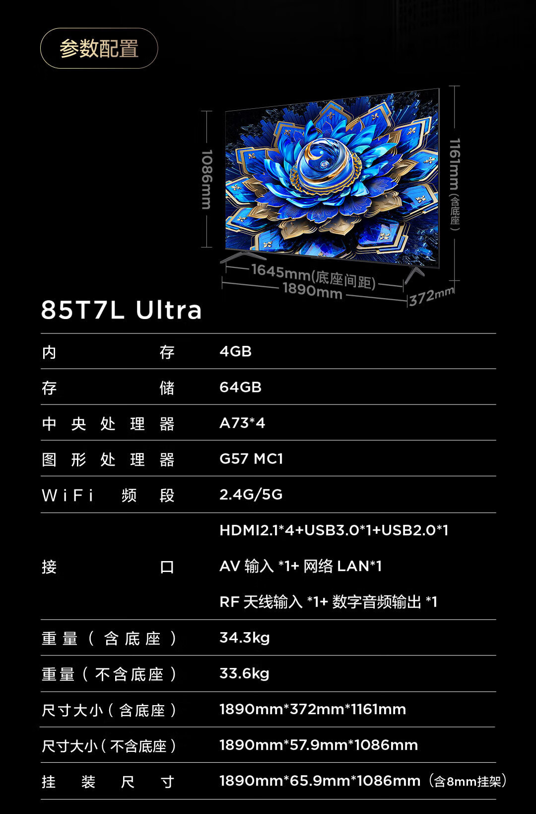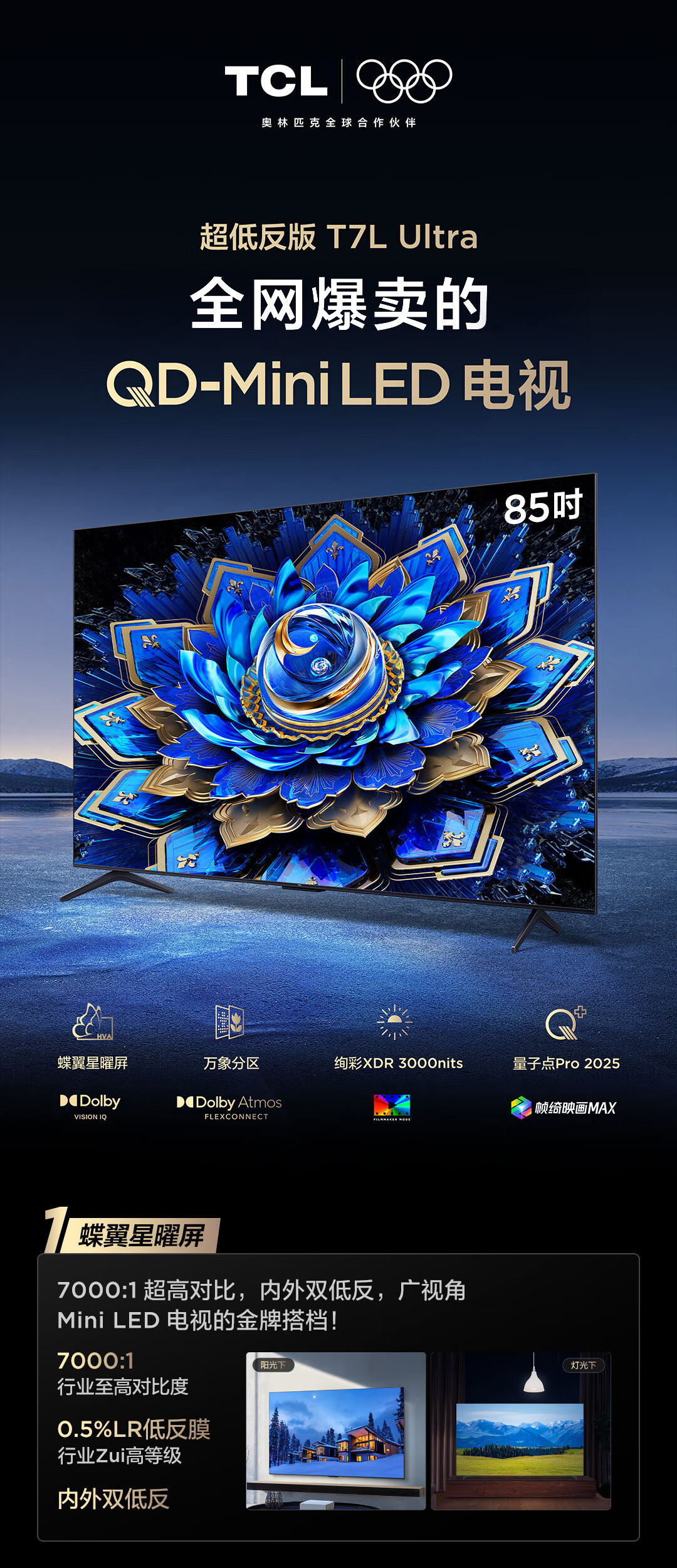 TCL电视 85T7L Ultra 85英寸 QD-Mini LED 蝶翼星曜屏 万象分区 绚彩XDR 3000nits 超薄 国家补贴 85英寸