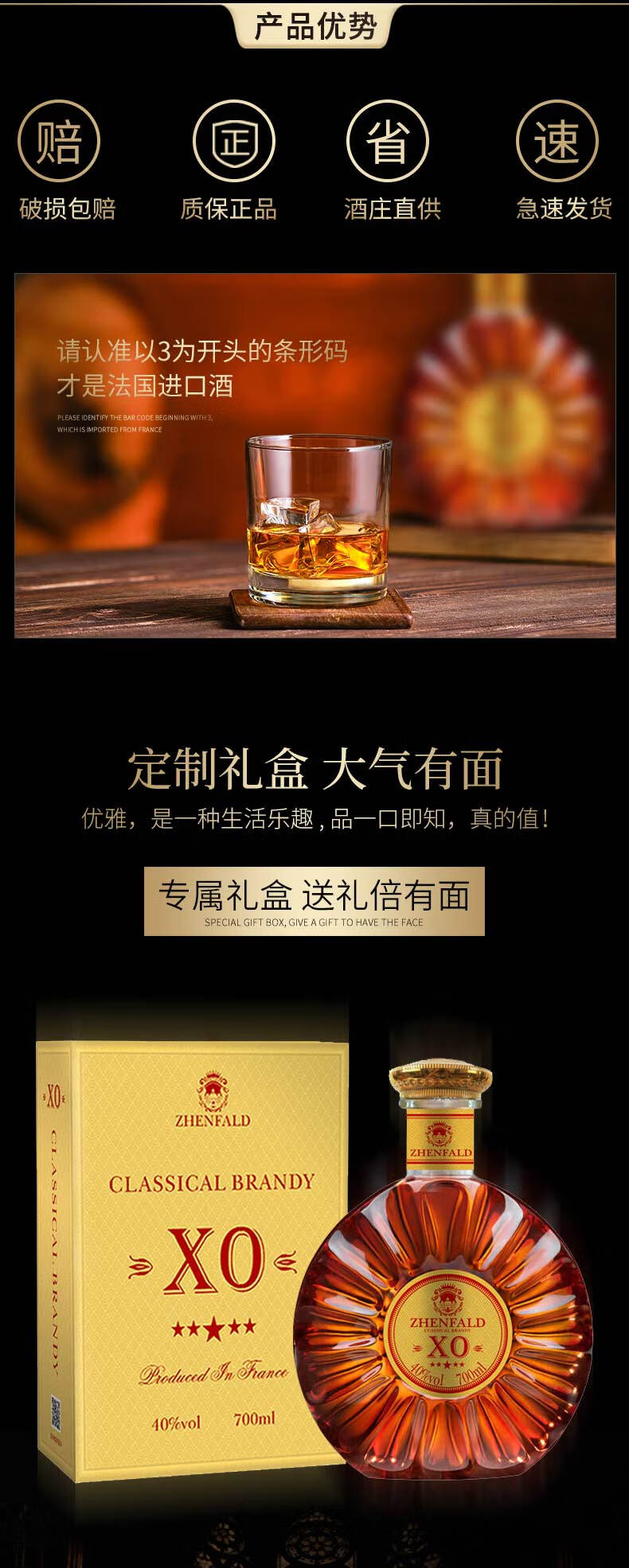 禛富40°法国进口XO白兰地XO 700mL 700mL 1瓶 礼盒 700mL 1瓶 精装