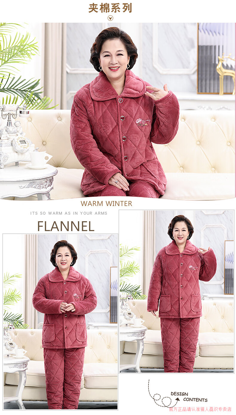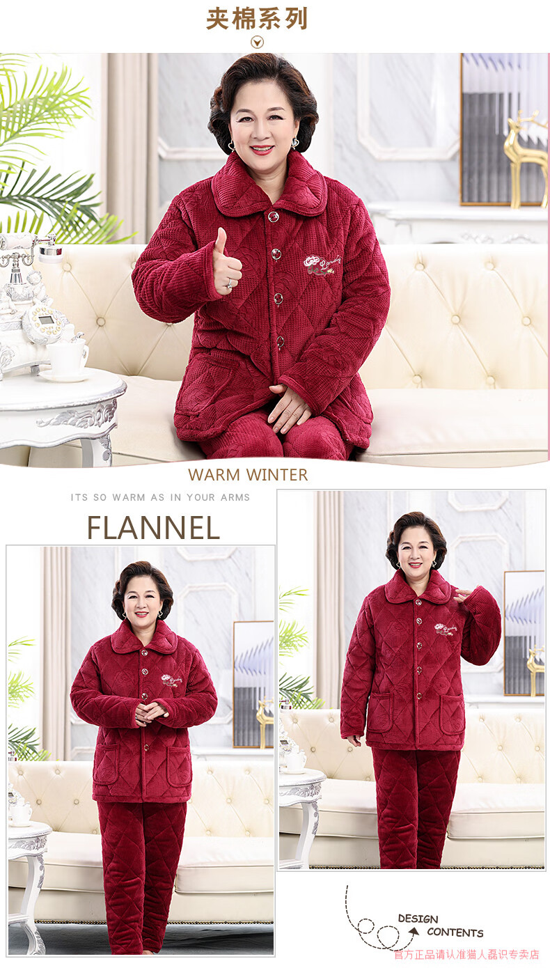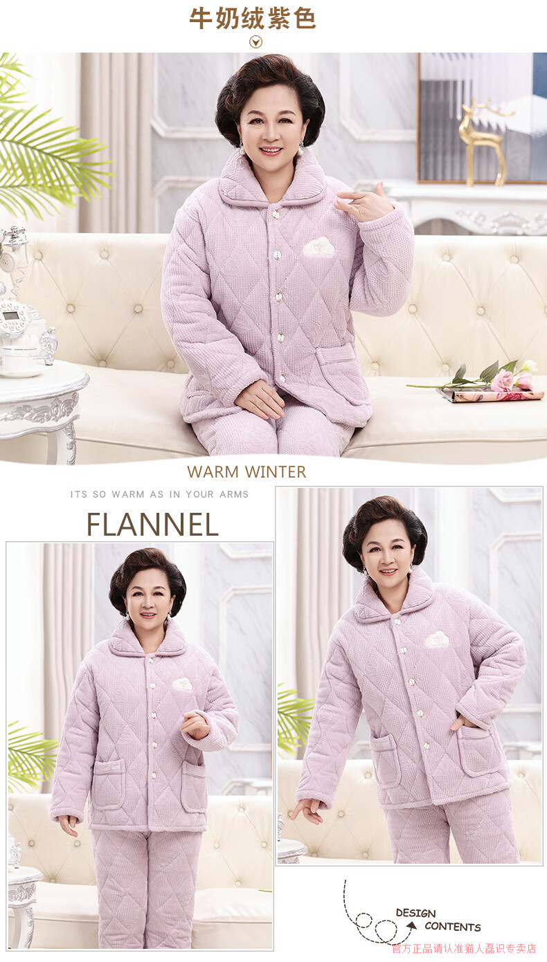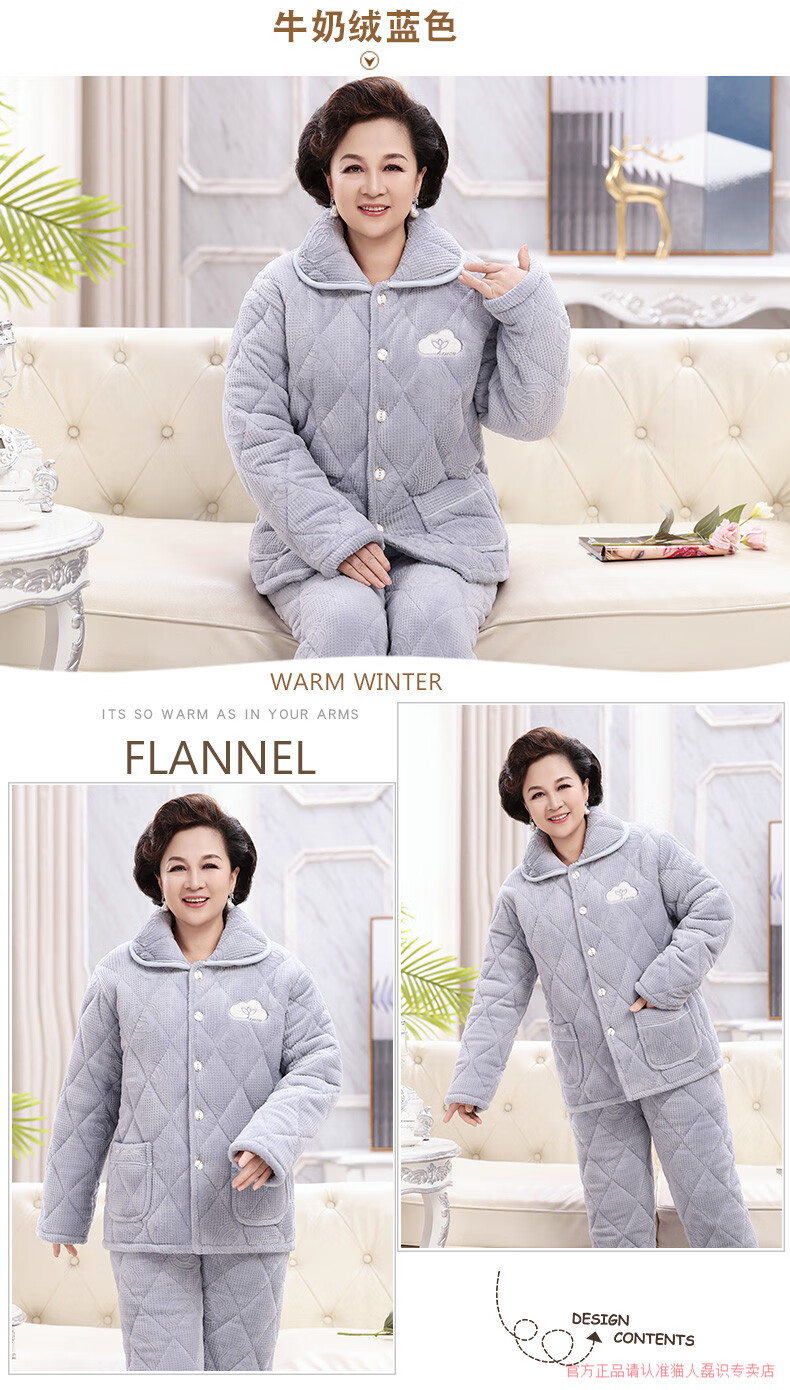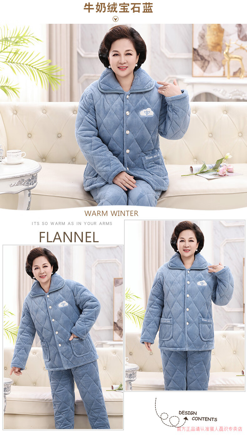 猫人(MiiOW)睡衣女冬季加厚牛奶绒三层夹棉保暖中老年妈妈装珊瑚绒家居服冬款 牛奶绒宝石蓝 3XL 高170-175重150-175