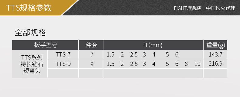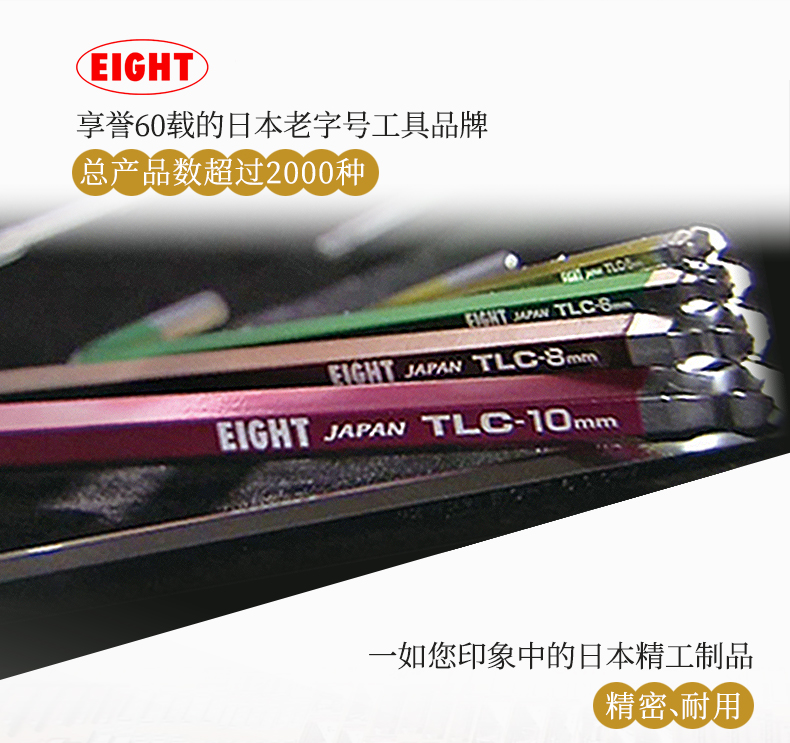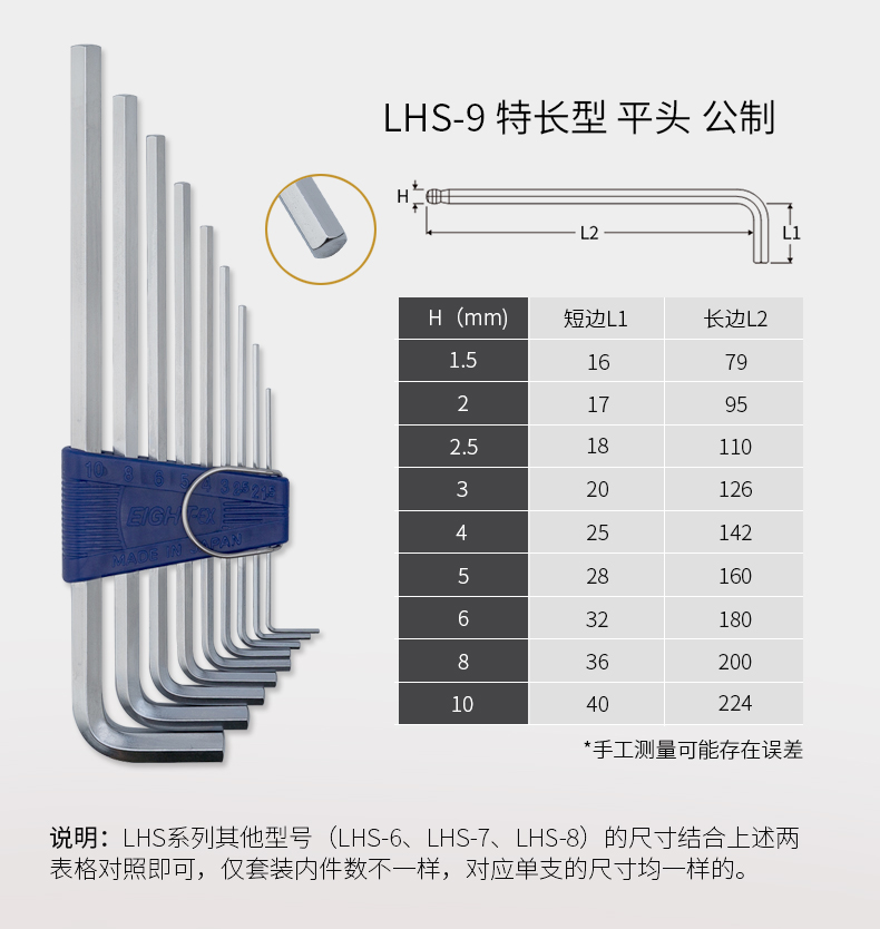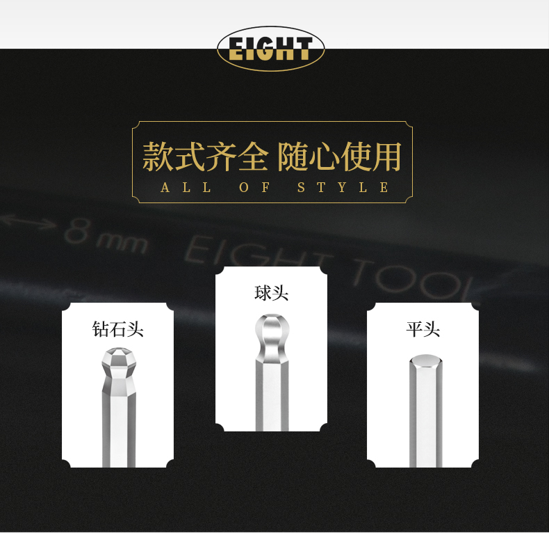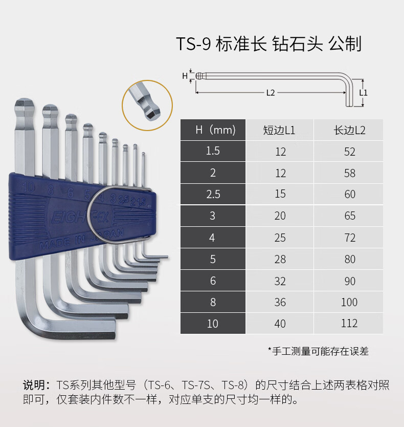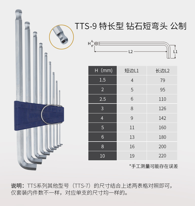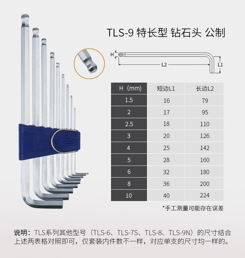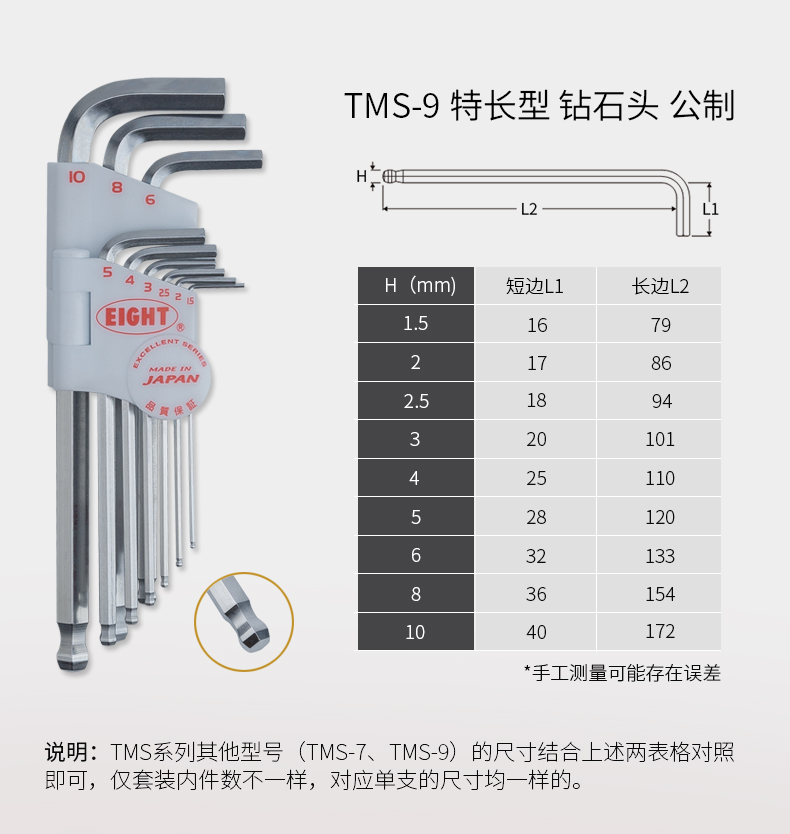 EIGHT日本原装进口百利内六角扳手套装加长6角匙螺丝刀六方六棱工具 公制钻石头9件套特长型TLS-9