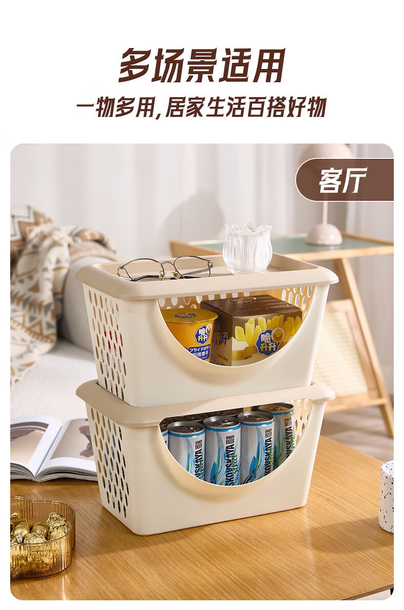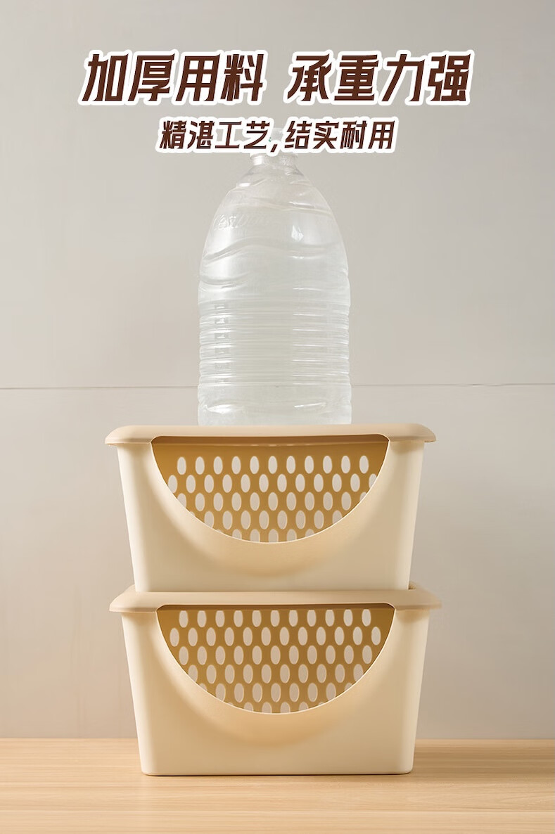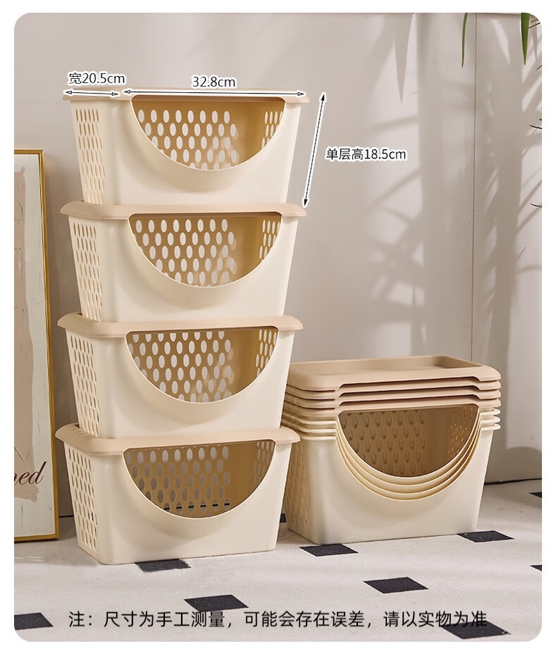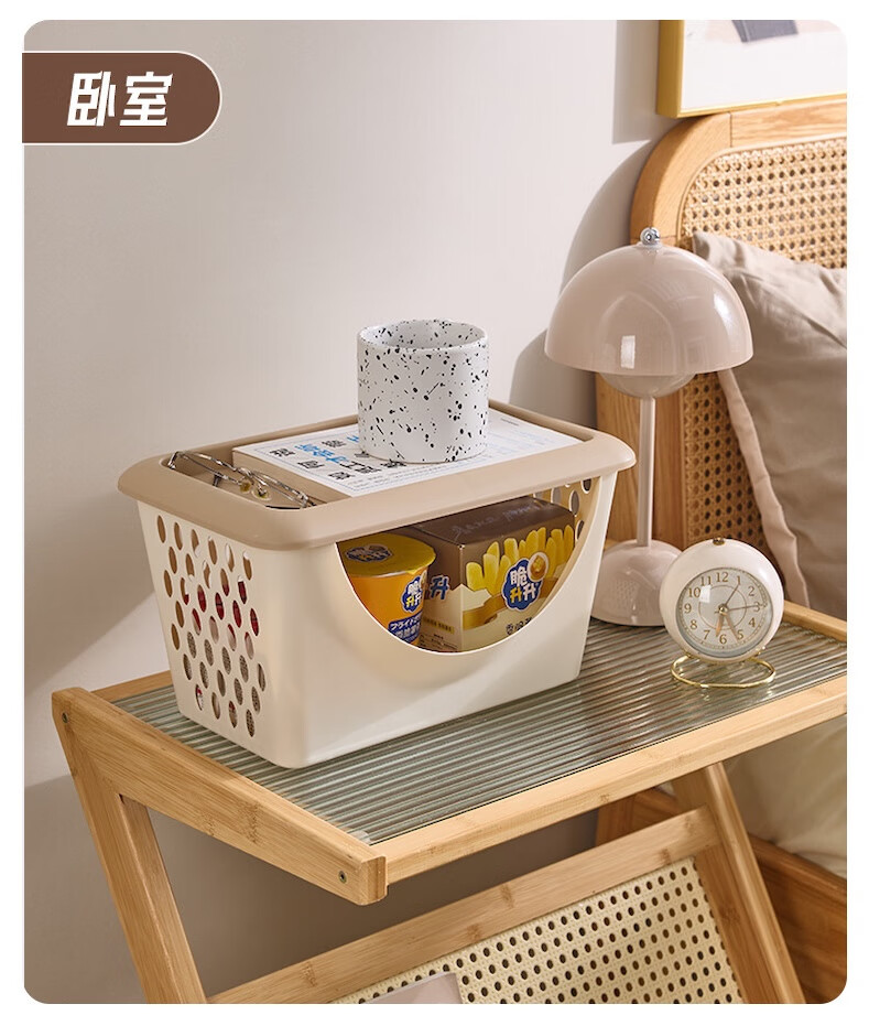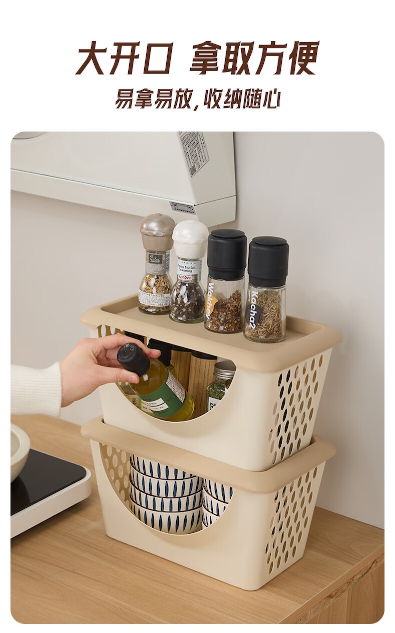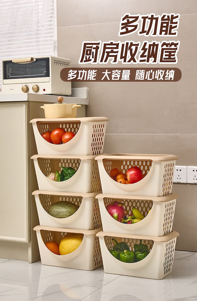 厨房收纳筐带盖水果蔬菜杂物筐子塑料筐家用篮子桌面小杂物收纳盒 带盖多功能收纳筐 32.8*20.5*18.5cm 米色 1个