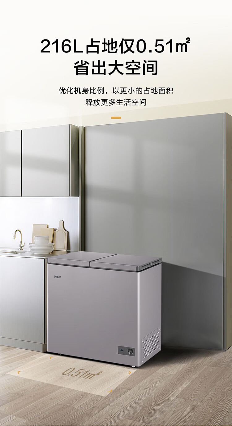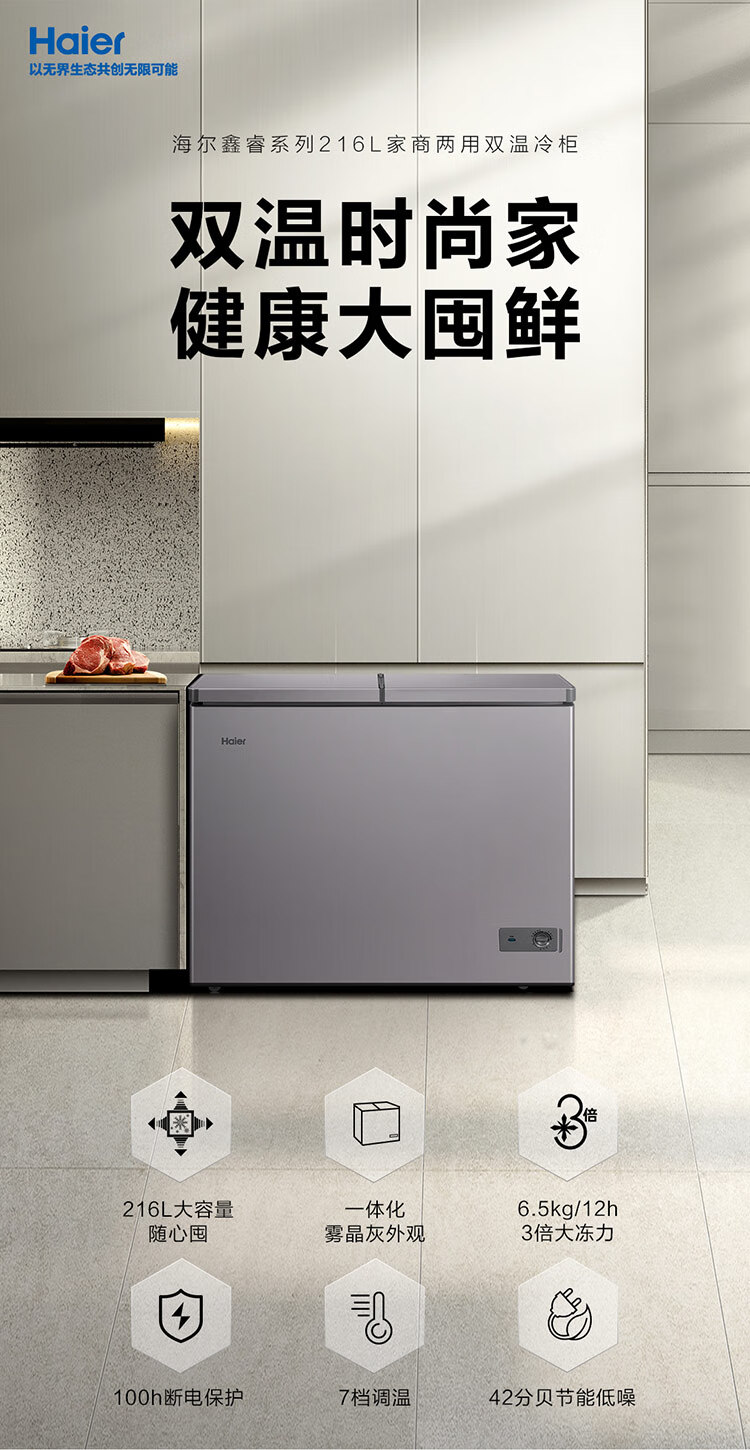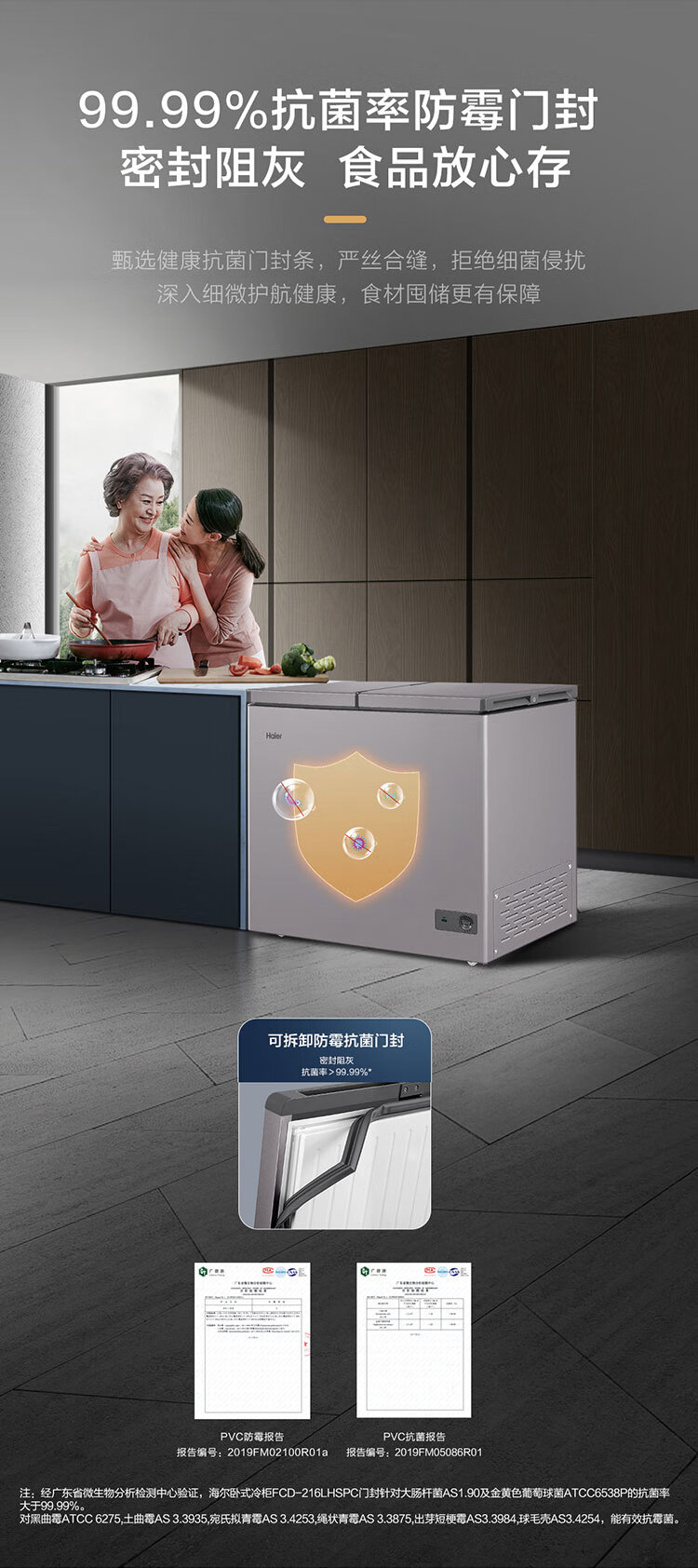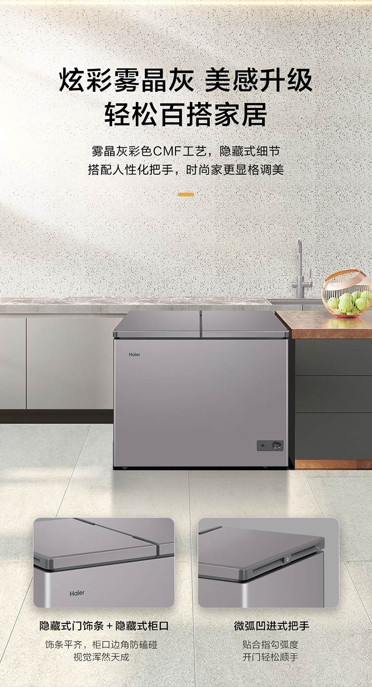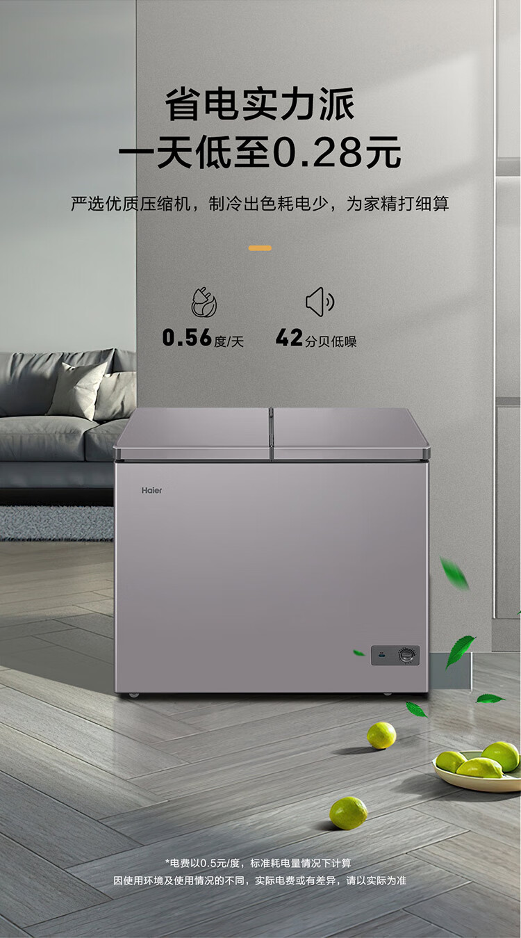 海尔(Haier)冰柜家用减霜一边冷藏一边冷冻家用商用两用双温柜节能省电 炫彩雾晶灰 216L 双重抑菌+约装302斤