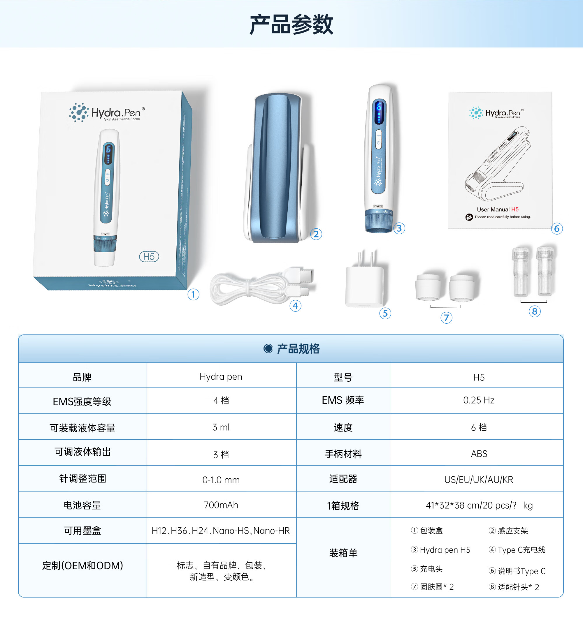 HYDRA.PENH5新款电动微针EMS微电流MTS中胚层导入Hydra pen H5 家用水光导入仪米诺上药器 仪器+50个任选头(需备注)+面膜+ma贴+操作包