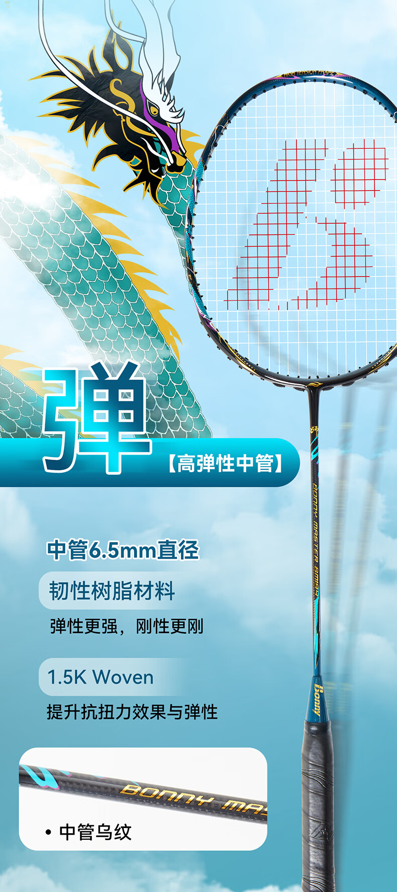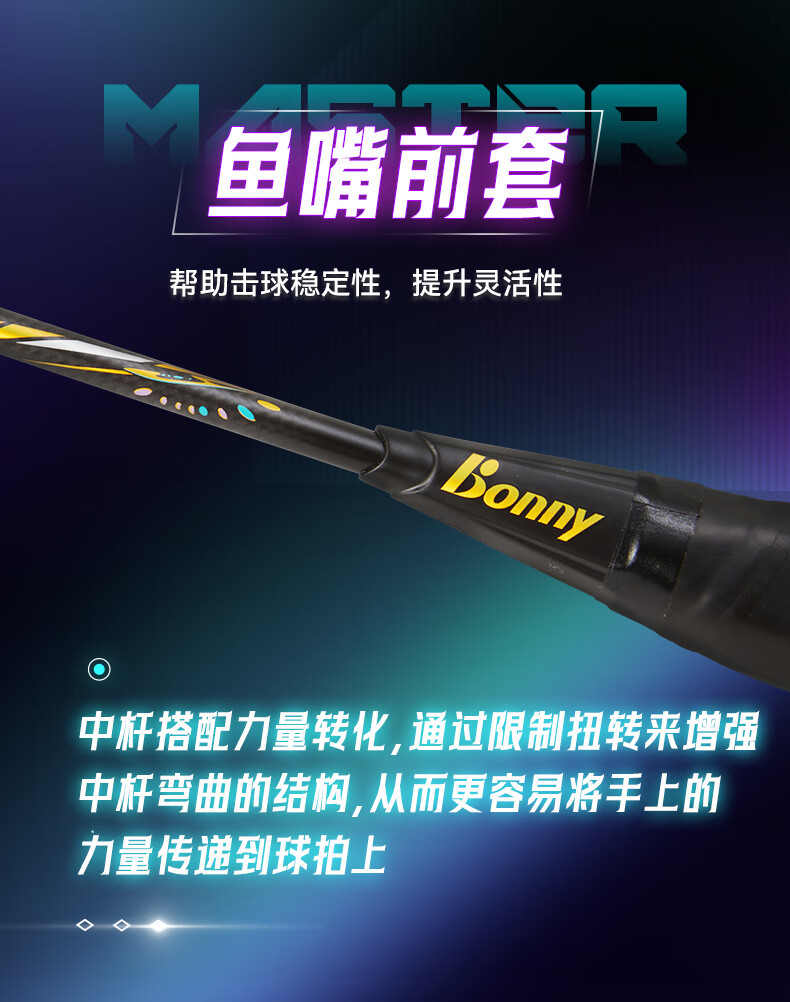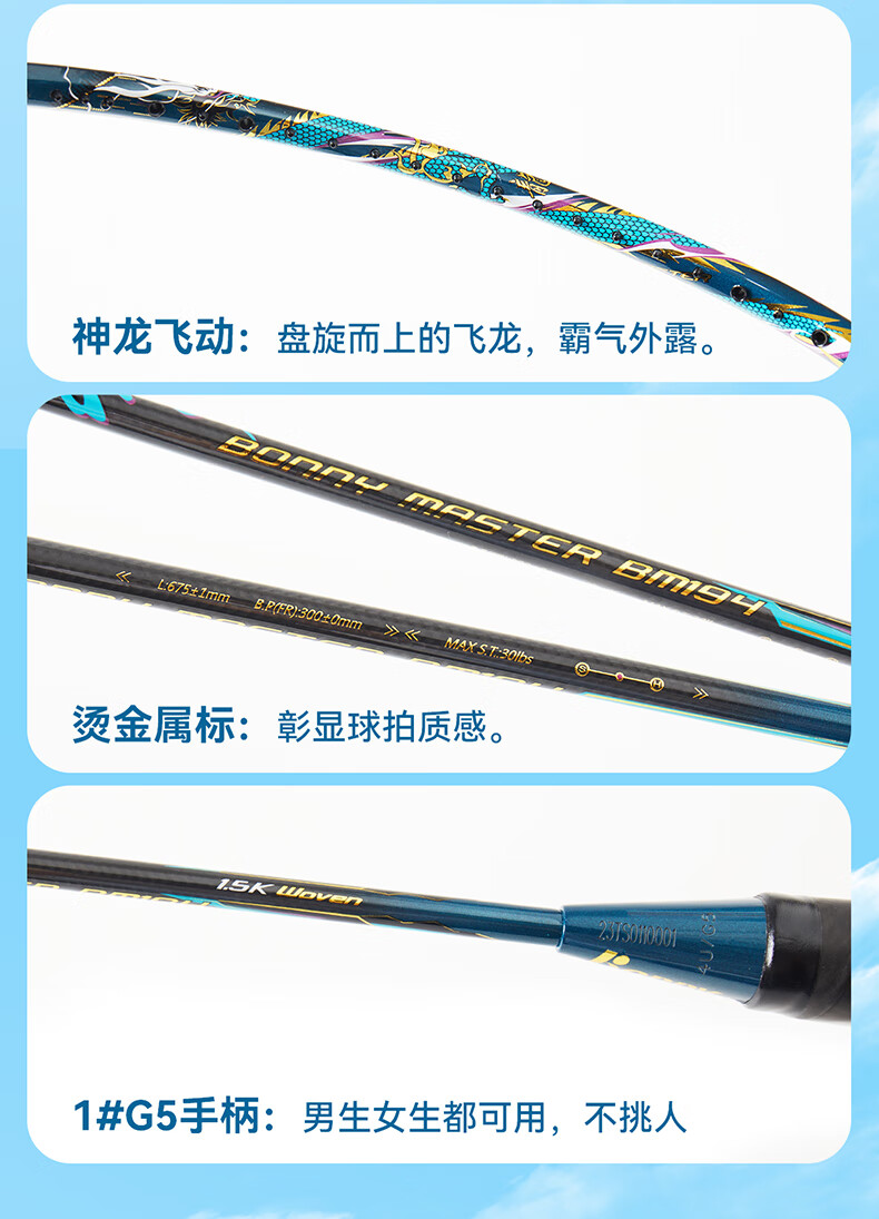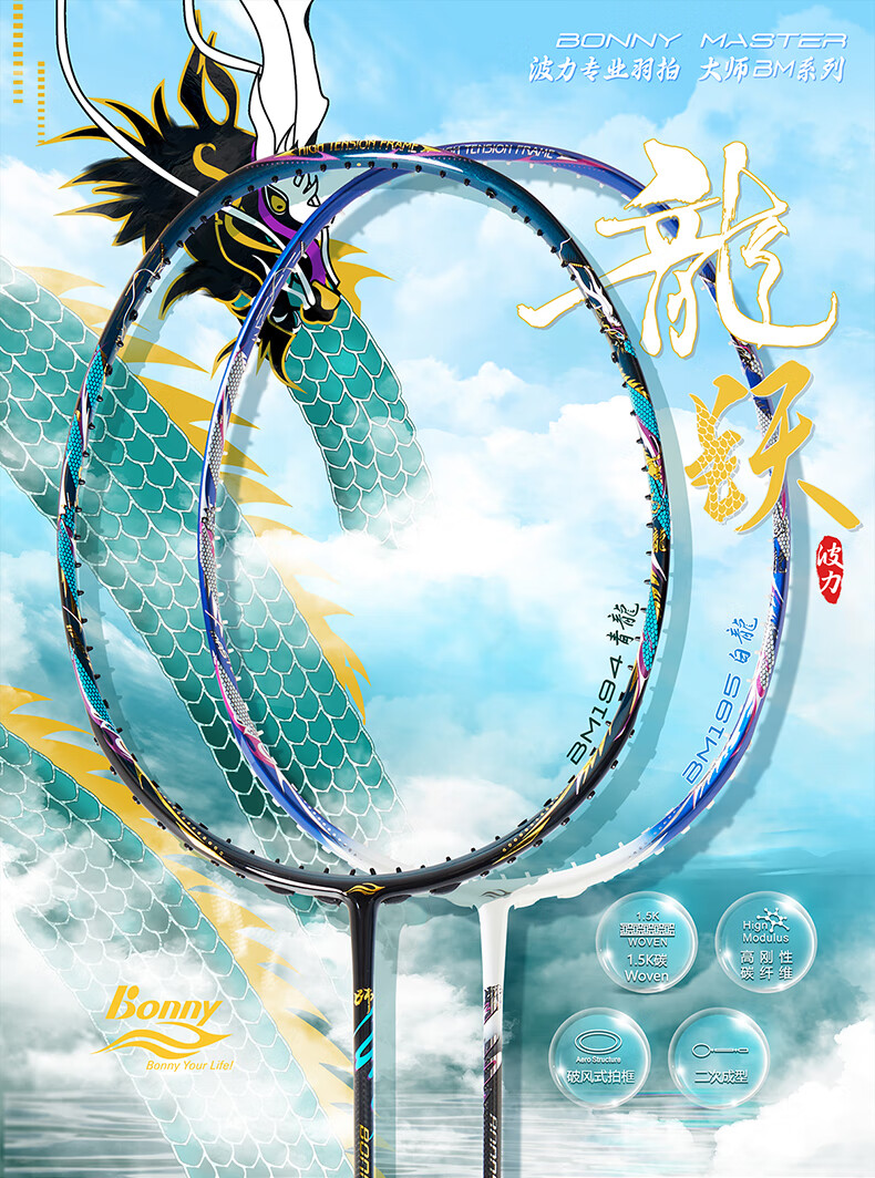 波力(Bonny)大师BM027-028青龙白龙全碳素进攻破风高弹中管进阶高手羽毛球拍 BM195/2BD2161040E 要空拍请留言 3U