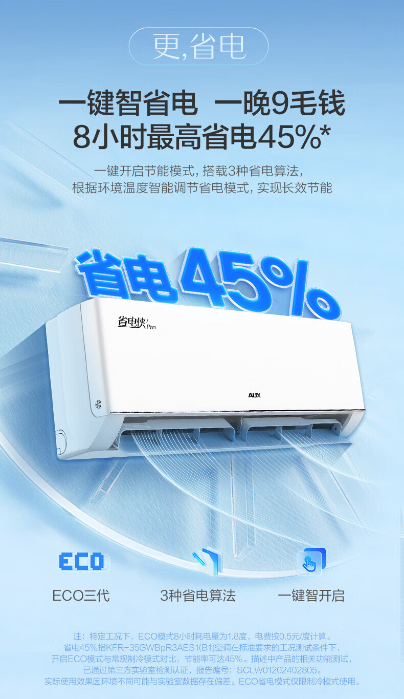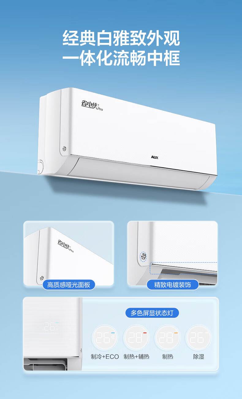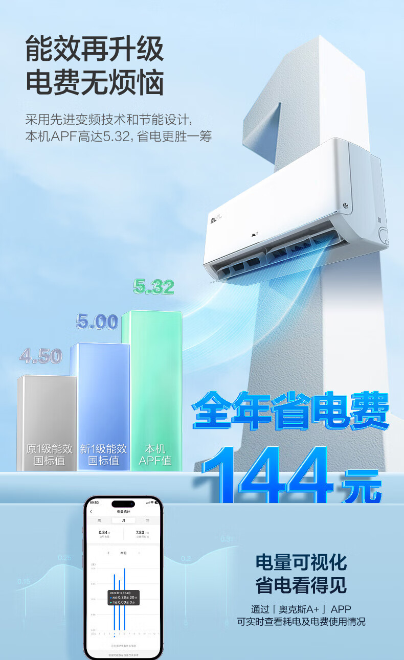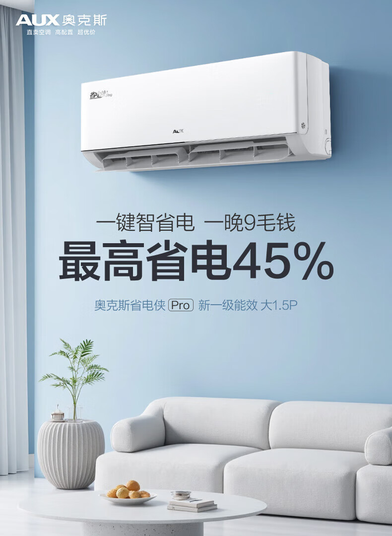 奥克斯大1.5匹 省电侠Pro 大1匹新一级能效 WiFi语音智控 家用变频冷暖两用 挂壁式空调挂机 大1匹 一级能效 省电侠PRO 省电45%
