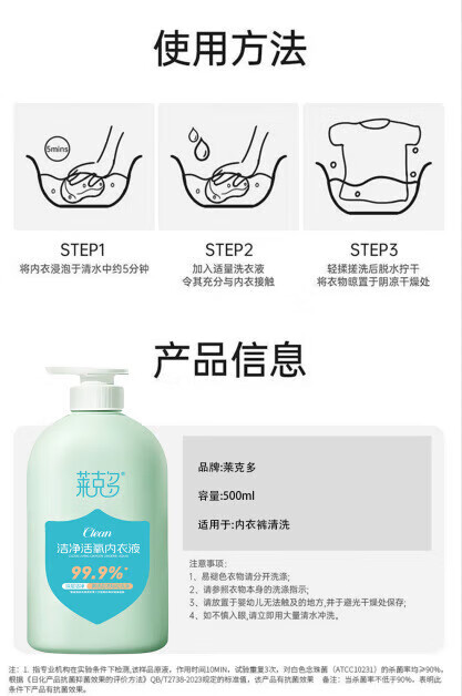 莱克多内衣洗衣液菌去血渍抑专洗内裤 洁净活氧内衣净500ml*1