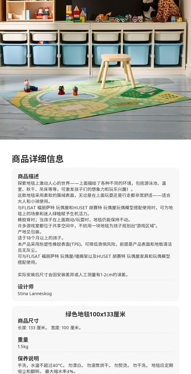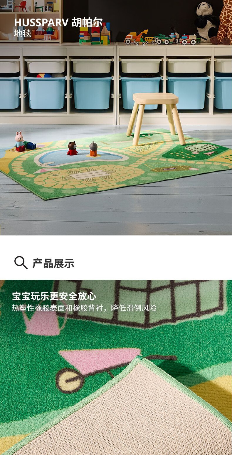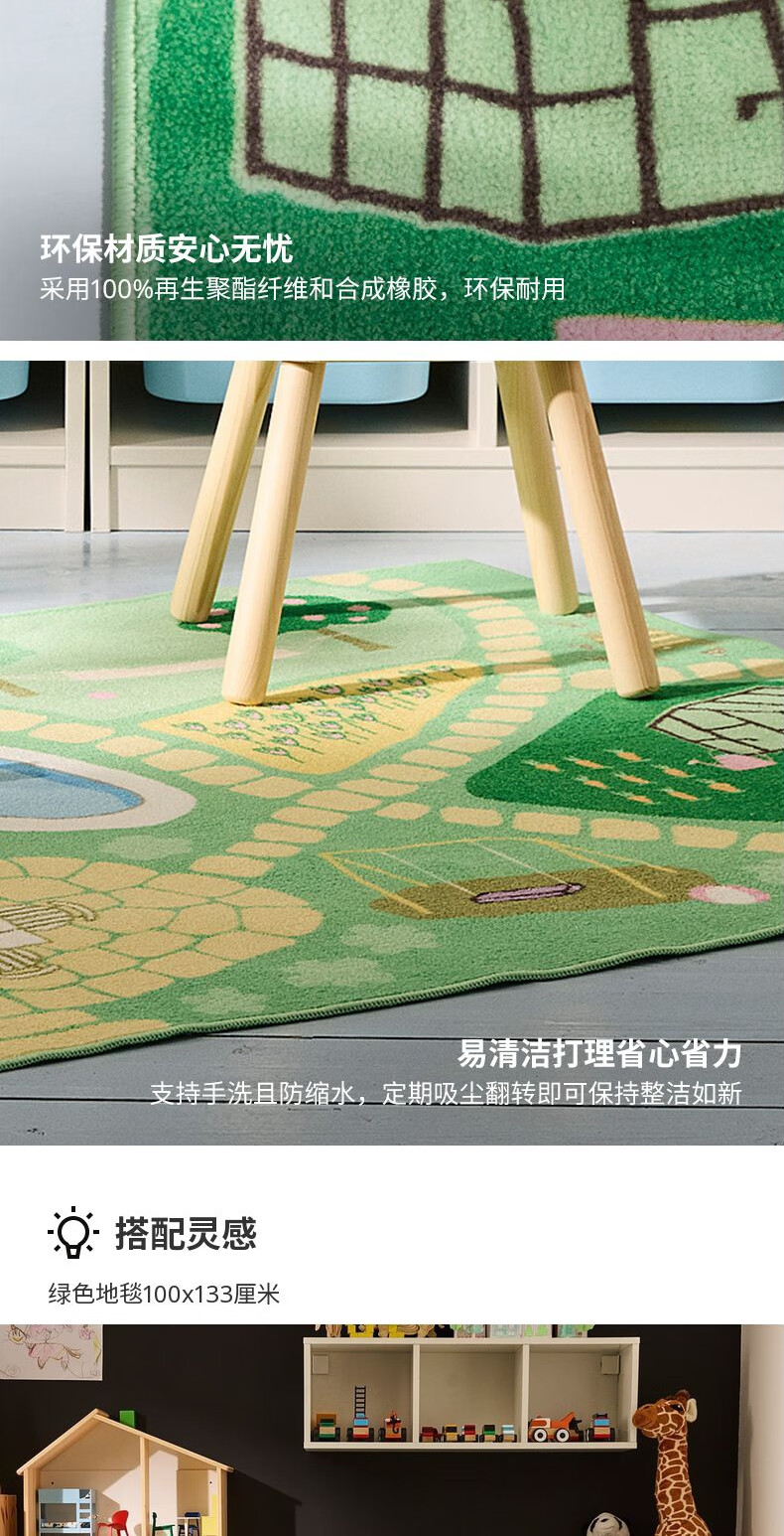 宜家(IKEA)【新品】HUSSPARV胡帕尔儿童地毯防滑玩耍宝宝爬行儿童房 绿色地毯100x133cm