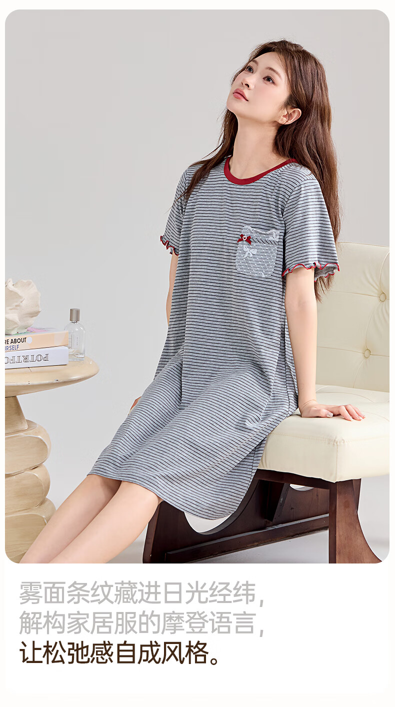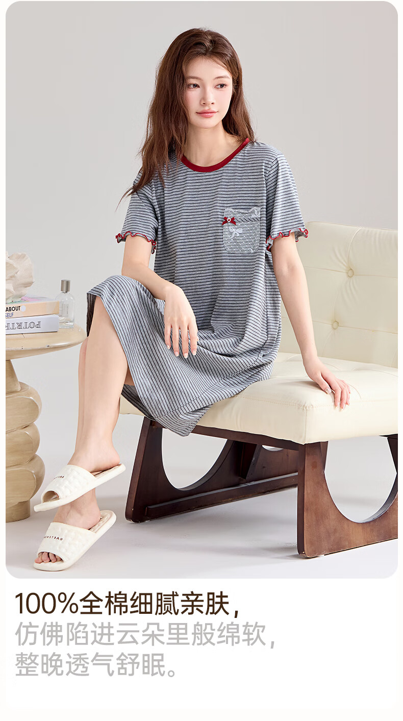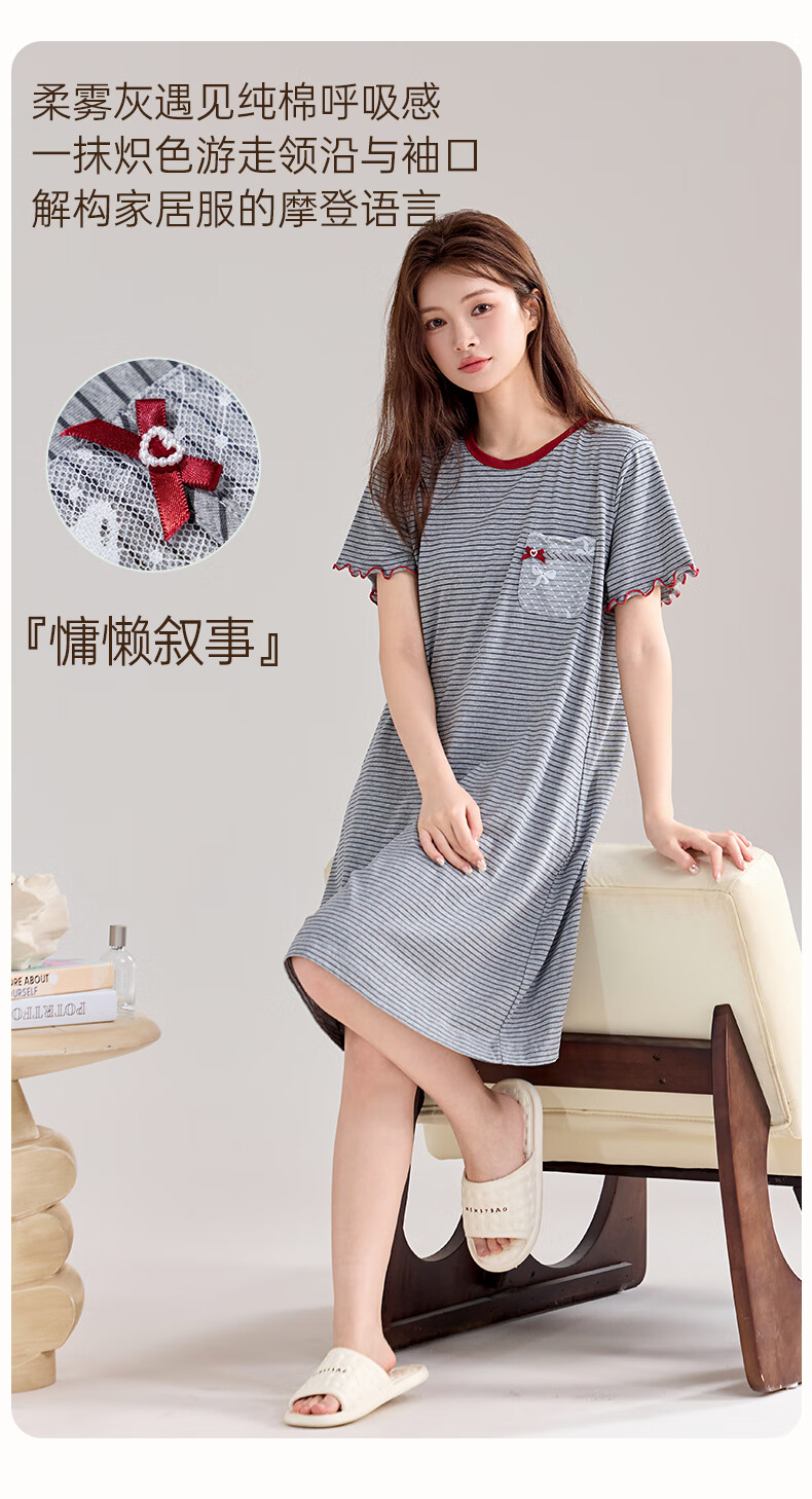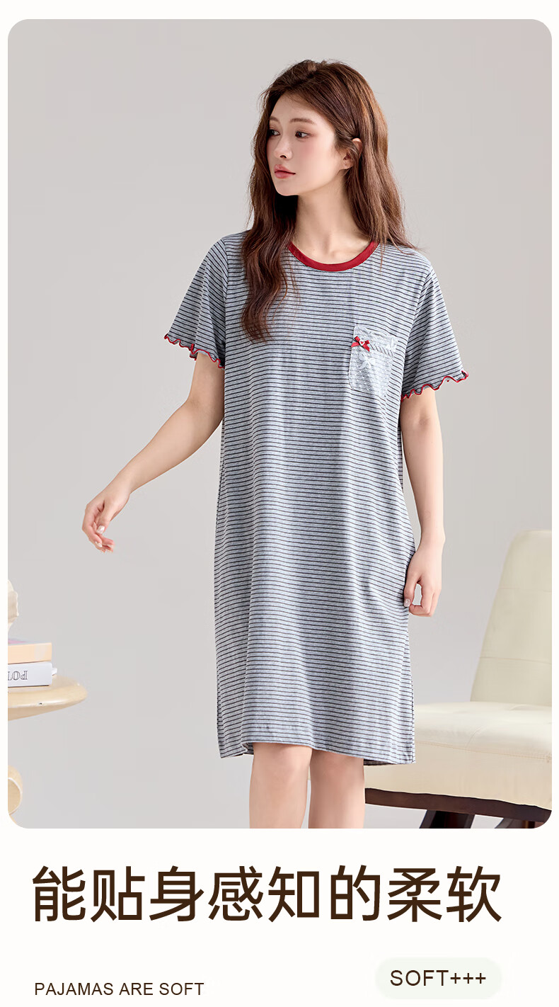 玛伦萨纯棉短袖睡裙女2025新款条纹连衣裙大码夏季薄款女士家居服 花灰 L