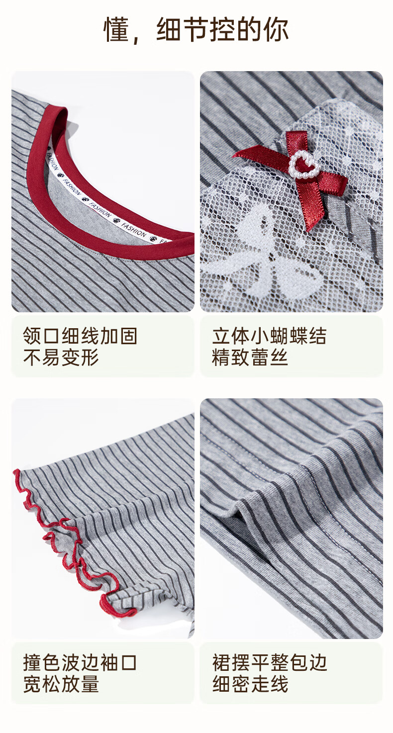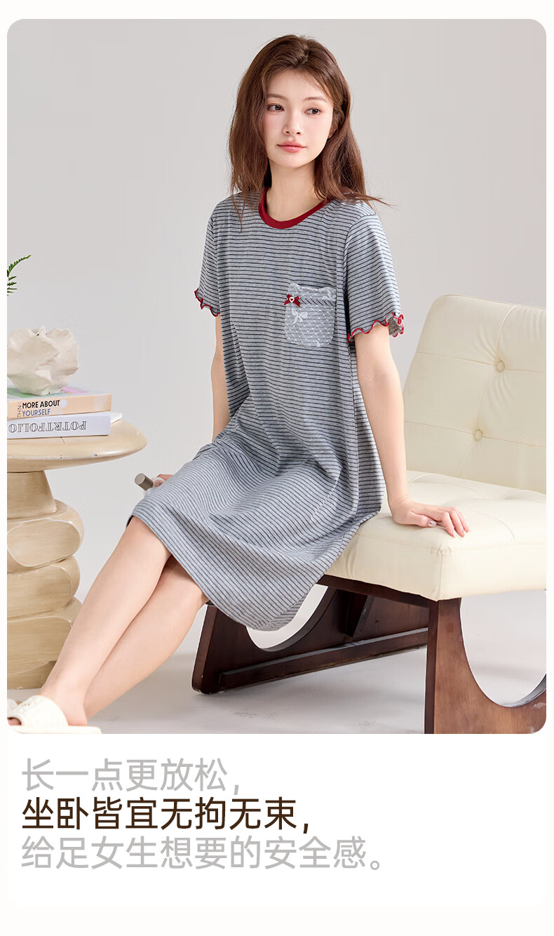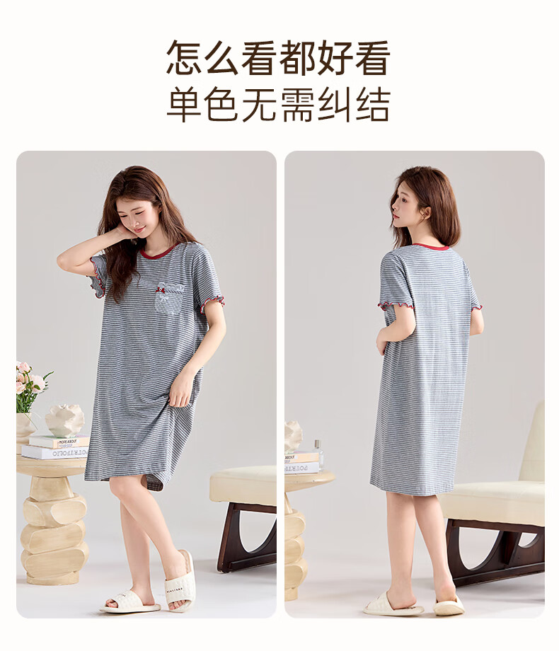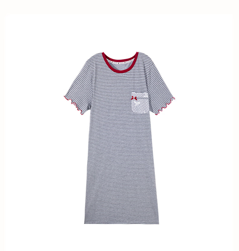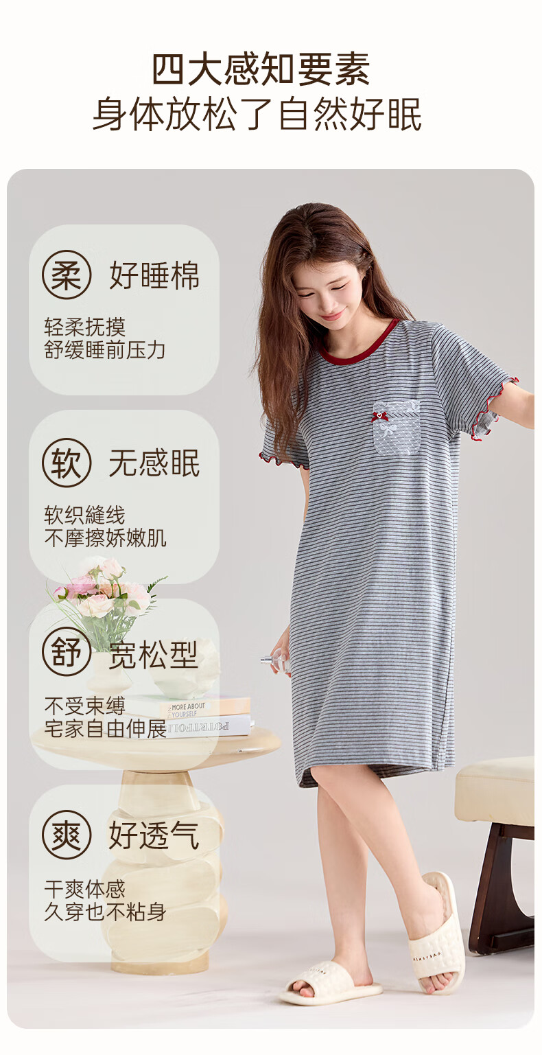 玛伦萨纯棉短袖睡裙女2025新款条纹连衣裙大码夏季薄款女士家居服 花灰 L