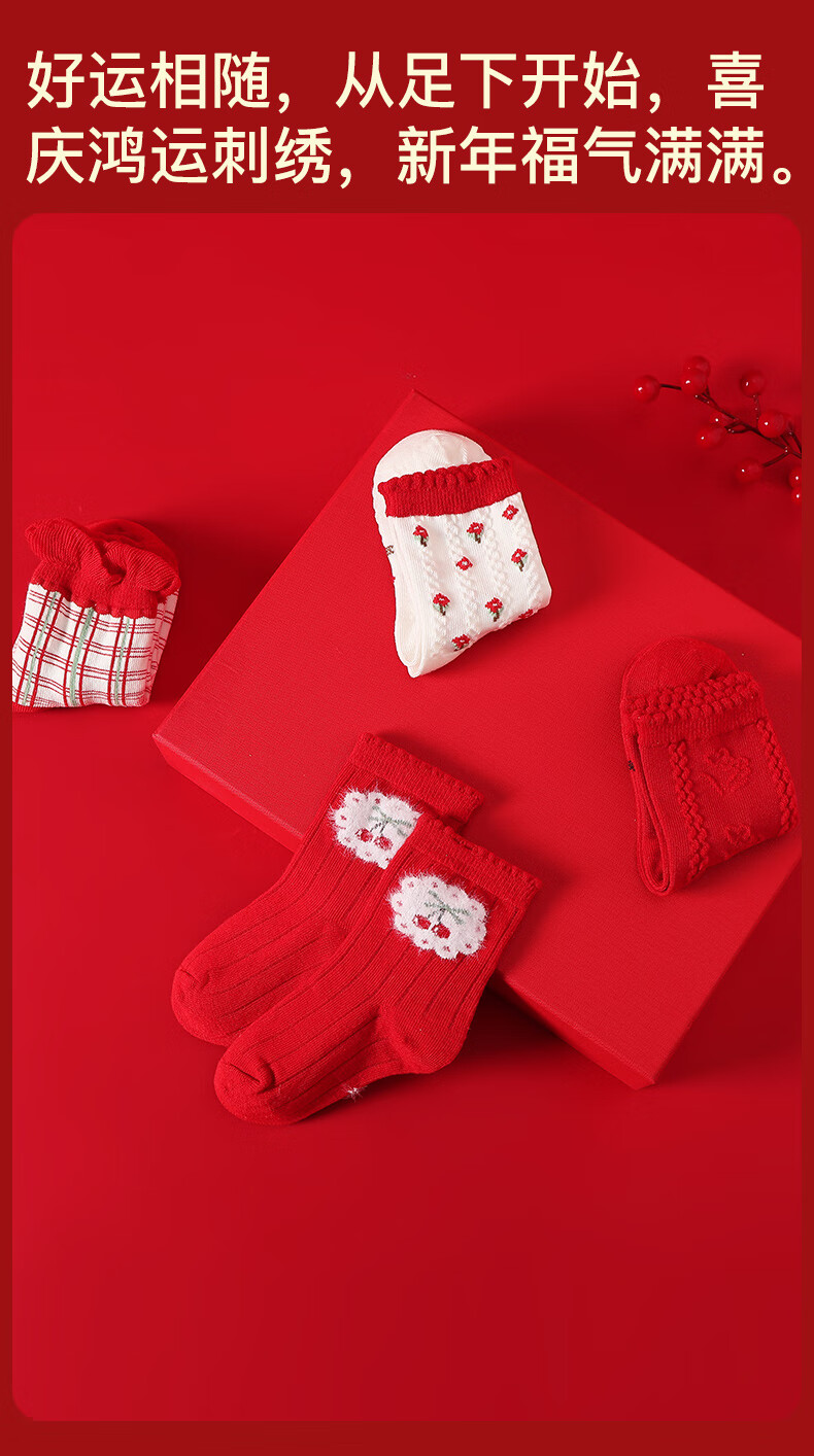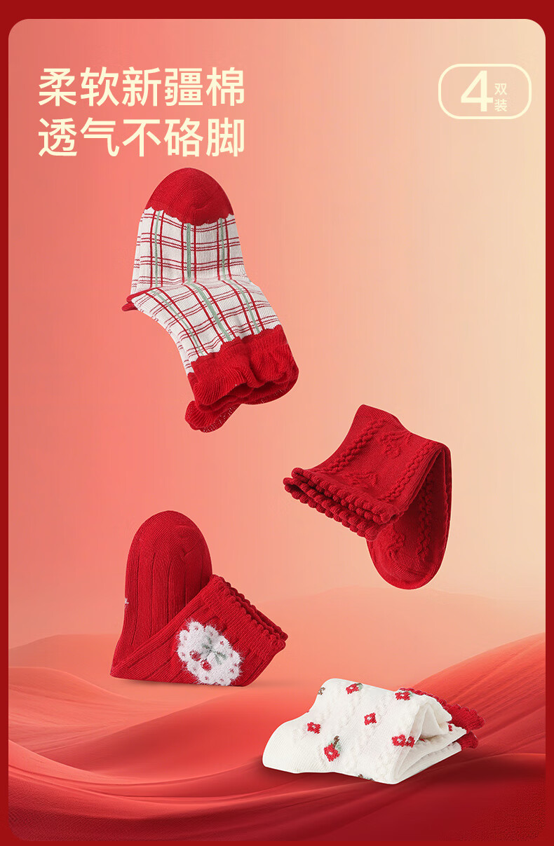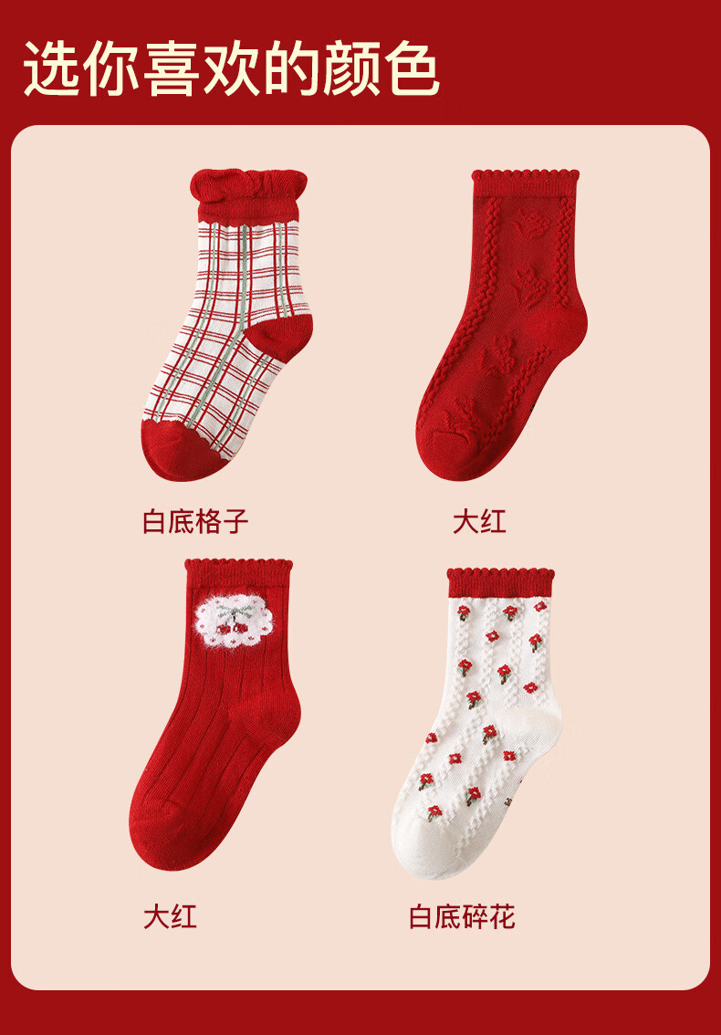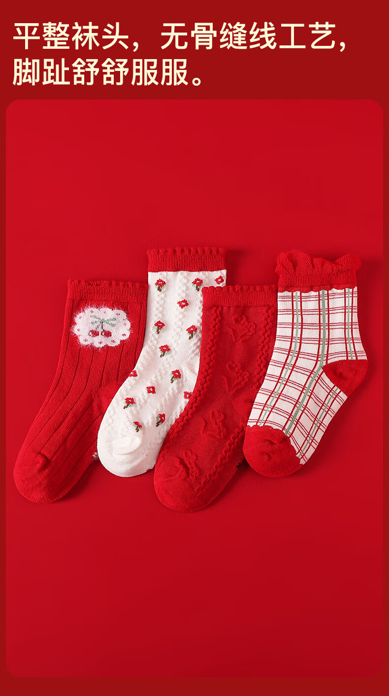芬腾袜子男童新疆棉2025新款4双装本命年女童柔软透气红品中筒袜新年1 白底碎花/大红/大红/白底格子 4双 6-8岁 (L)
