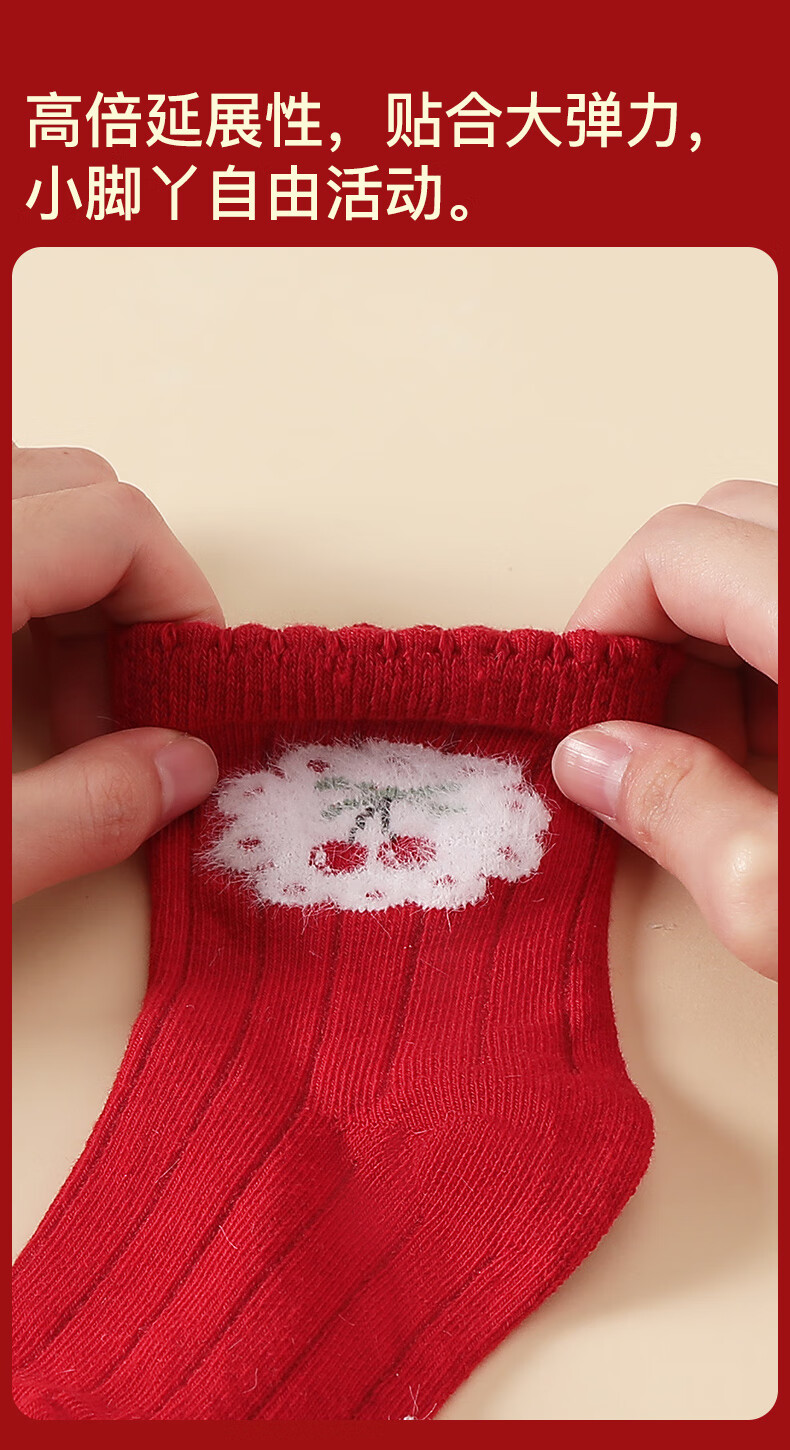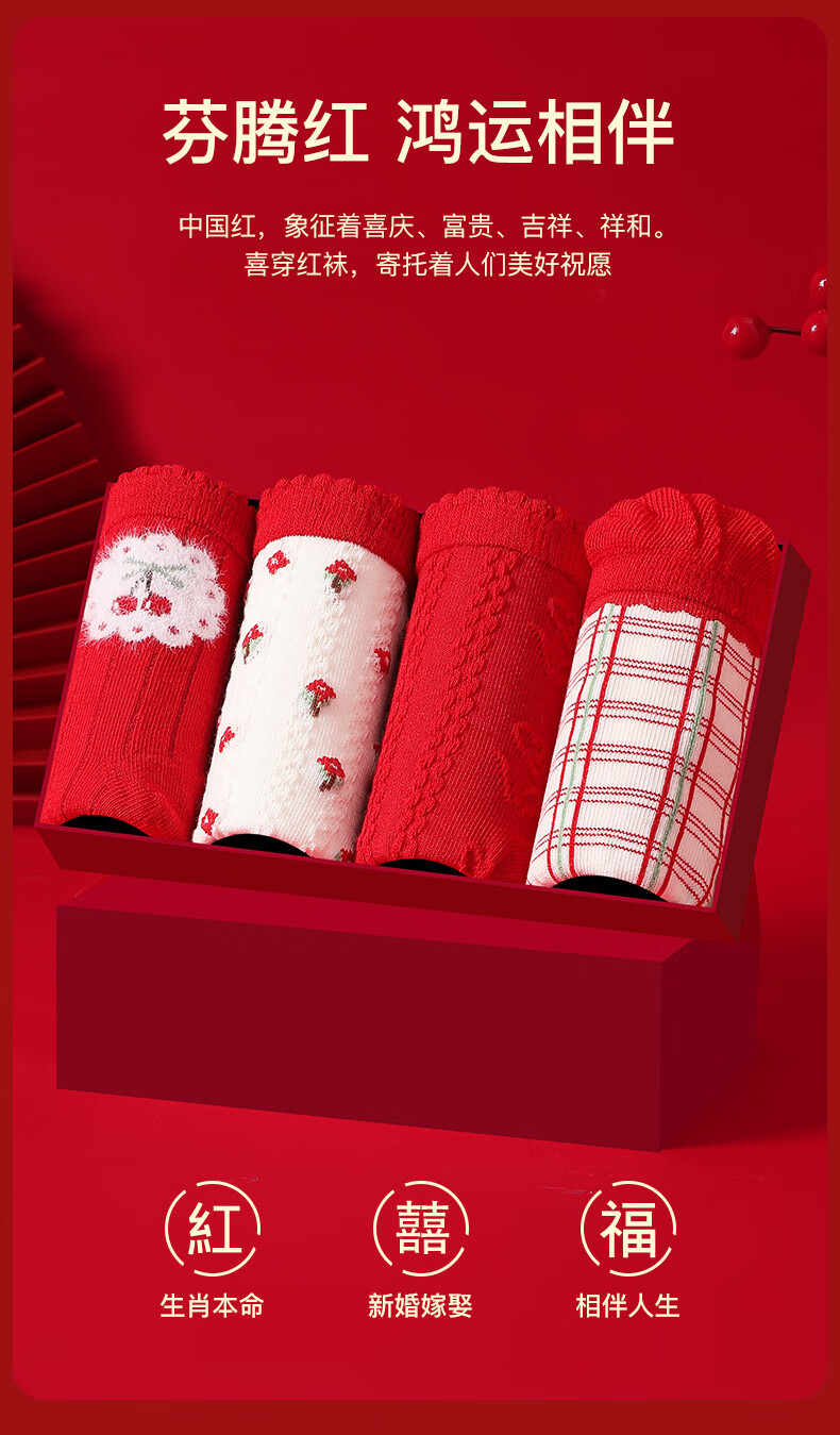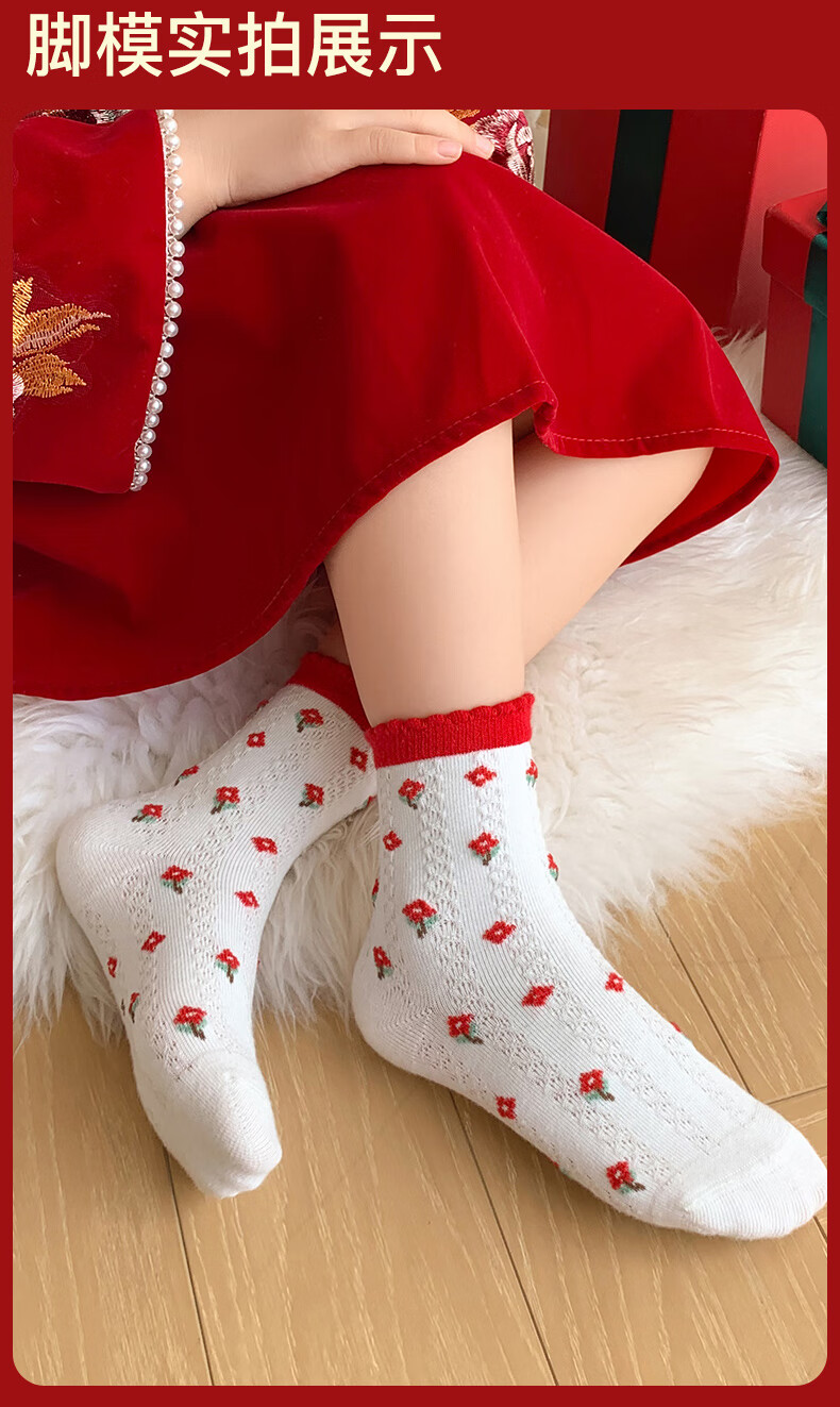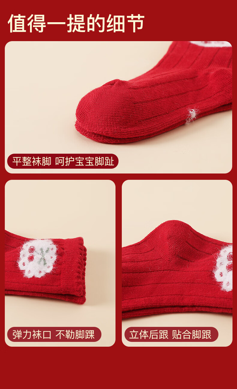 芬腾袜子男童新疆棉2025新款4双装本命年女童柔软透气红品中筒袜新年1 白底碎花/大红/大红/白底格子 4双 6-8岁 (L)