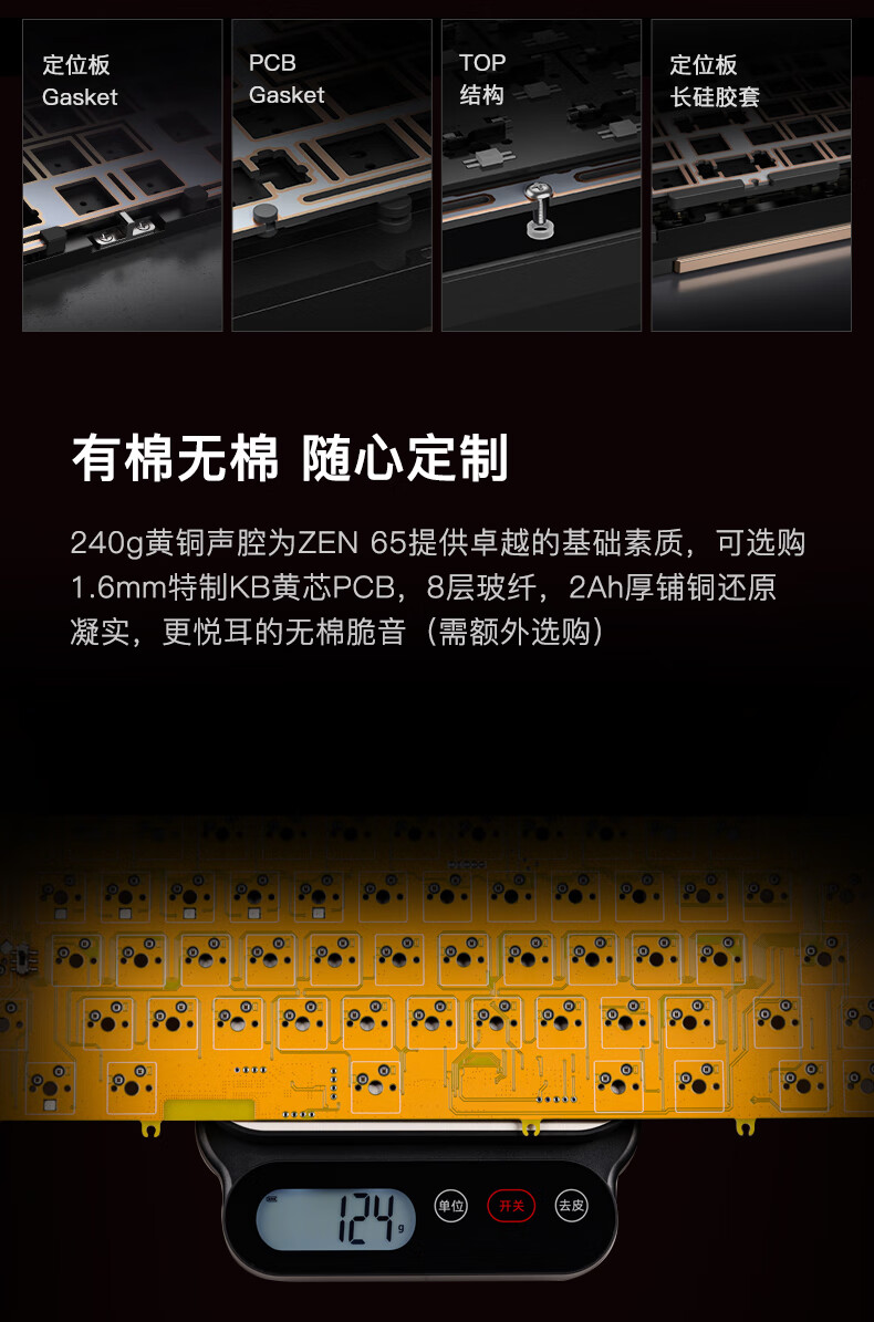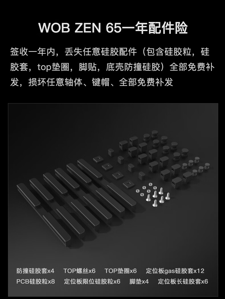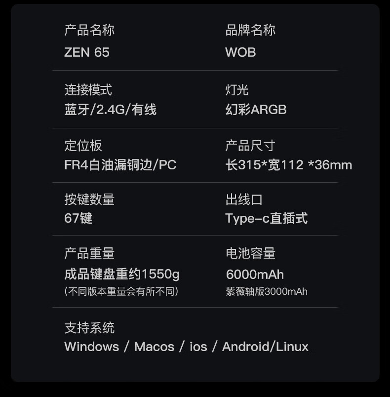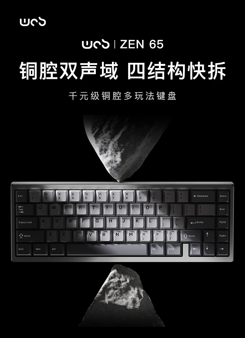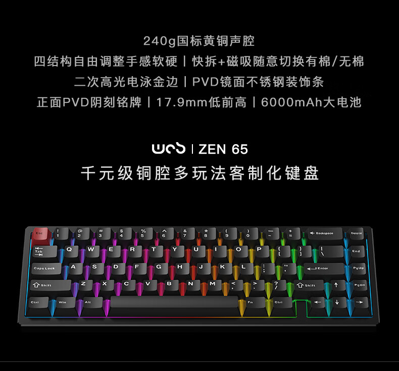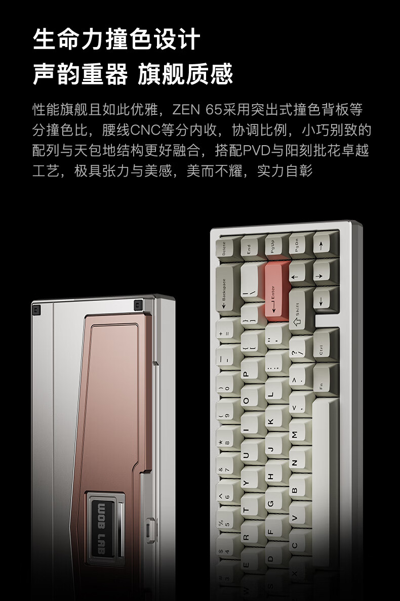 WOB ZEN65客制化机械键盘快拆铜腔铝坨坨有线2.4g蓝牙gasket四种结构top三模电竞游戏办公外设热插拔 闪电黑(雪顶可可轴-ARGB)FR4定|220目
