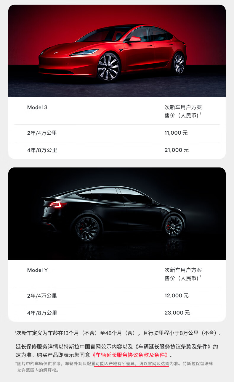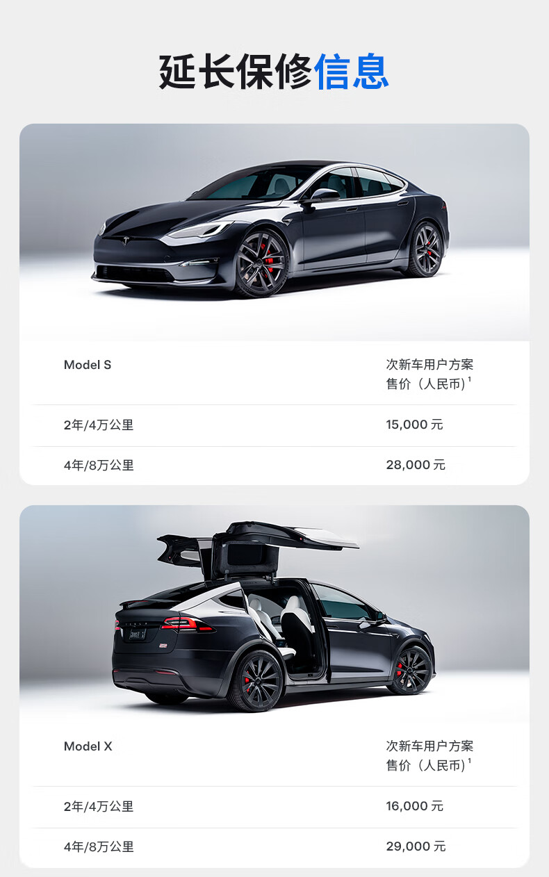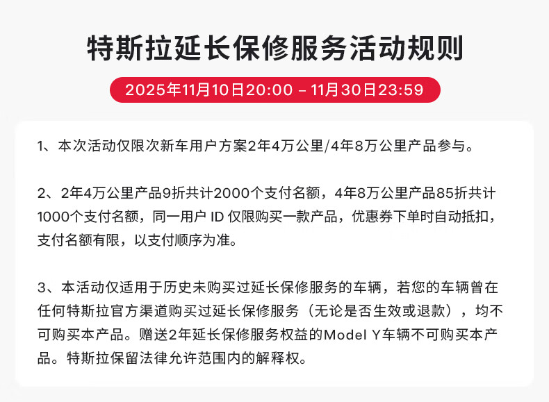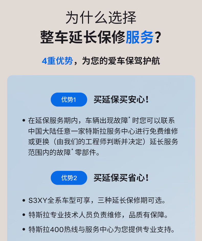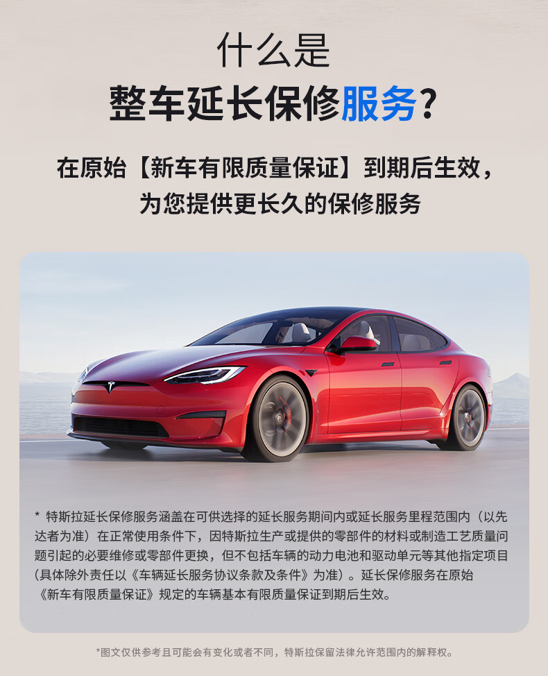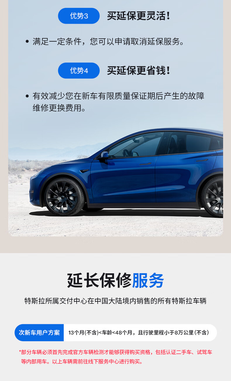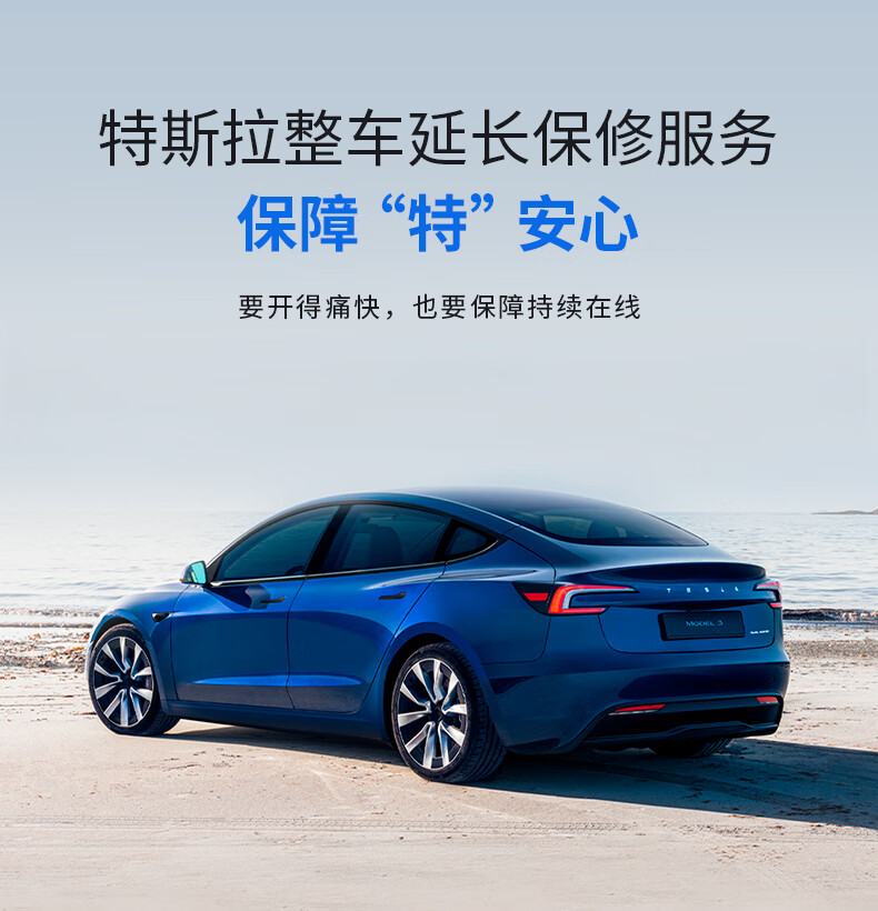 特斯拉(Tesla)整车延保延长保修服务适用于Model3/Y/S/X Model Y 4 年/8 万公里-次新车用户方案