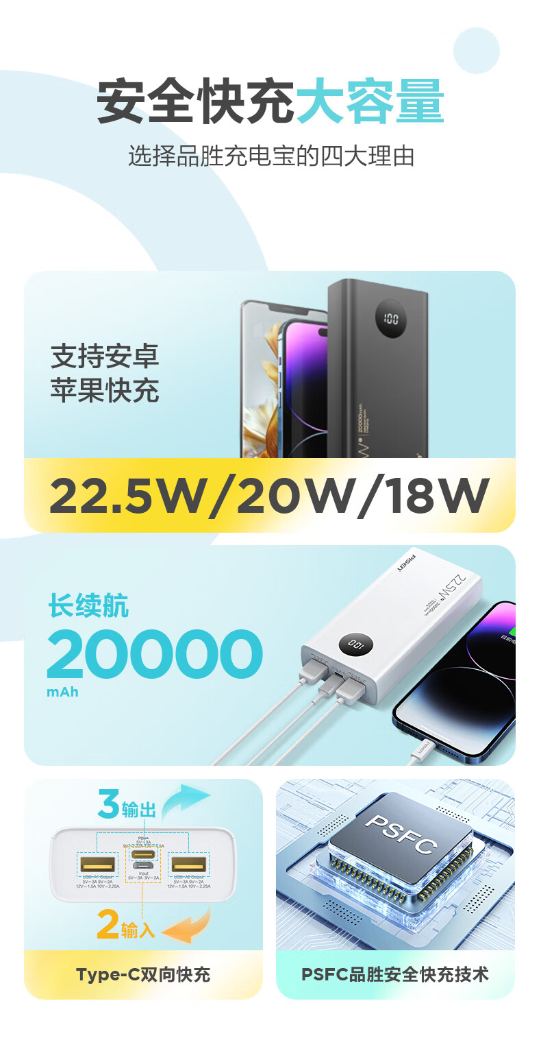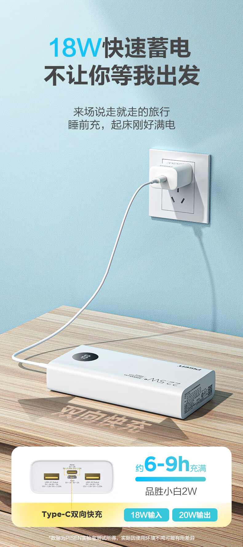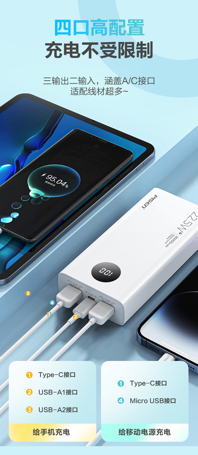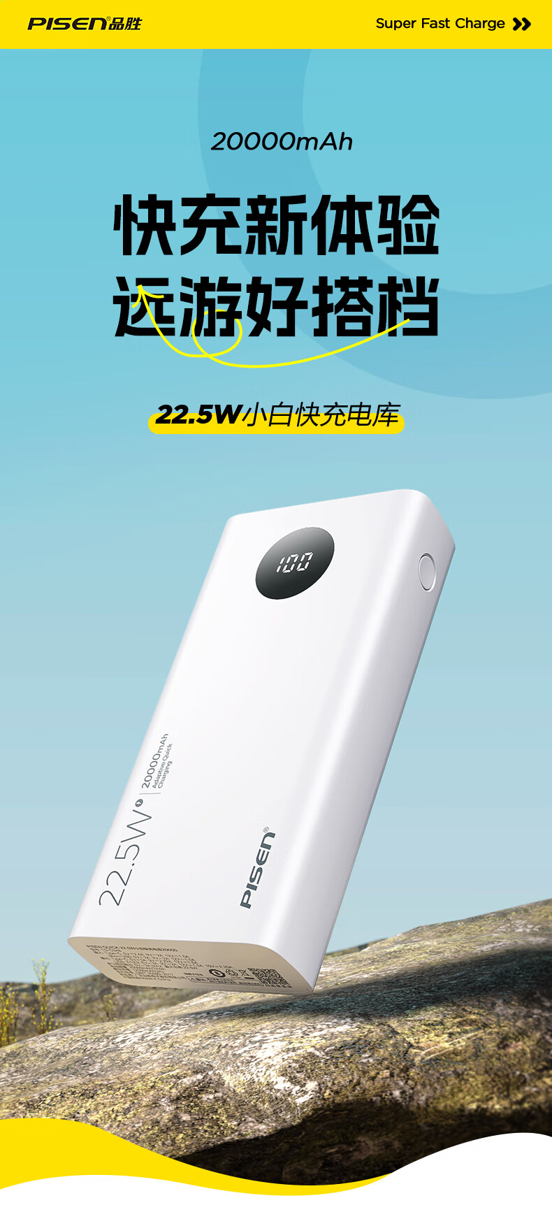 品胜(PISEN)3C认证充电宝 可上飞机 超级快充22.5W圆屏数显2万毫安大容量充电宝移动电源苹果17华为小米安卓 云初白【2万毫安圆屏数显22.5W】