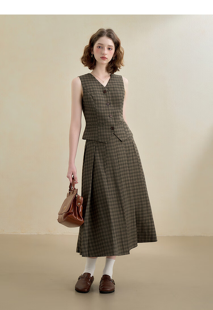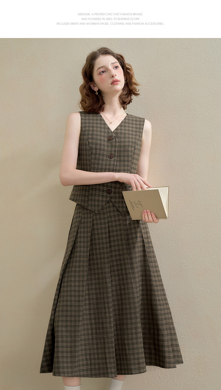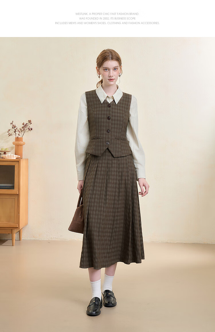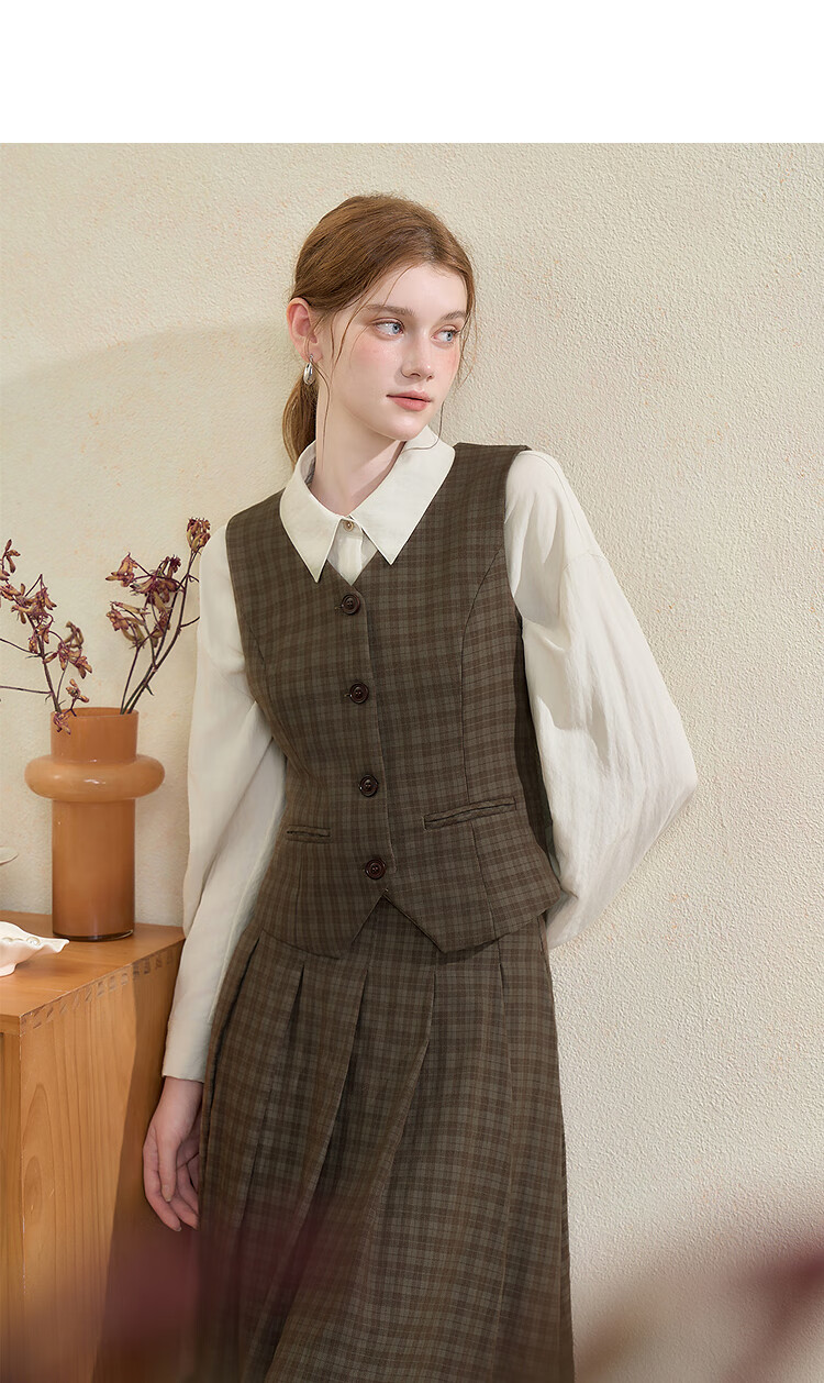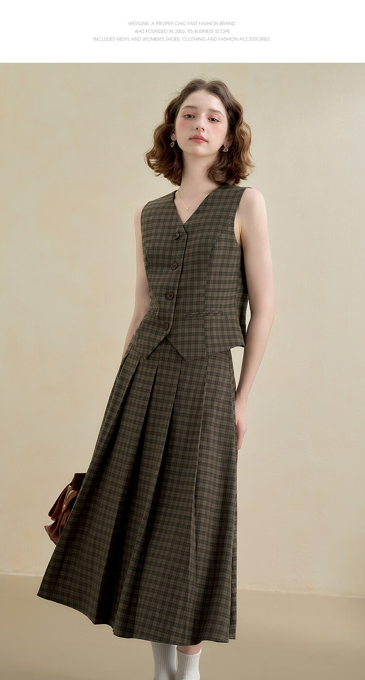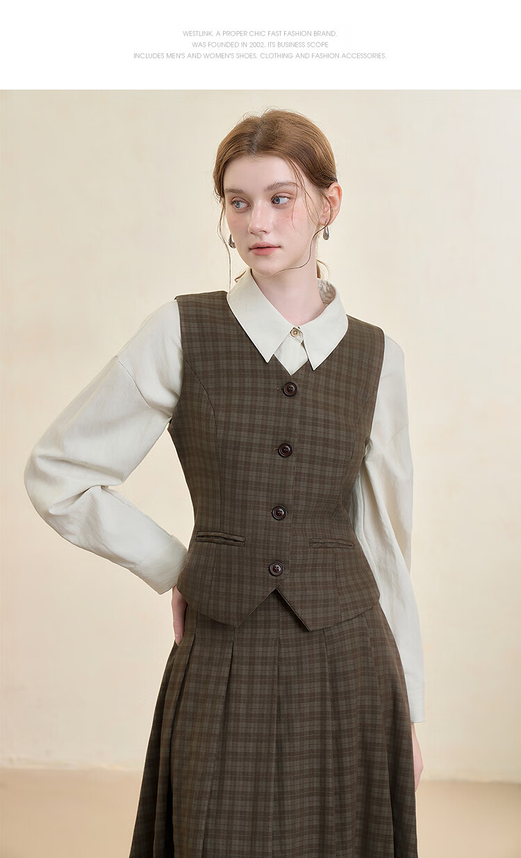 西遇复古高智感格纹通勤套装女2025秋季西装马甲搭半身裙两件套 咖色 XL (170)