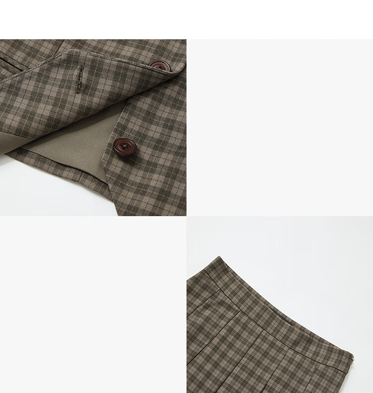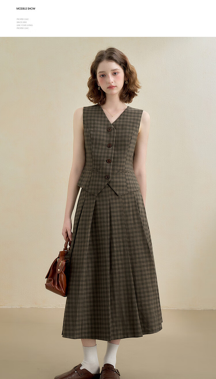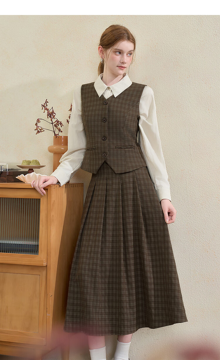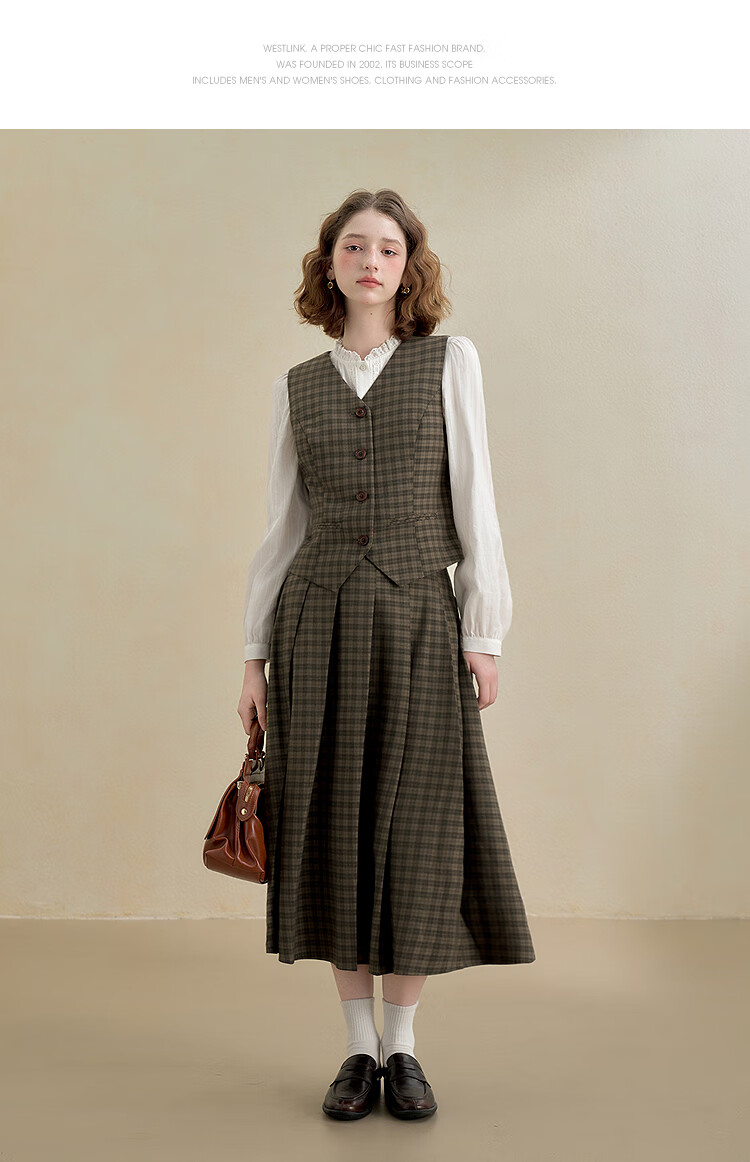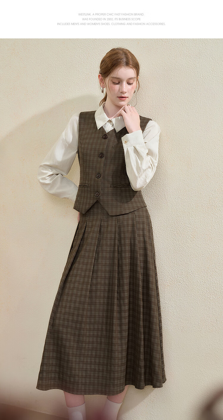 西遇复古高智感格纹通勤套装女2025秋季西装马甲搭半身裙两件套 咖色 XL (170)