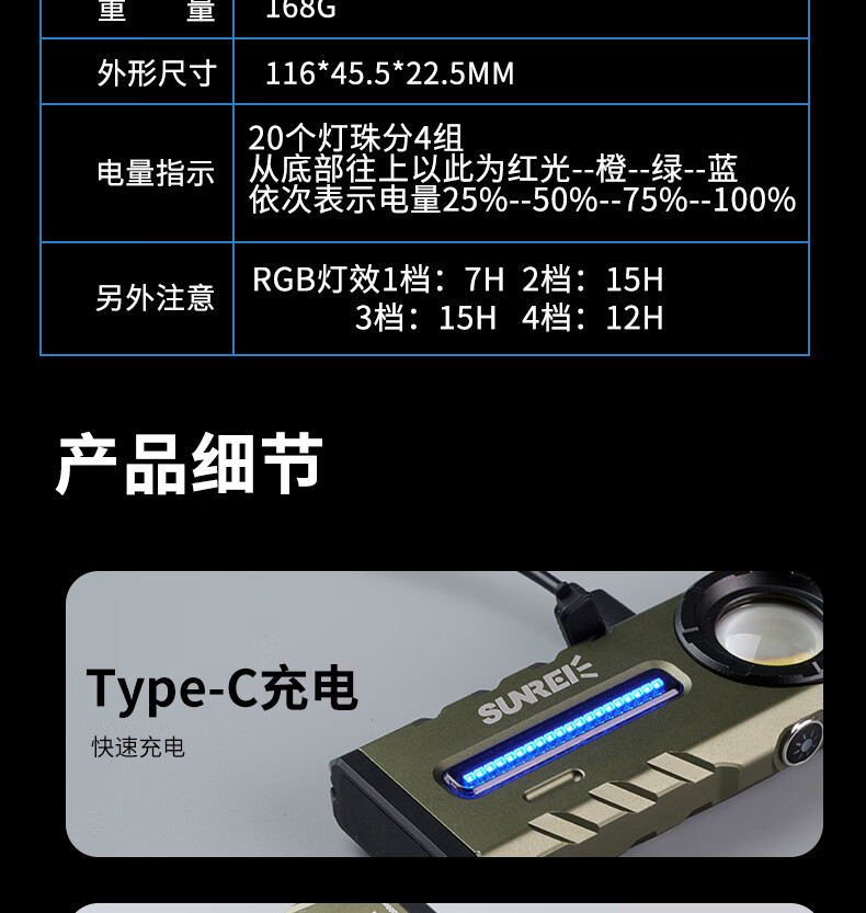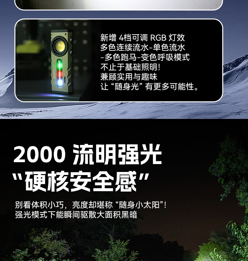 山力士多功能便携超长续航大容量强光手电筒应急爆闪聚光泛光自驾野营 灰色(聚光+泛光+RGB)