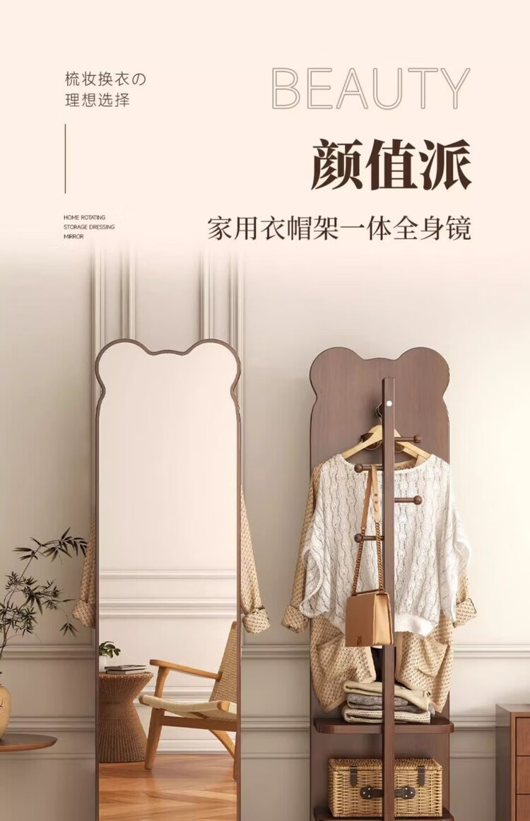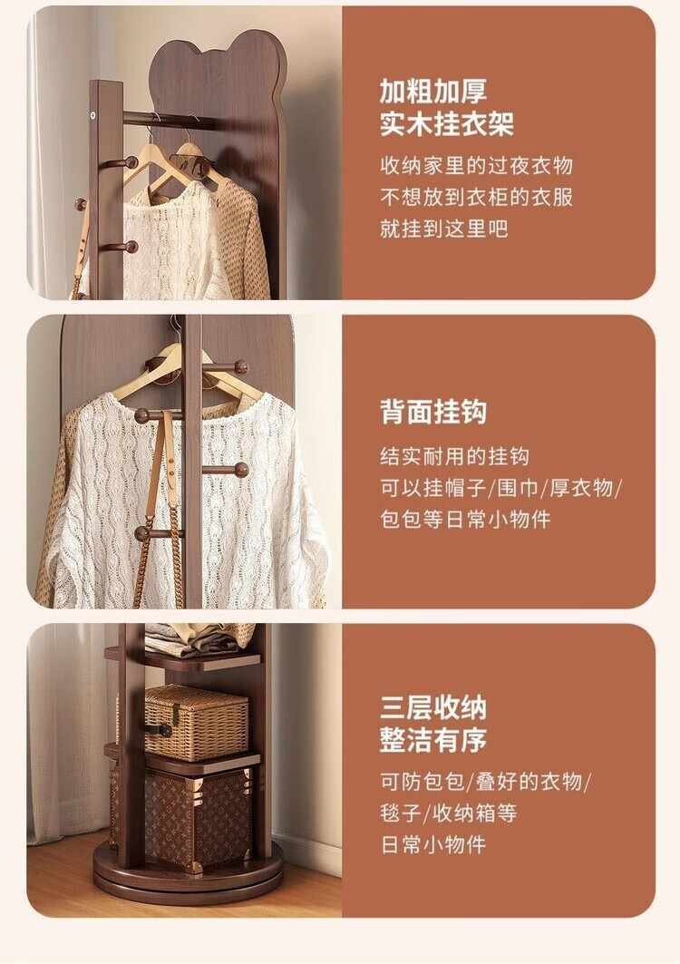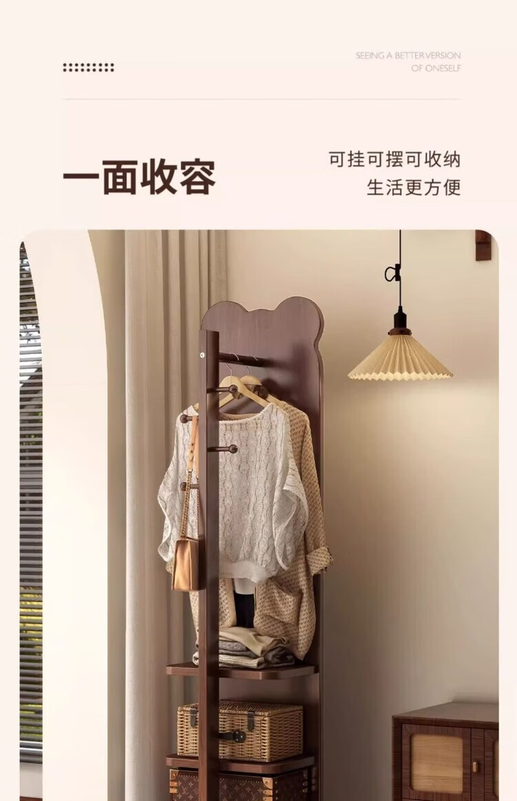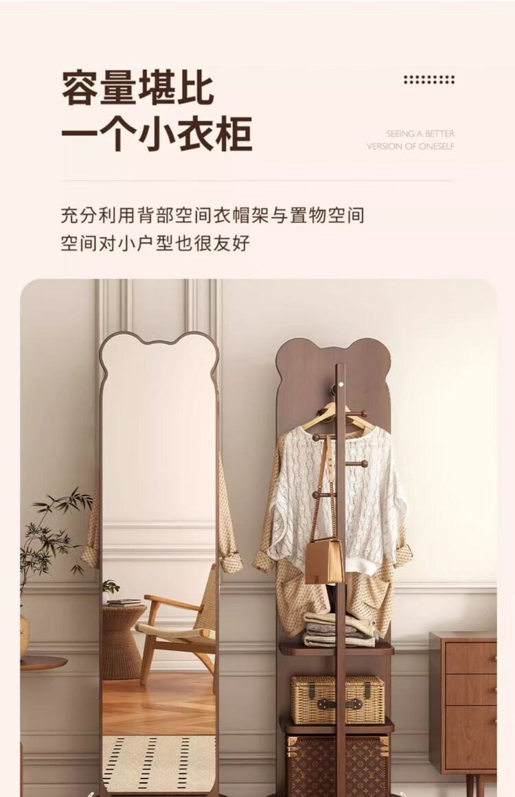 弘星隆小熊旋转镜全身镜落地镜家用穿衣镜旋转挂衣帽架一体式试衣镜子 【胡桃棕】 中号【40*168】旋转储物挂衣