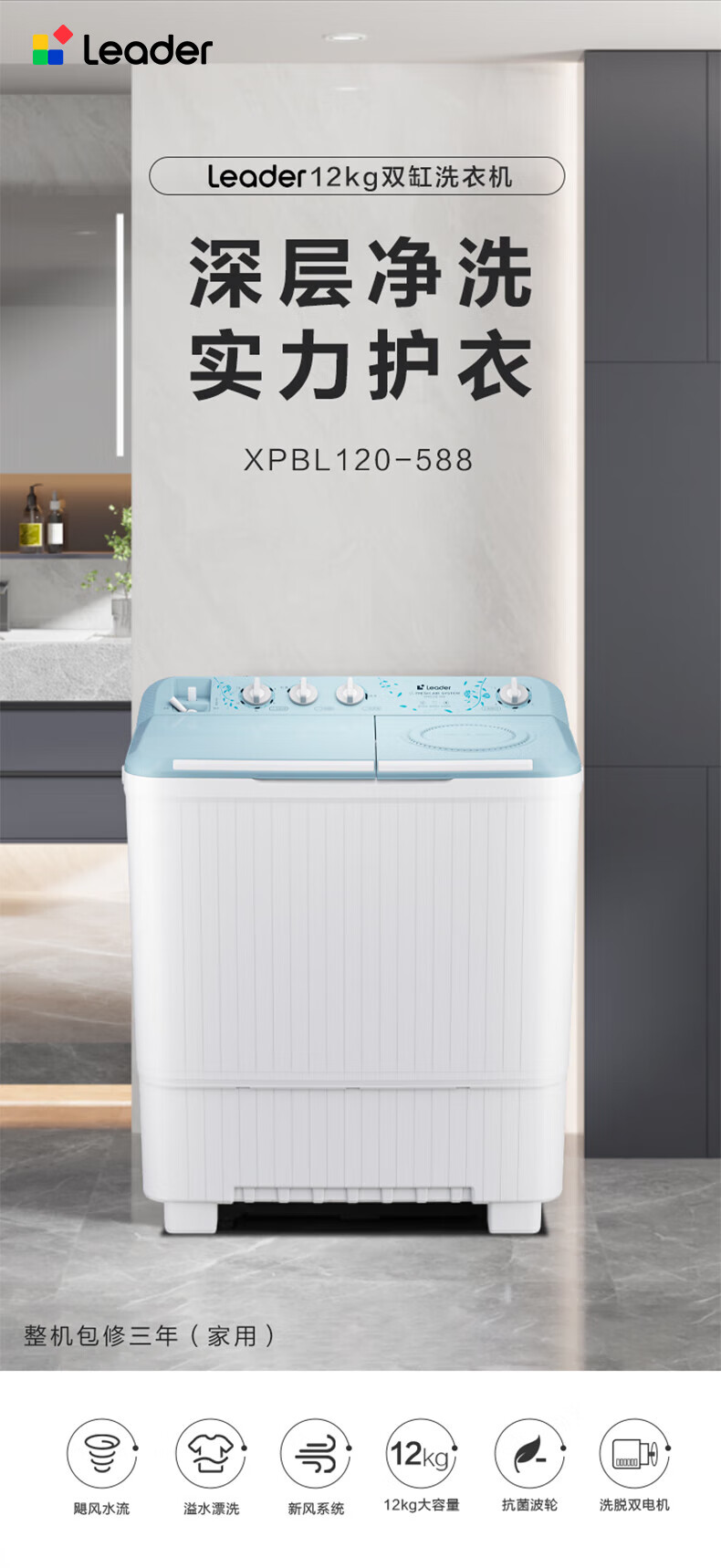 统帅(Leader)海尔智家 半自动双桶洗衣机12公斤大容量 一级能效 以旧换新 家电国家补贴 XPBL120-588
