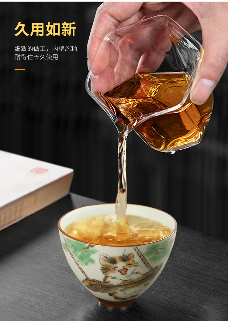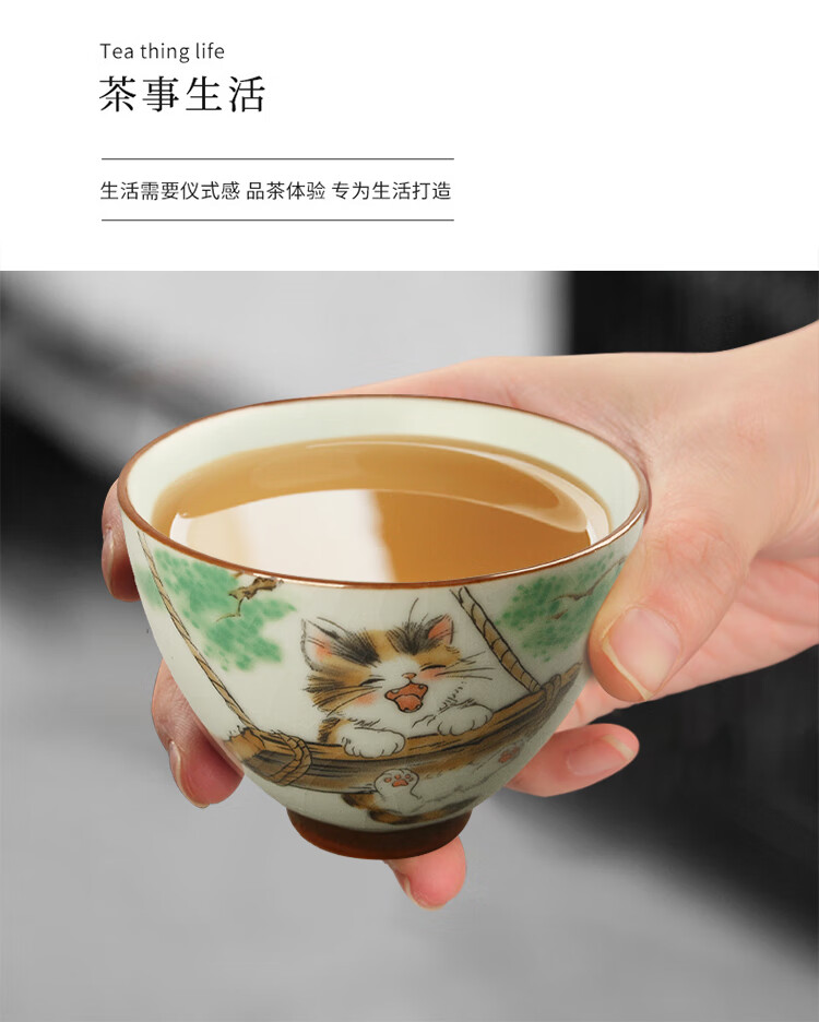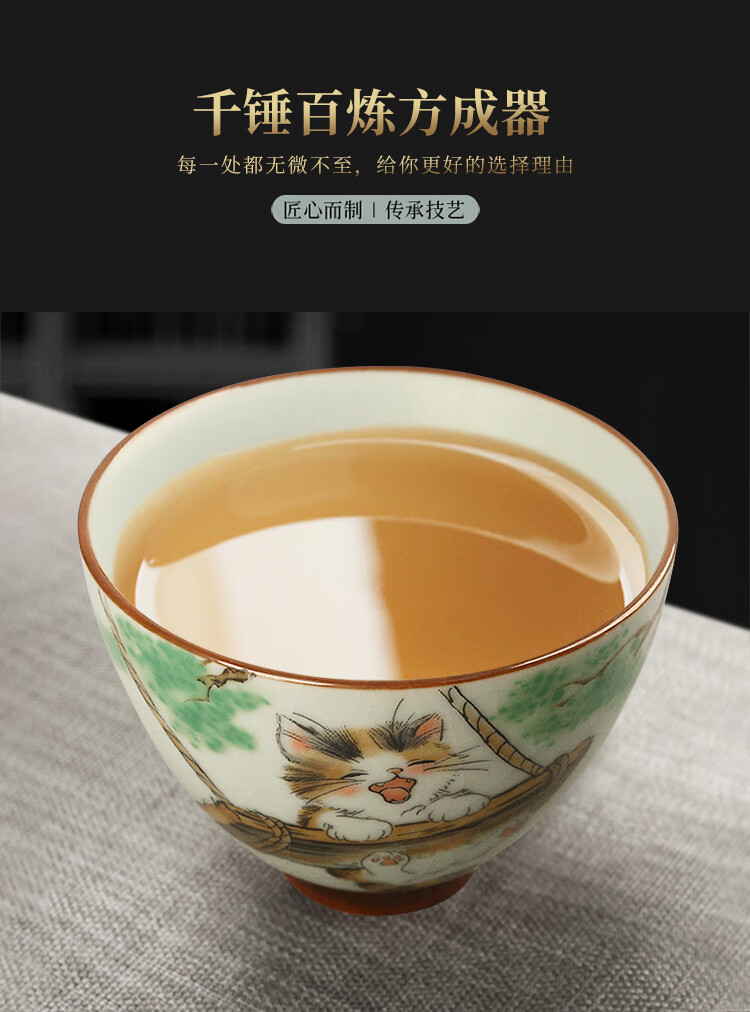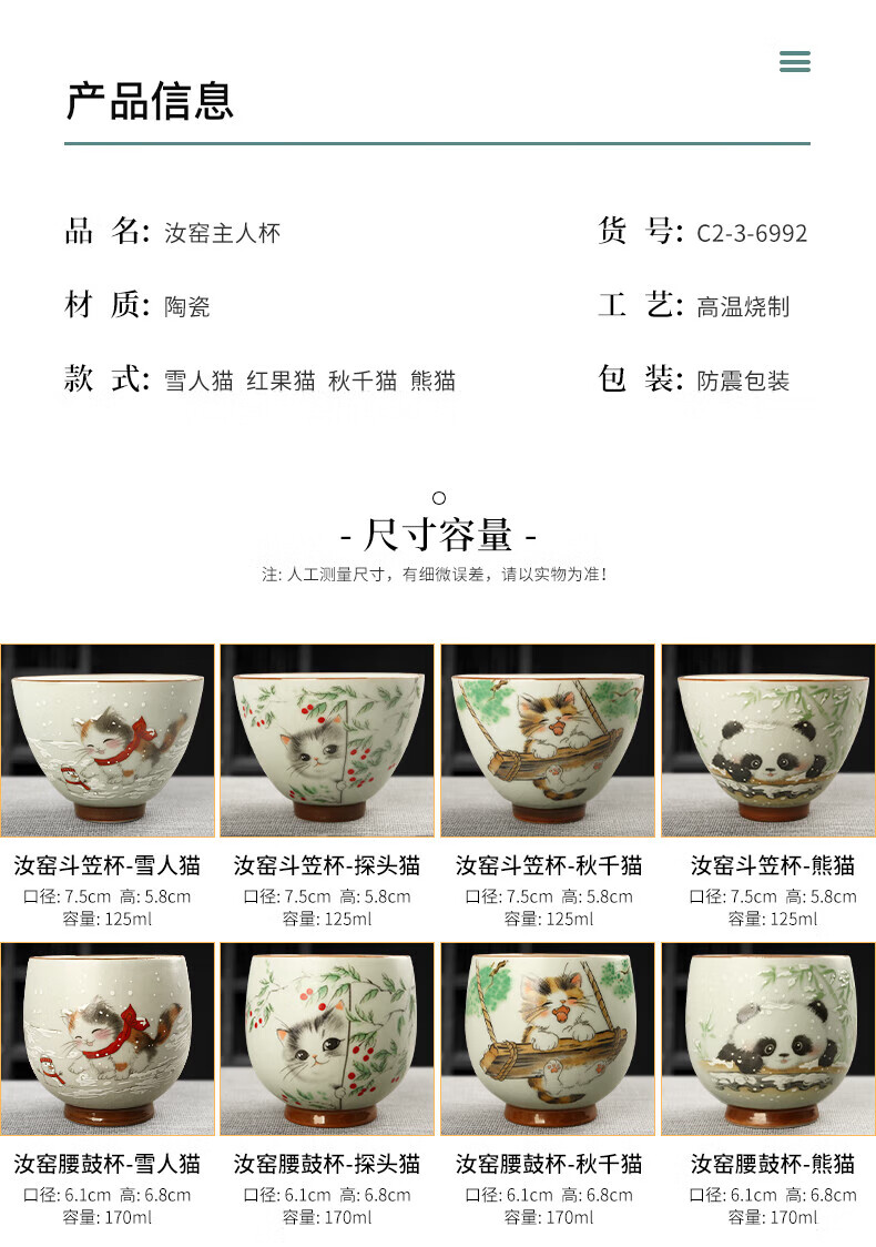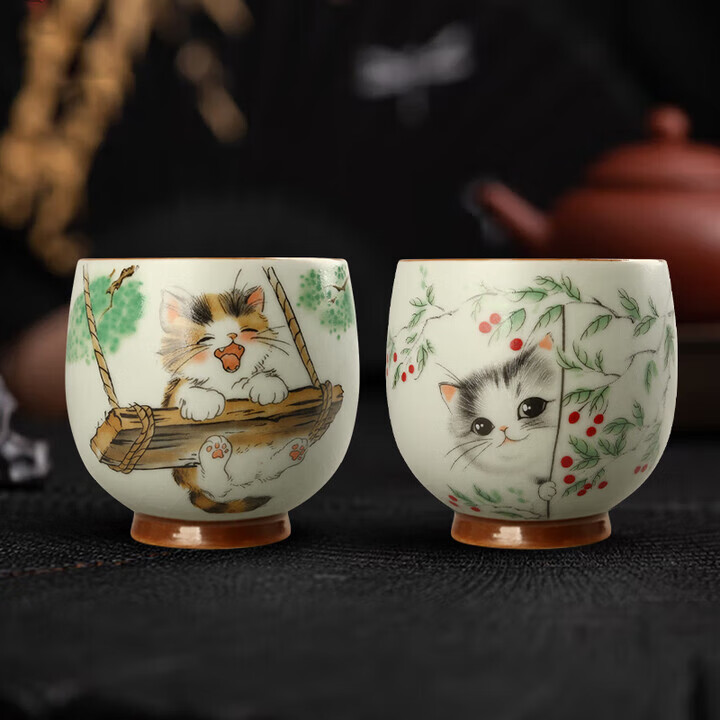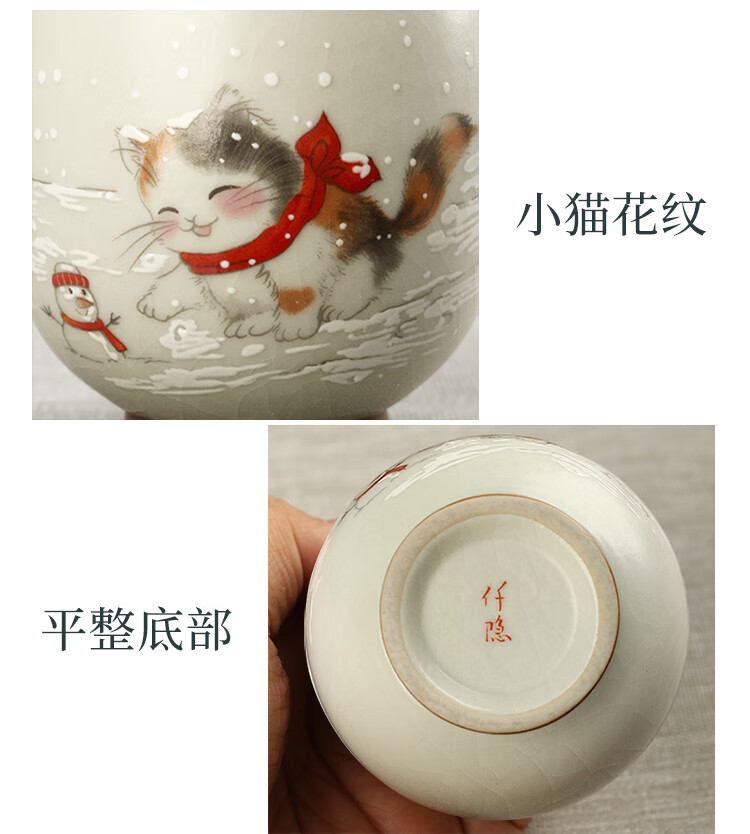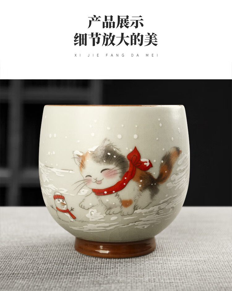 陶立方开片汝窑猫咪对杯品茗杯陶瓷杯主人杯家用对盏套装功夫茶具茶盏 腰鼓杯-熊猫+雪人猫