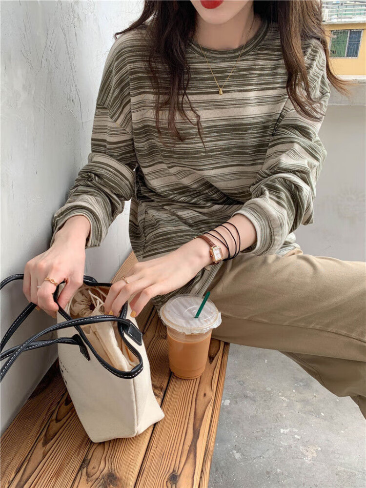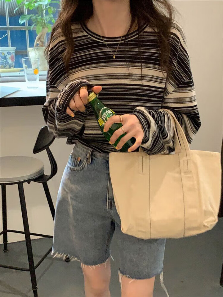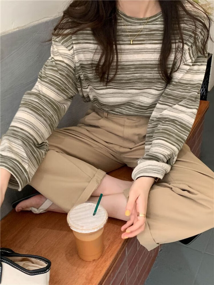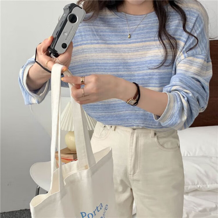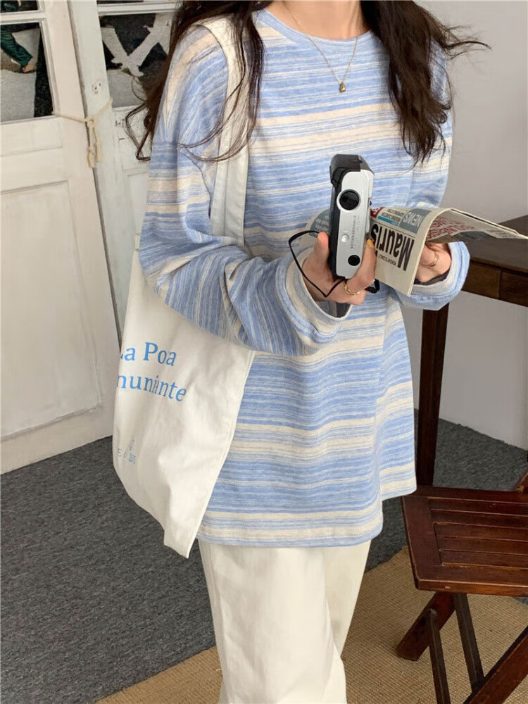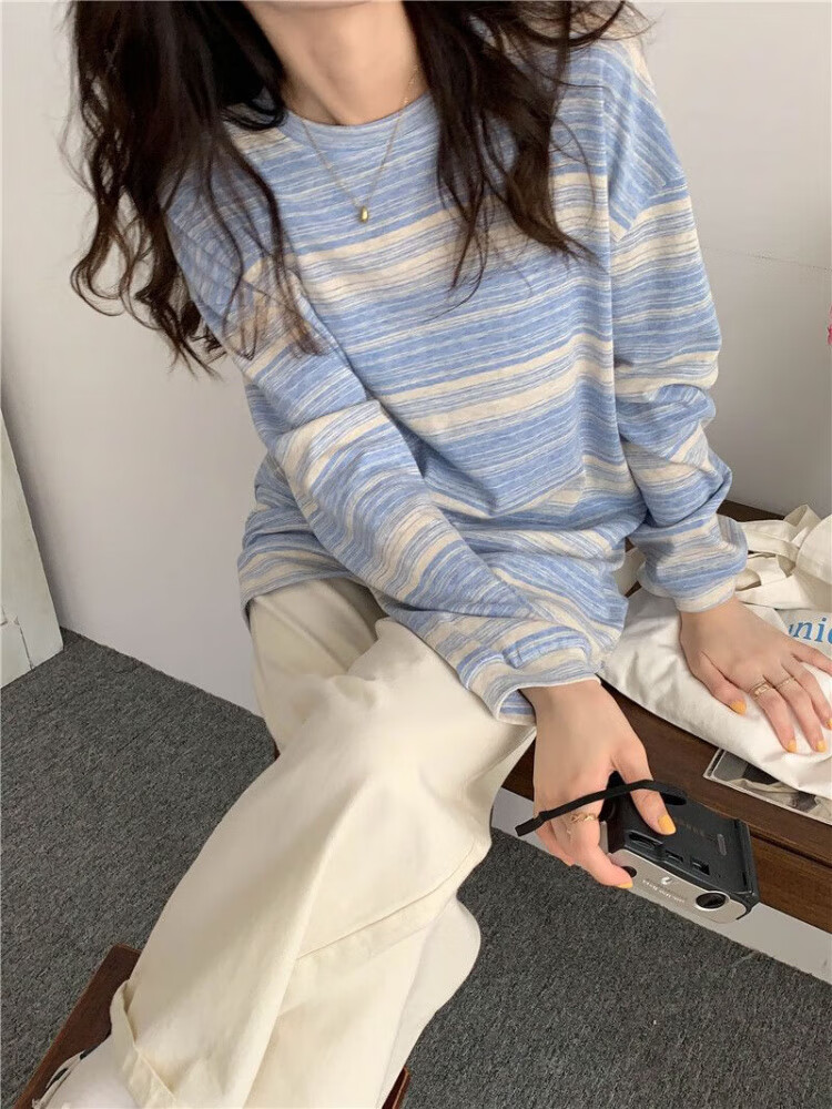 朵貌条纹圆领长袖T恤女装春秋季2025新款设计感宽松学生上衣服女ins潮 蓝色 M