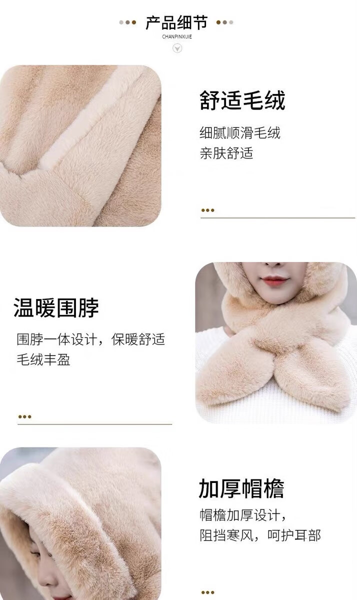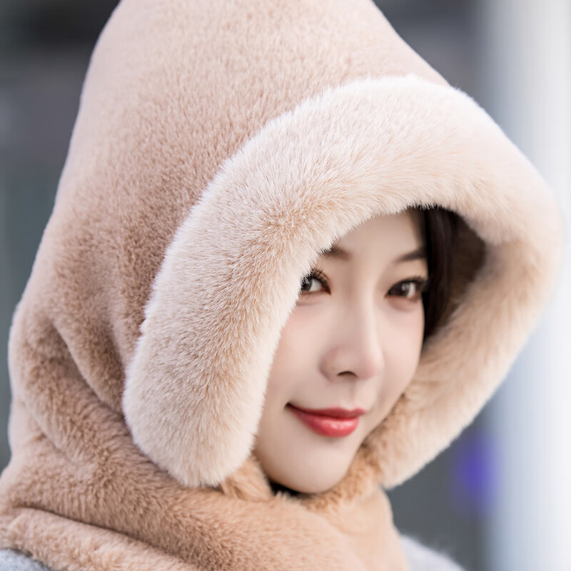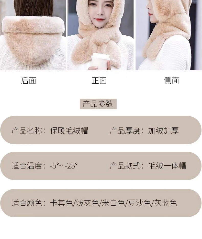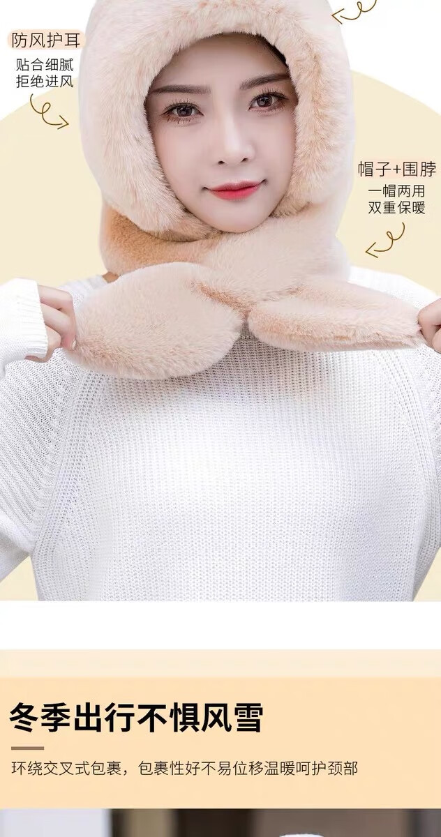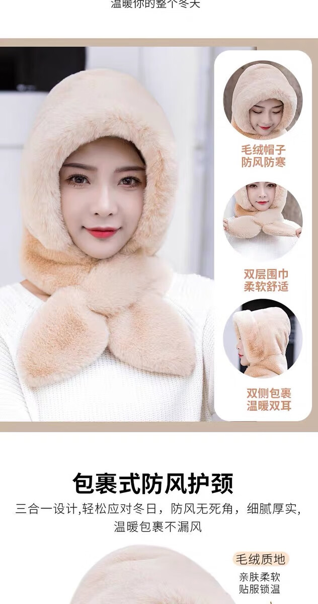 新款帽子女冬季防风防寒加绒加厚保暖包头护耳护颈骑车帽子围巾帽 卡其色