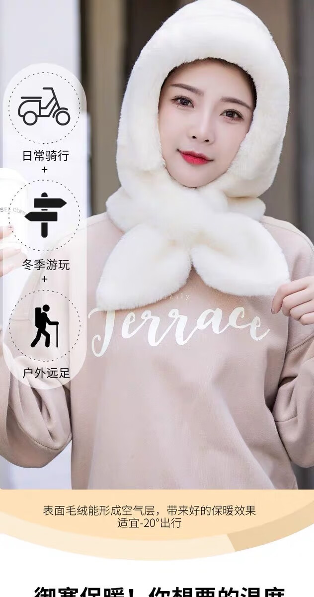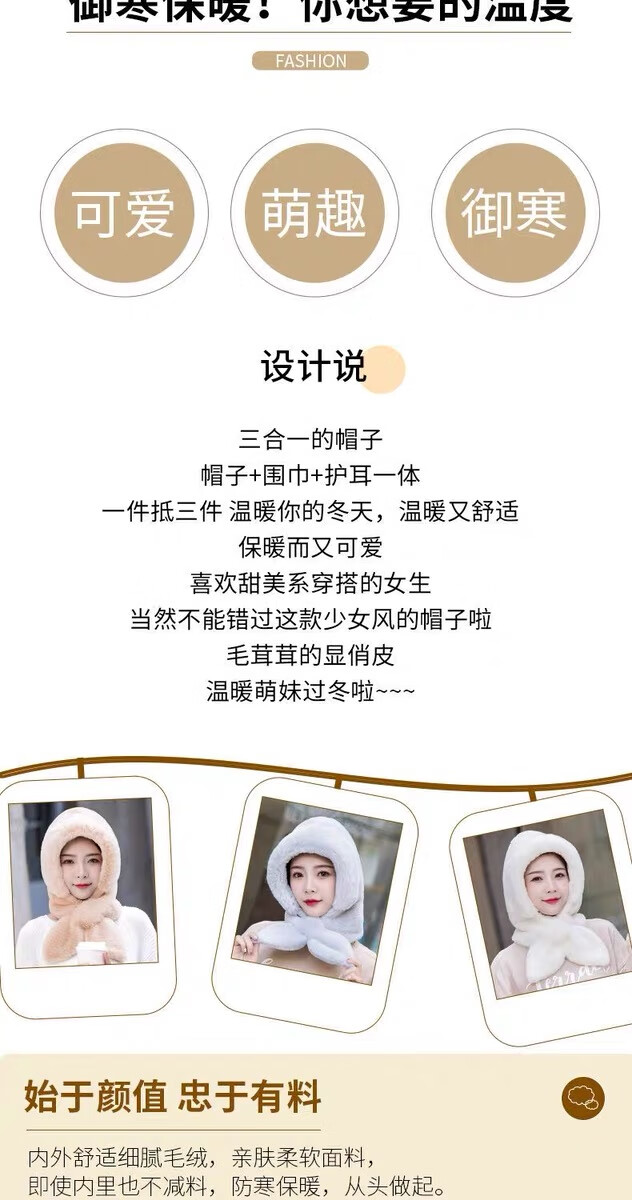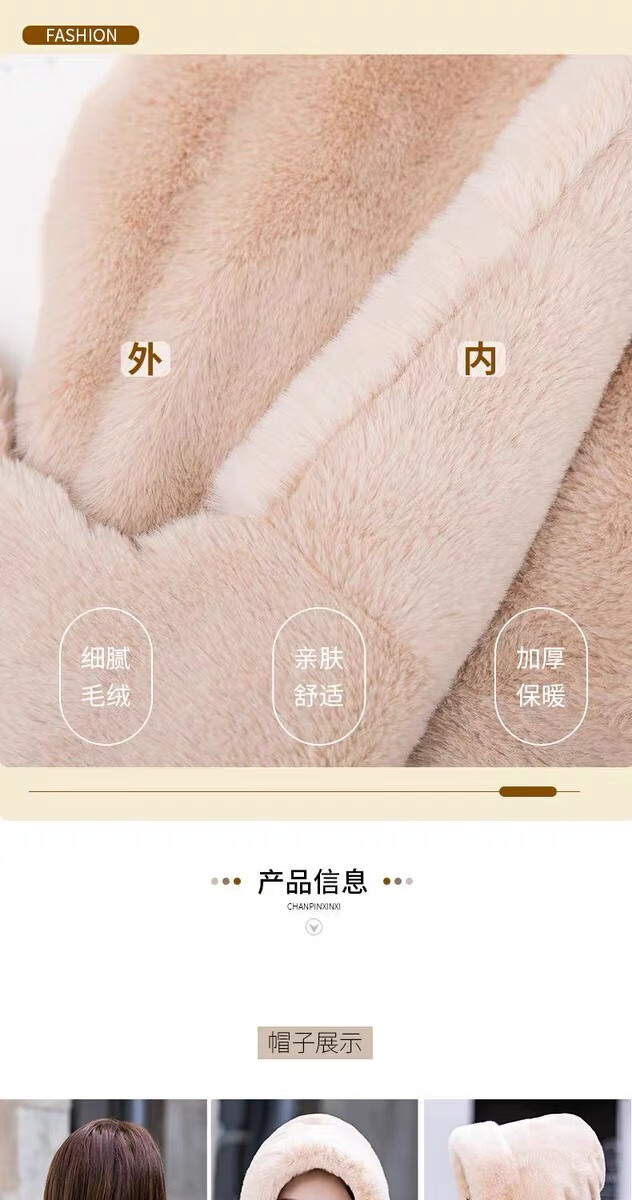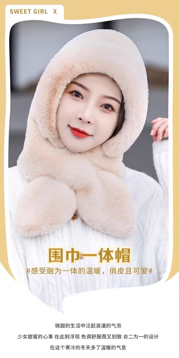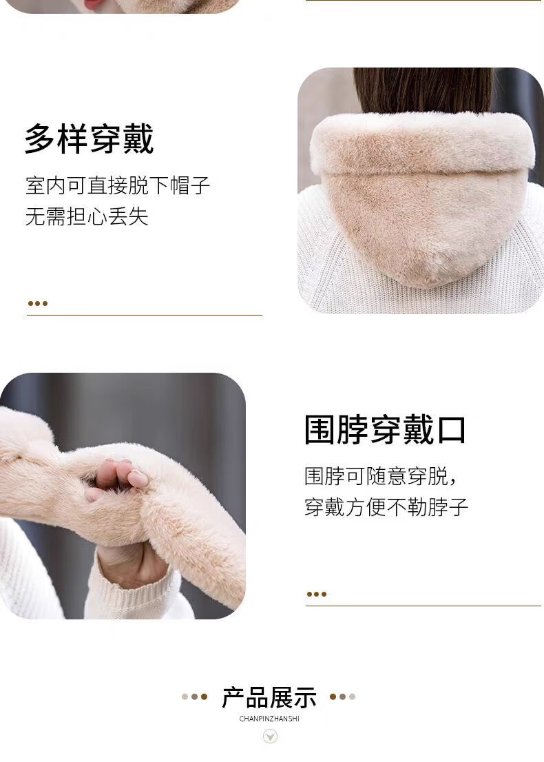 新款帽子女冬季防风防寒加绒加厚保暖包头护耳护颈骑车帽子围巾帽 卡其色