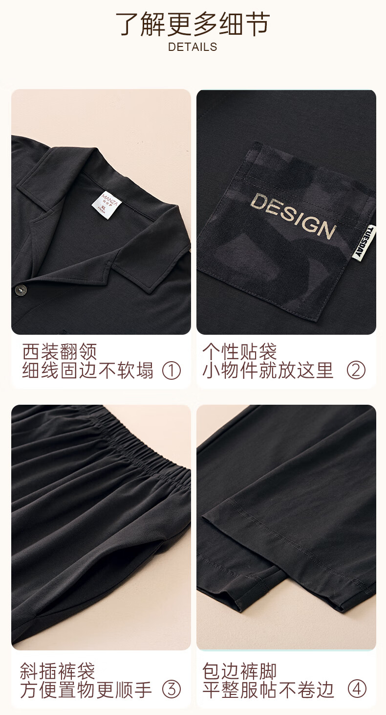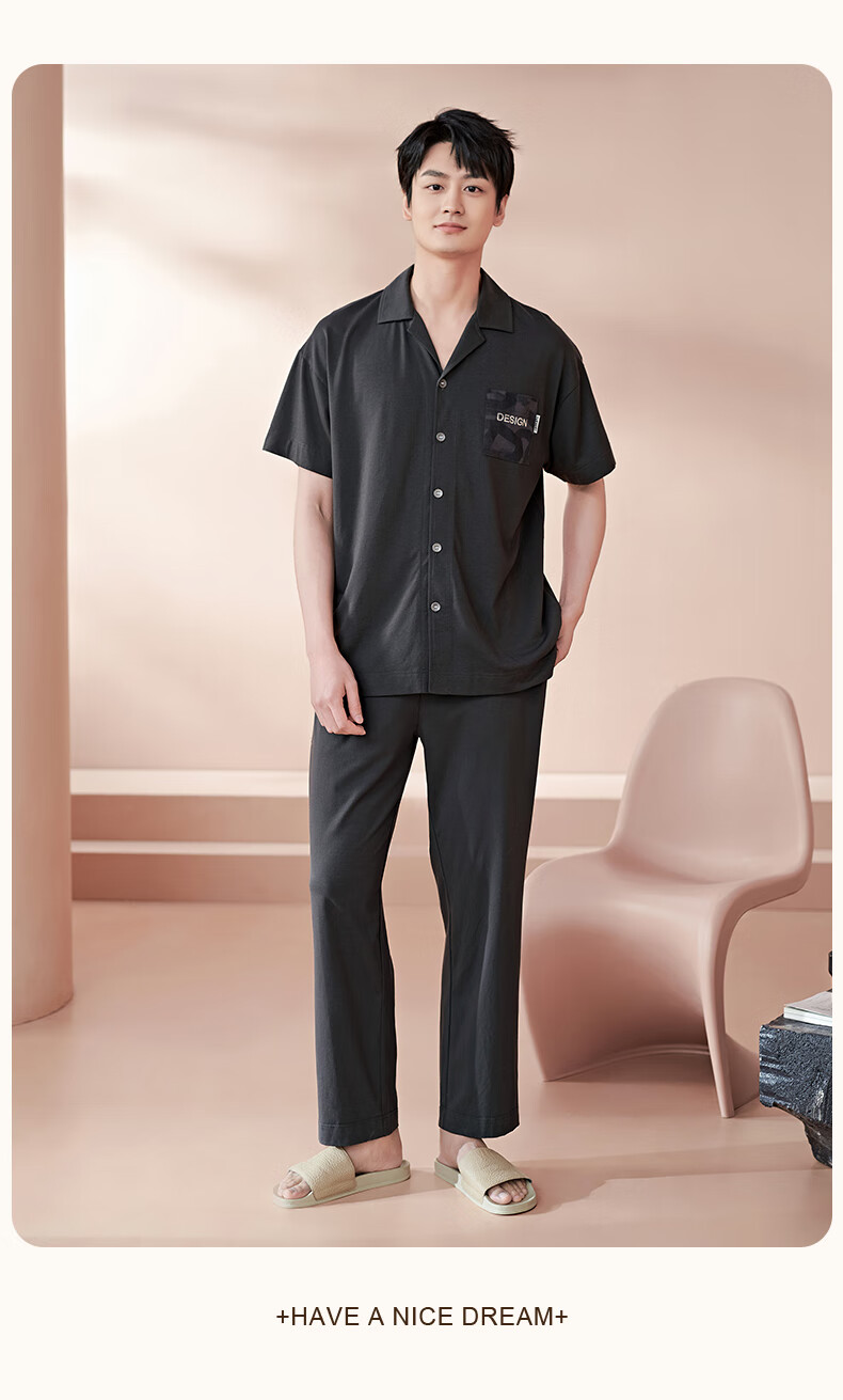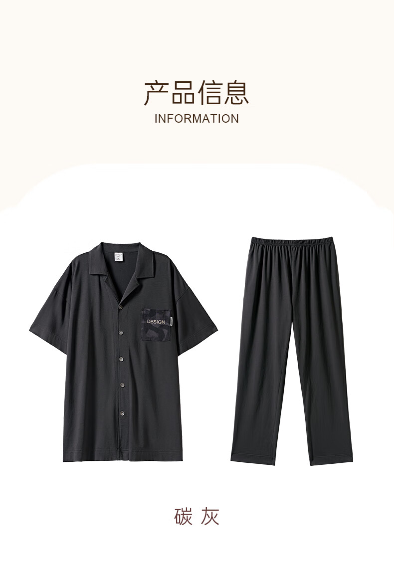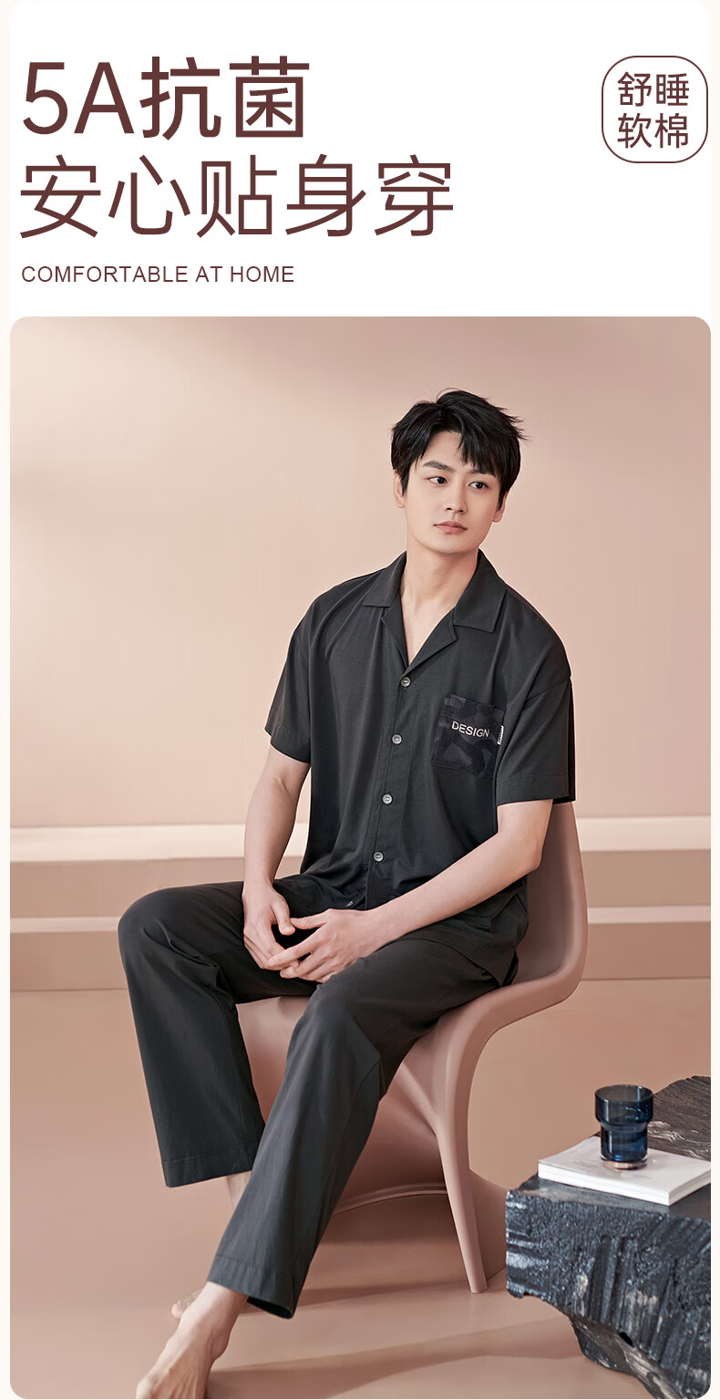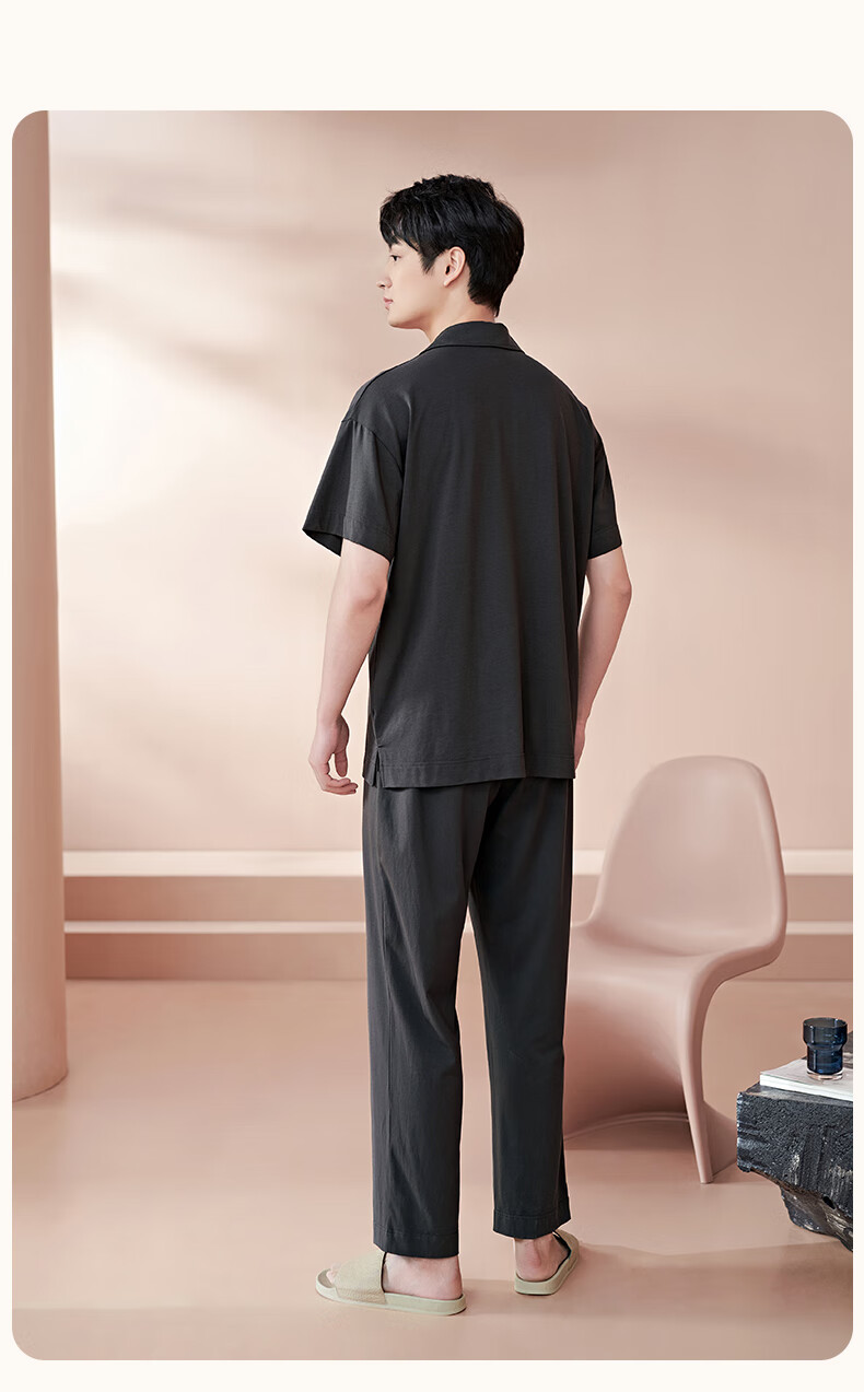 玛伦萨【5A抗菌】睡衣男纯棉夏季新款纯色短袖长裤男士家居服套装 碳灰 L
