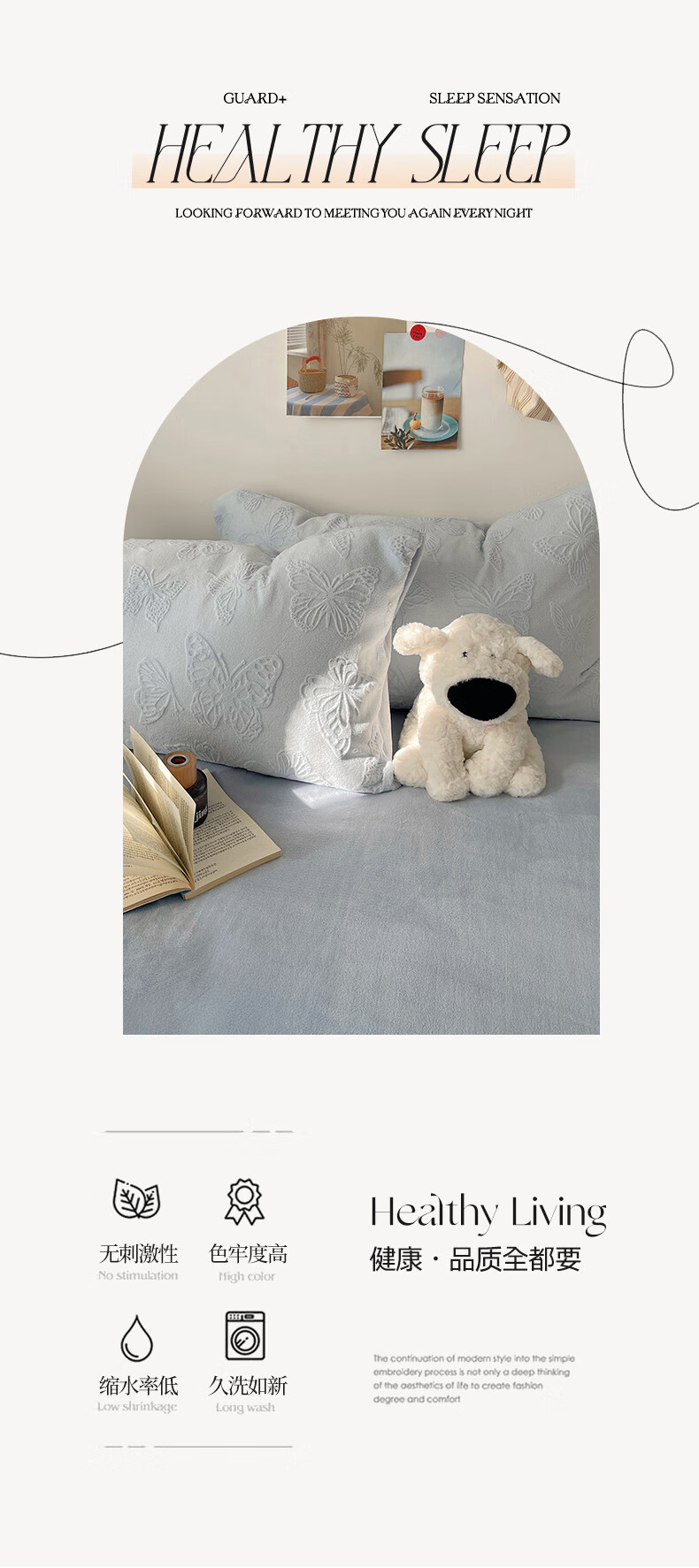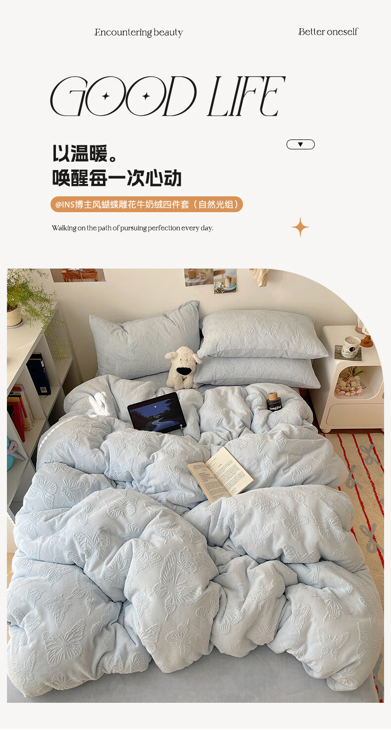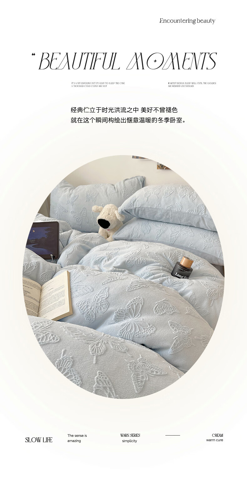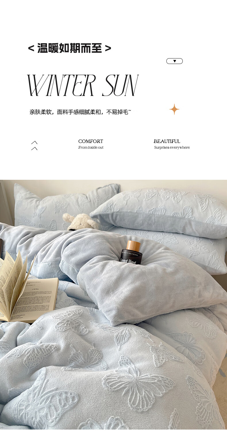 苏萱ins秋冬雕花牛奶绒四件套加厚珊瑚绒被套双面绒床单床笠床上用品4 雕花绒-蝴蝶蓝 1.8m 床单款 四件套-被套200x230cm